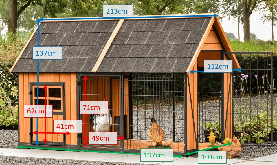 Avec son toit pointu caractéristique, ses trois portes d’accès et son plancher en bois, ce poulailler est non seulement pratique, mais aussi agréable à utiliser. Le grand poulailler fermé offre abri et confort, tandis que le vaste enclos permet aux poules de gratter et de se déplacer librement. Ce poulailler convient pour 9 petites poules, 6 moyennes ou 4 grandes – un habitat idéal pour chaque poule !