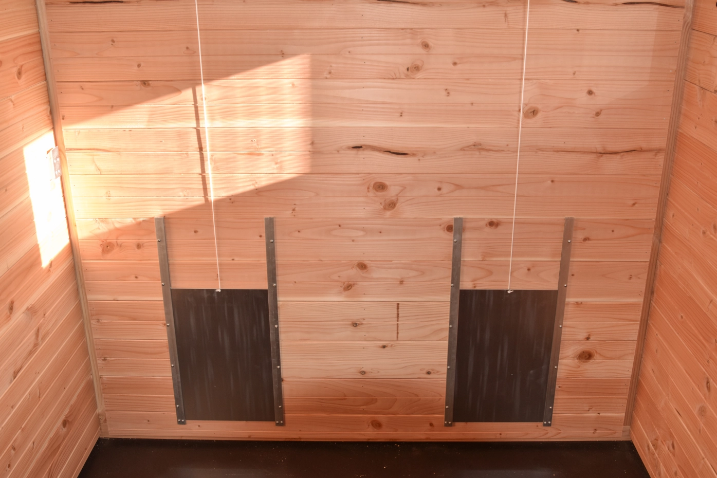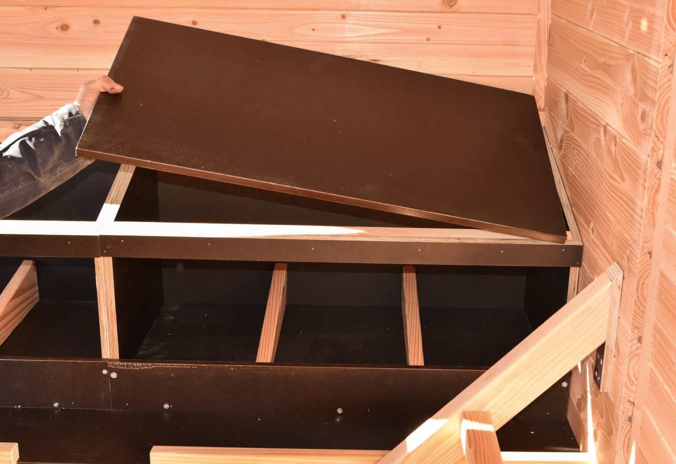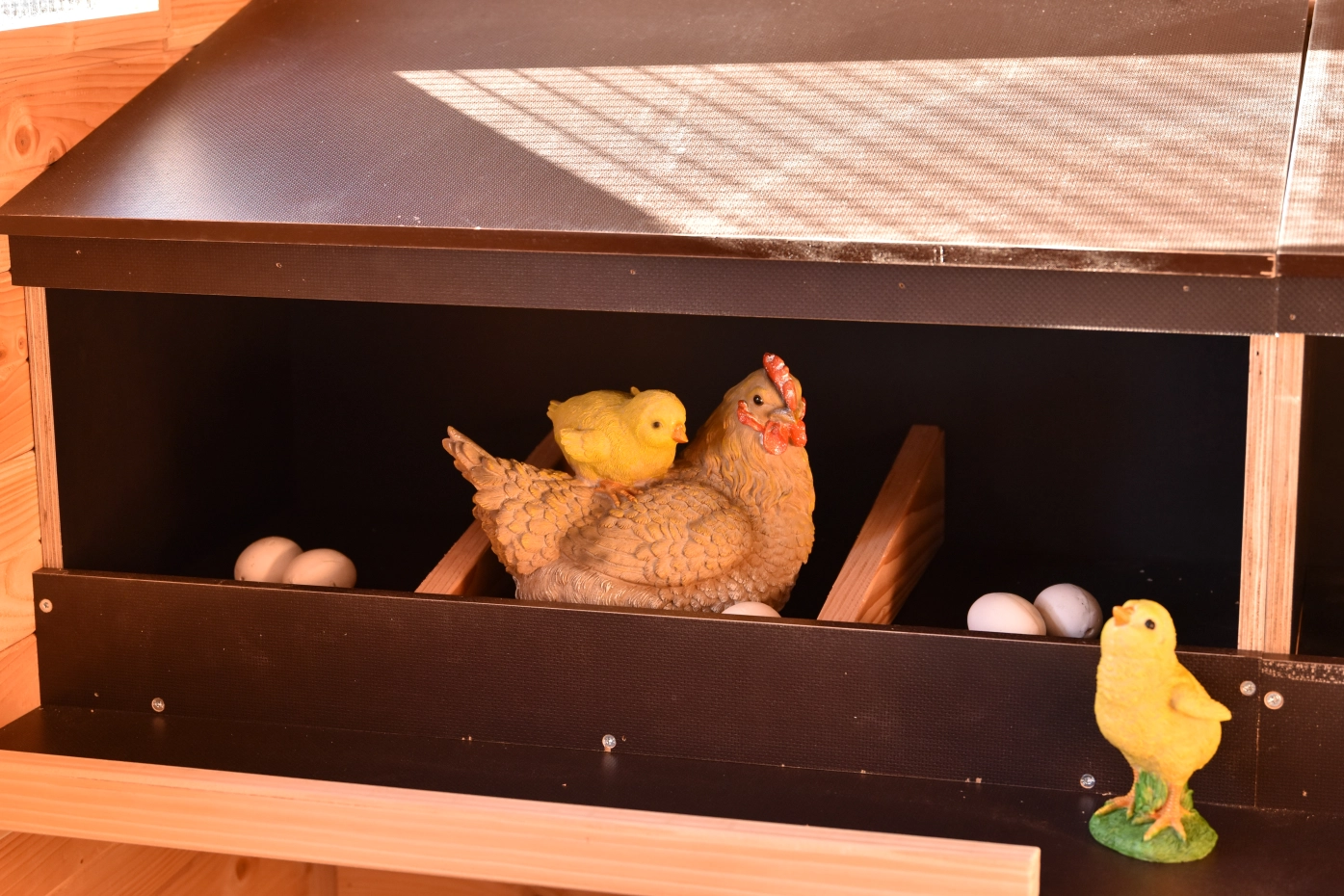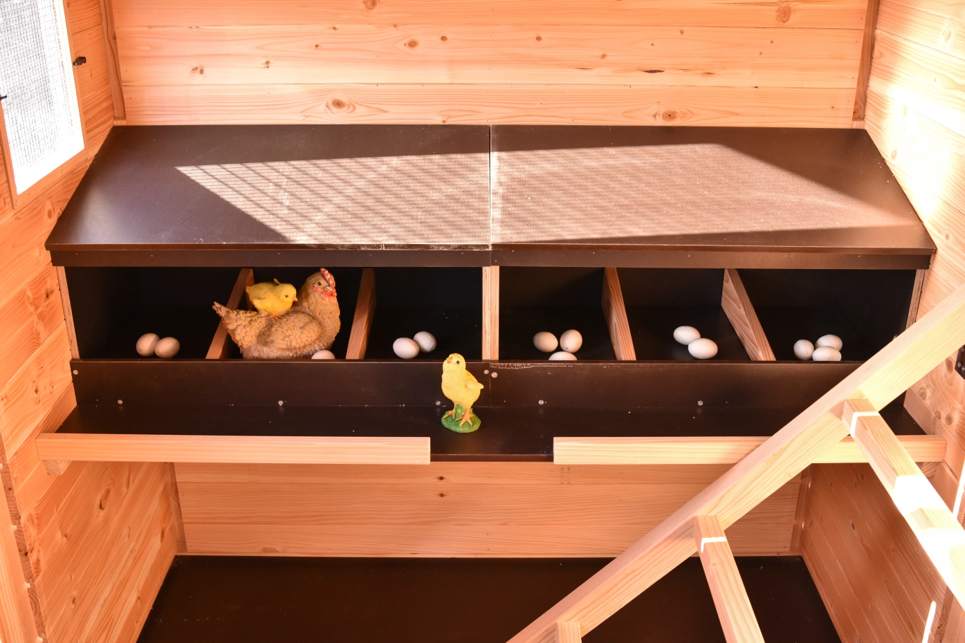 À l’intérieur, on trouve deux grands pondoirs pouvant accueillir jusqu’à six poules simultanément. Le toit et les plaques de sol sont amovibles, ce qui rend le nettoyage rapide et simple. De plus, deux grandes échelles de perchoirs sont fixées au mur et peuvent également être retirées facilement.