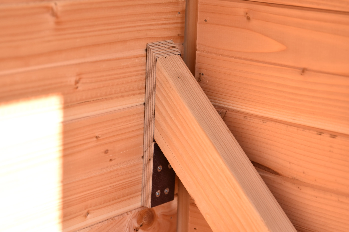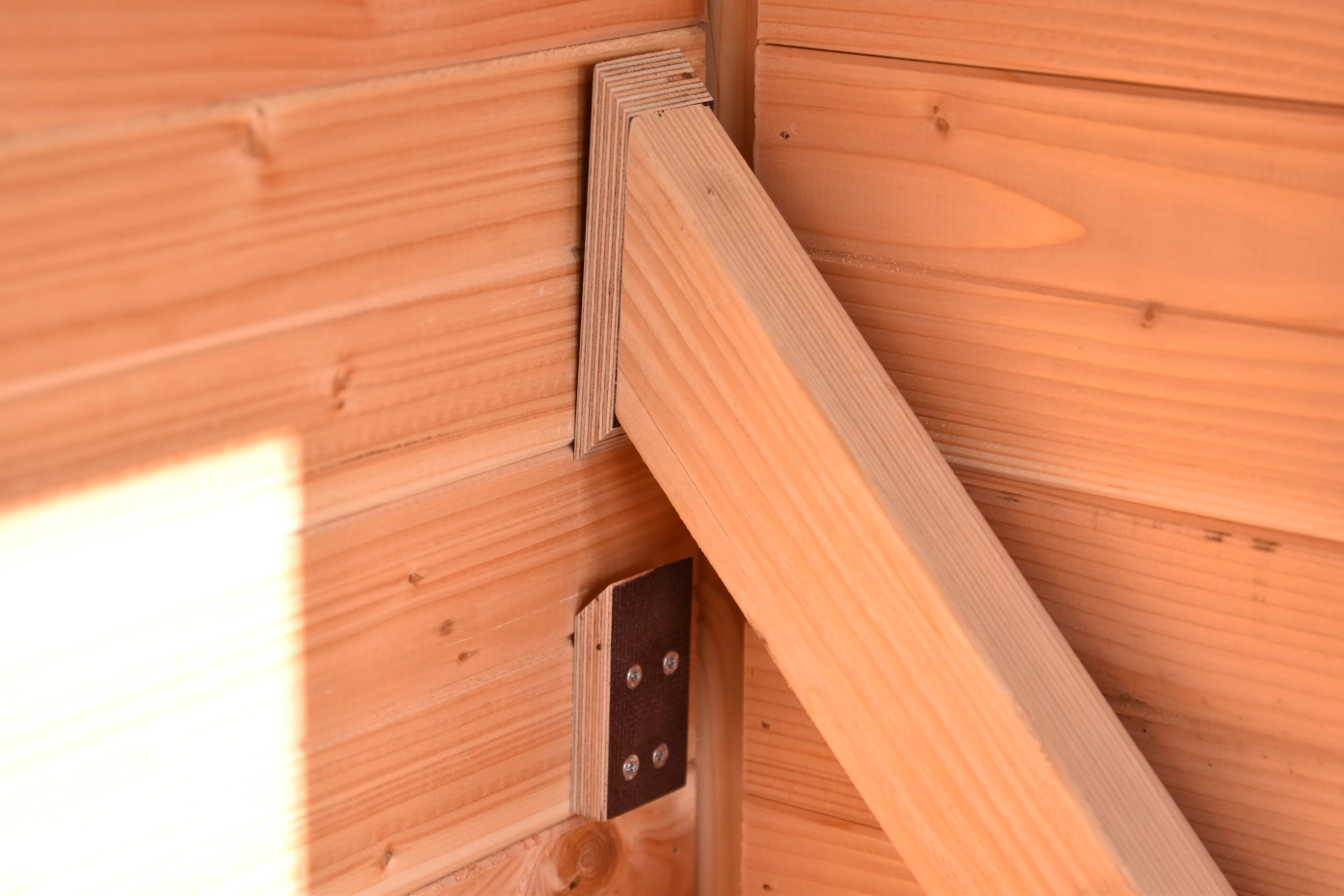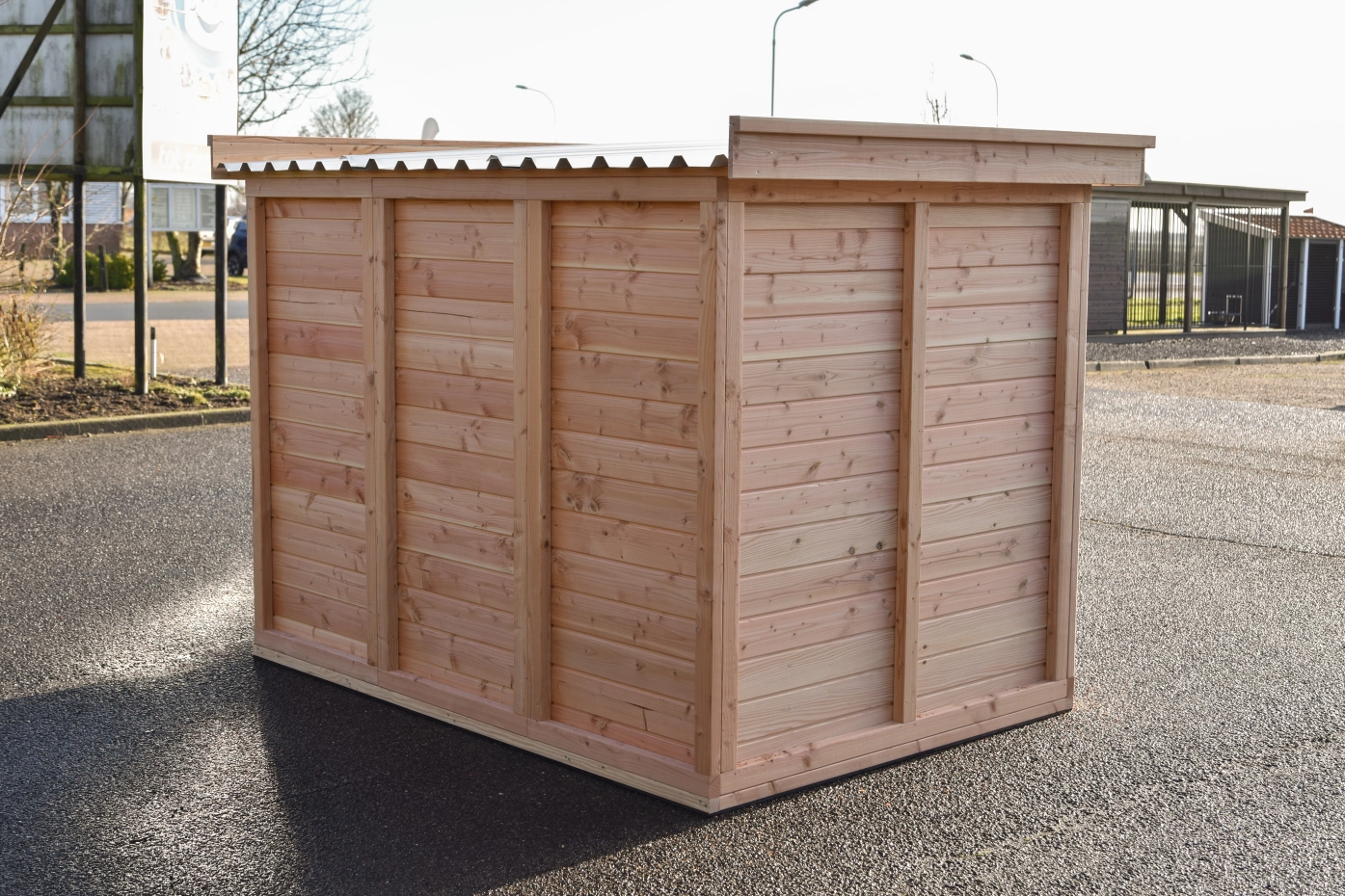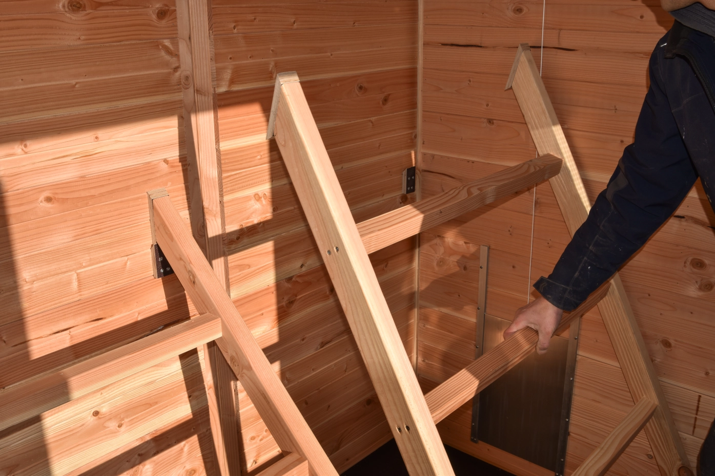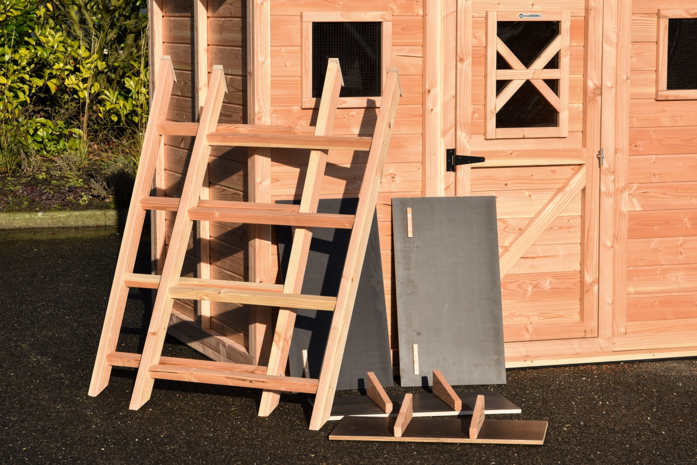 - En bois de Douglas, avec des cadres de 68x44mm, des planches avec un épaisseur de 18mm. Même sans traitement du bois, le bois est durable pour 15 ans, mais le bois se devient gris vite si vous n'utilisez pas des huile pour le Douglas.