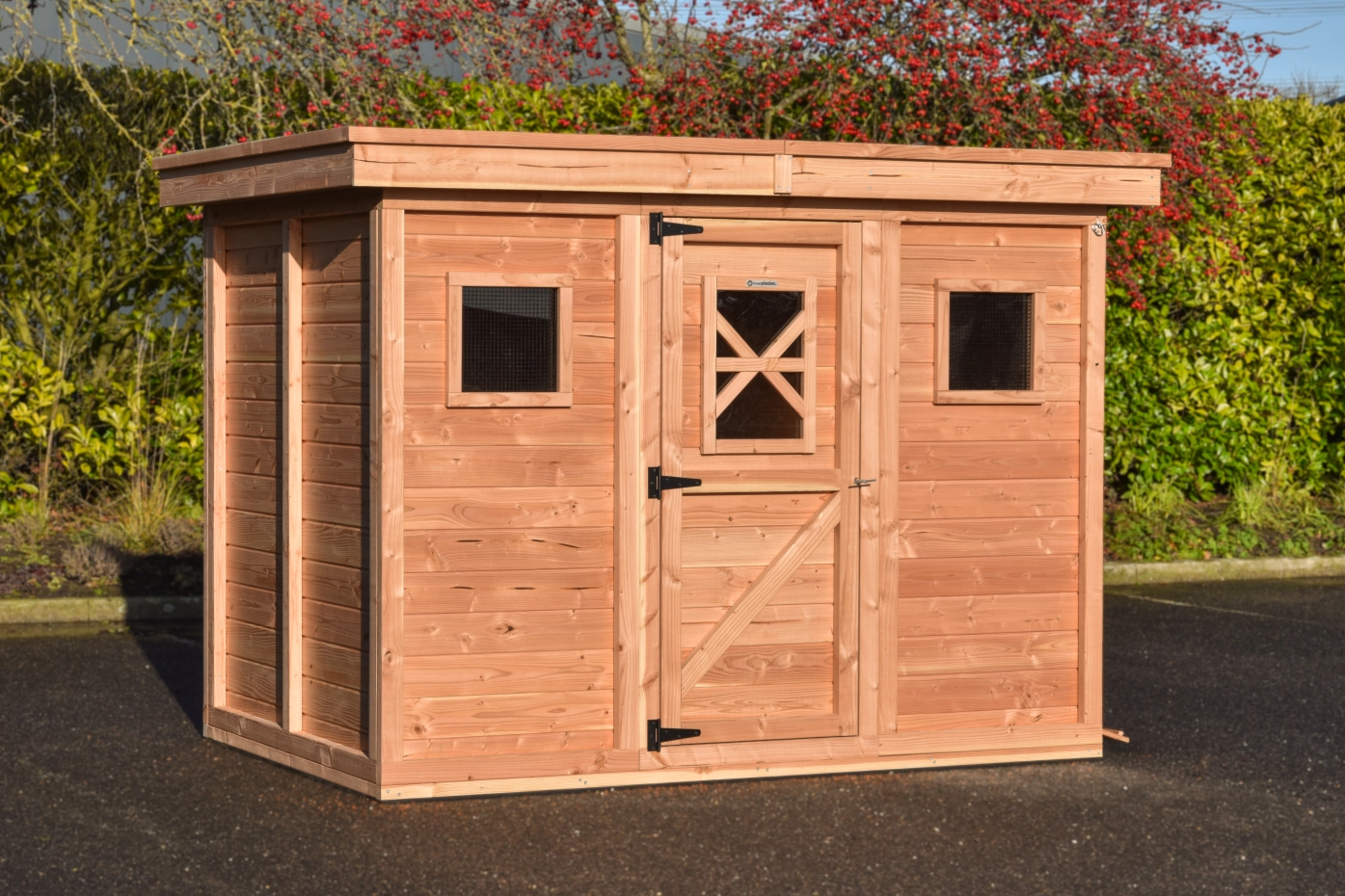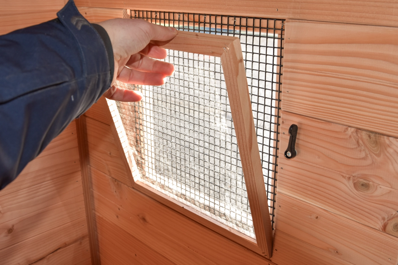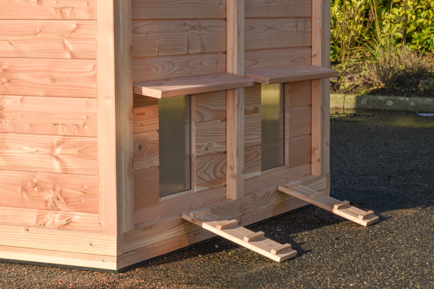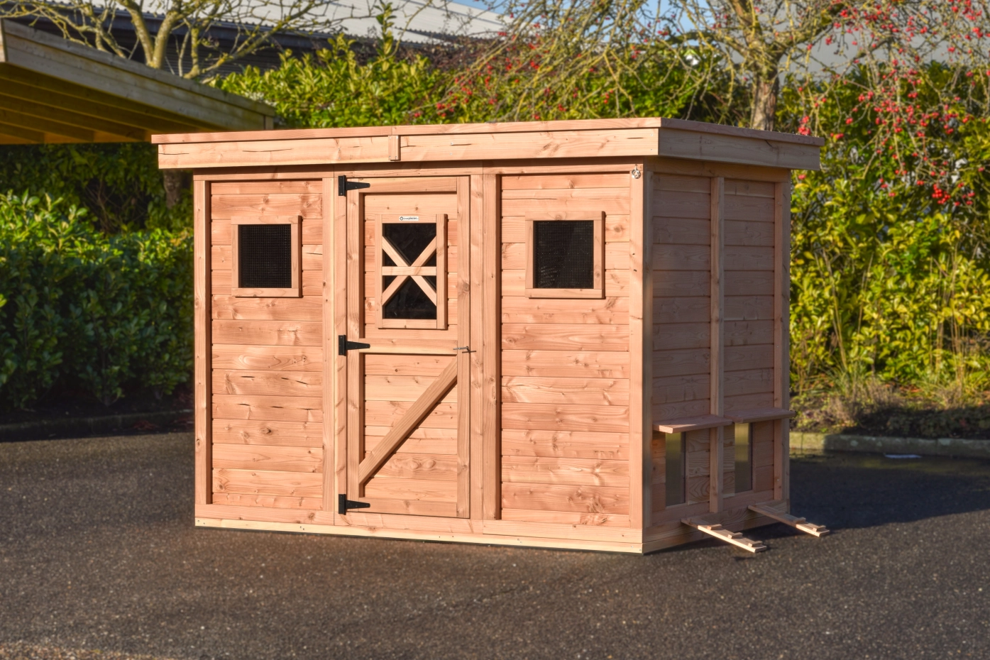 L’abri de nuit peut accueillir 24 grandes poules, 33 poules de taille moyenne ou 48 petites poules. À l’avant se trouve une grande porte avec des charnières noires robustes et une serrure pratique pouvant être ouverte à l’aide de la clé en T fournie. Les fenêtres offrent une bonne visibilité à l’intérieur, tandis que les deux fenêtres extérieures avec plexiglas amovible permettent une ventilation supplémentaire.