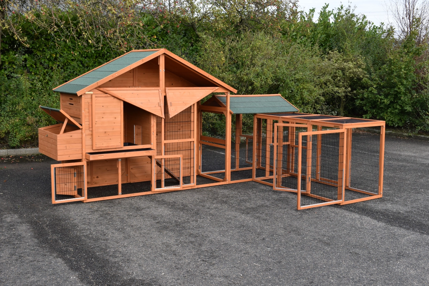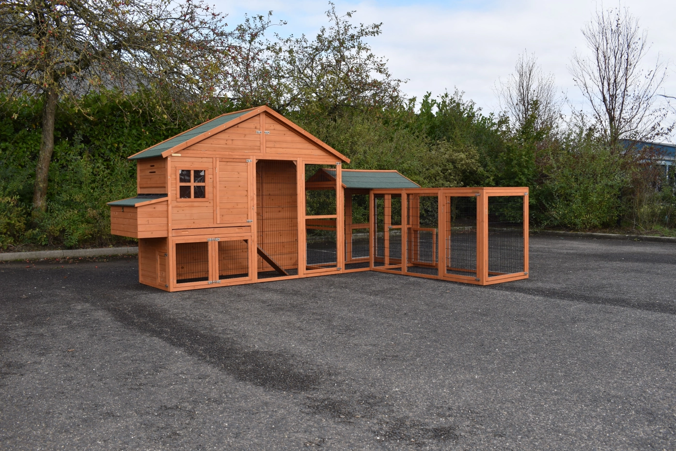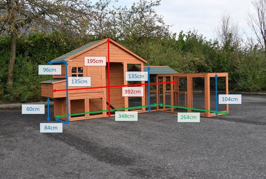 Poulailler Holiday Large avec pondoir et enclos Space Large et enclos Functional est une grande, belle poulailler pratique. Parce que l'unité d'angle vous avez besoin moins espace pour placer le grand poulailler. Poulailler Holiday Large est équipée pour 6 à 10 poules. Poulailler Holiday Large peut être assemblé de deux manières différentes. Dimensions in unité d'angle: 390x271x195cm, dimensions au sol: 348x261cm. Dimensions in unité longue: max. dimensions: 564x100x195cm, dimensions au sol: 528x84cm.