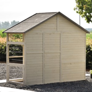 Le poulailler comprend également un enclos et un abri de nuit avec deux perchoirs. Sous le toit se trouve un grand espace de rangement accessible par l’avant. Le poulailler Holiday Large est vraiment un excellent poulailler, doté de grandes portes de tous les côtés. Il convient pour héberger environ 6 à 10 poules. La porte en bois est équipée d’un cœur blanc standard, mais celui-ci peut être remplacé par une jolie figurine d’animal.
