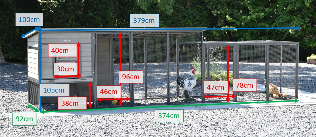 | Dimensions extérieures incluant le toit (LxPxH) | 379x100x105cm |