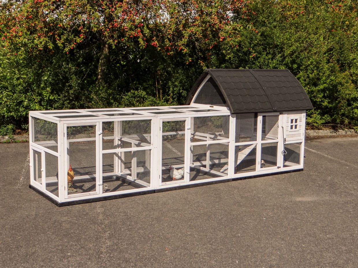 - Pour combiner enclos et poulailler, un panneau de treillis et / ou une porte doit être enlevé
