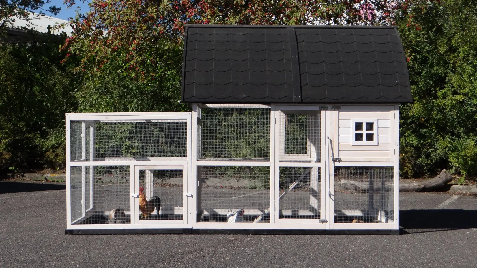 Un abri pour animaux particulièrement élégant et pratique, avec abri nocturne, pondoir et grand enclos spacieux.