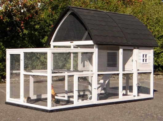 - Pour combiner enclos et poulailler, un panneau de treillis et / ou une porte doit être enlevé