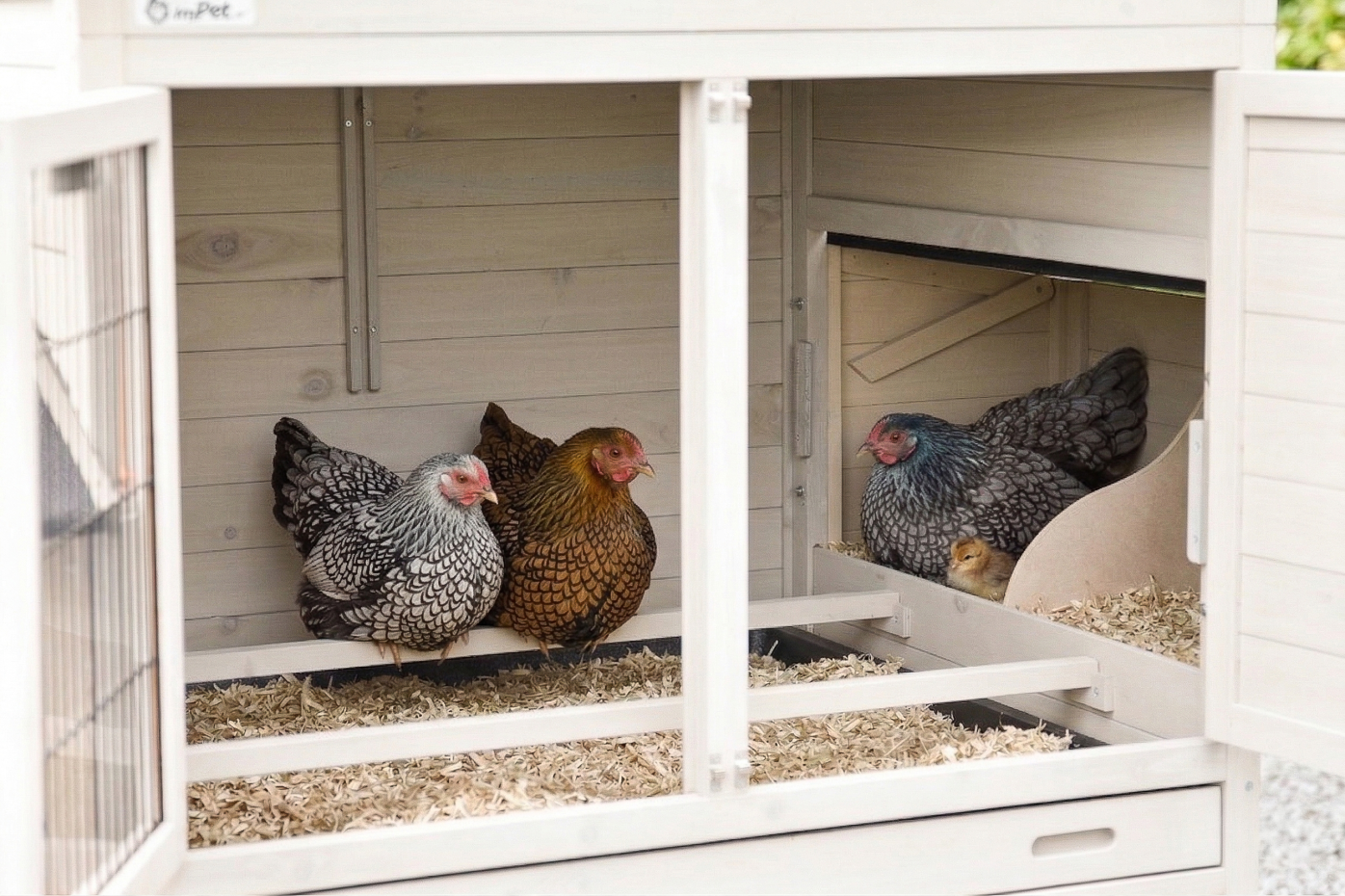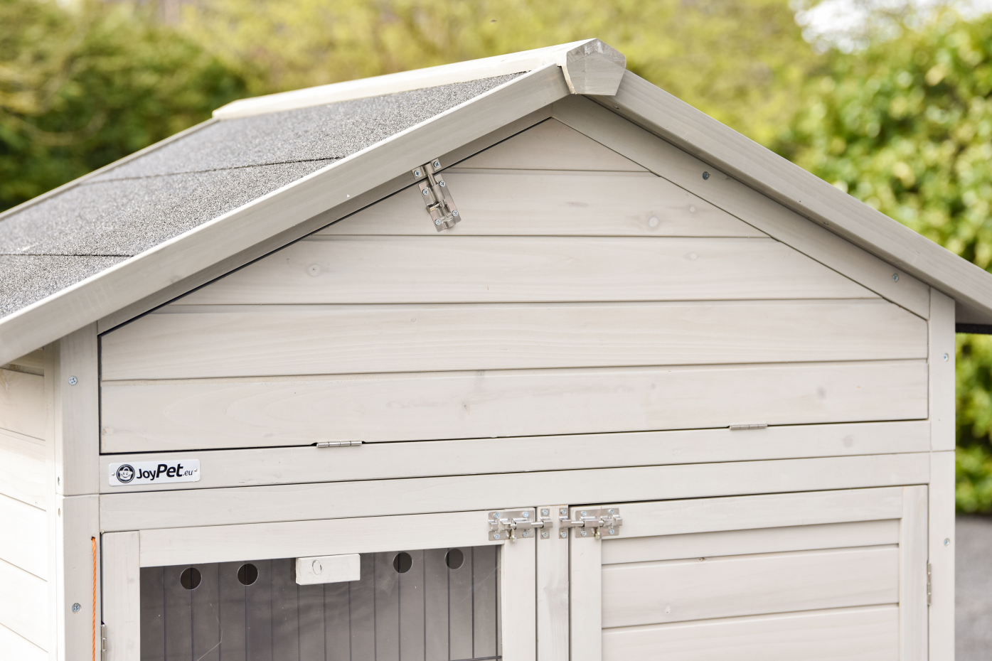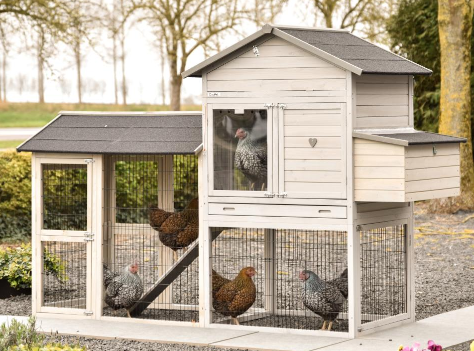 Le grand abri de nuit et le pondoir pratique offrent confort et facilité d’utilisation, tandis que les grandes portes simplifient l’entretien