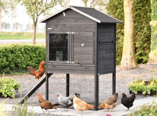 Ce grand poulailler est fini dans les moindres détails, avec de grandes portes et un vaste abri nocturne.