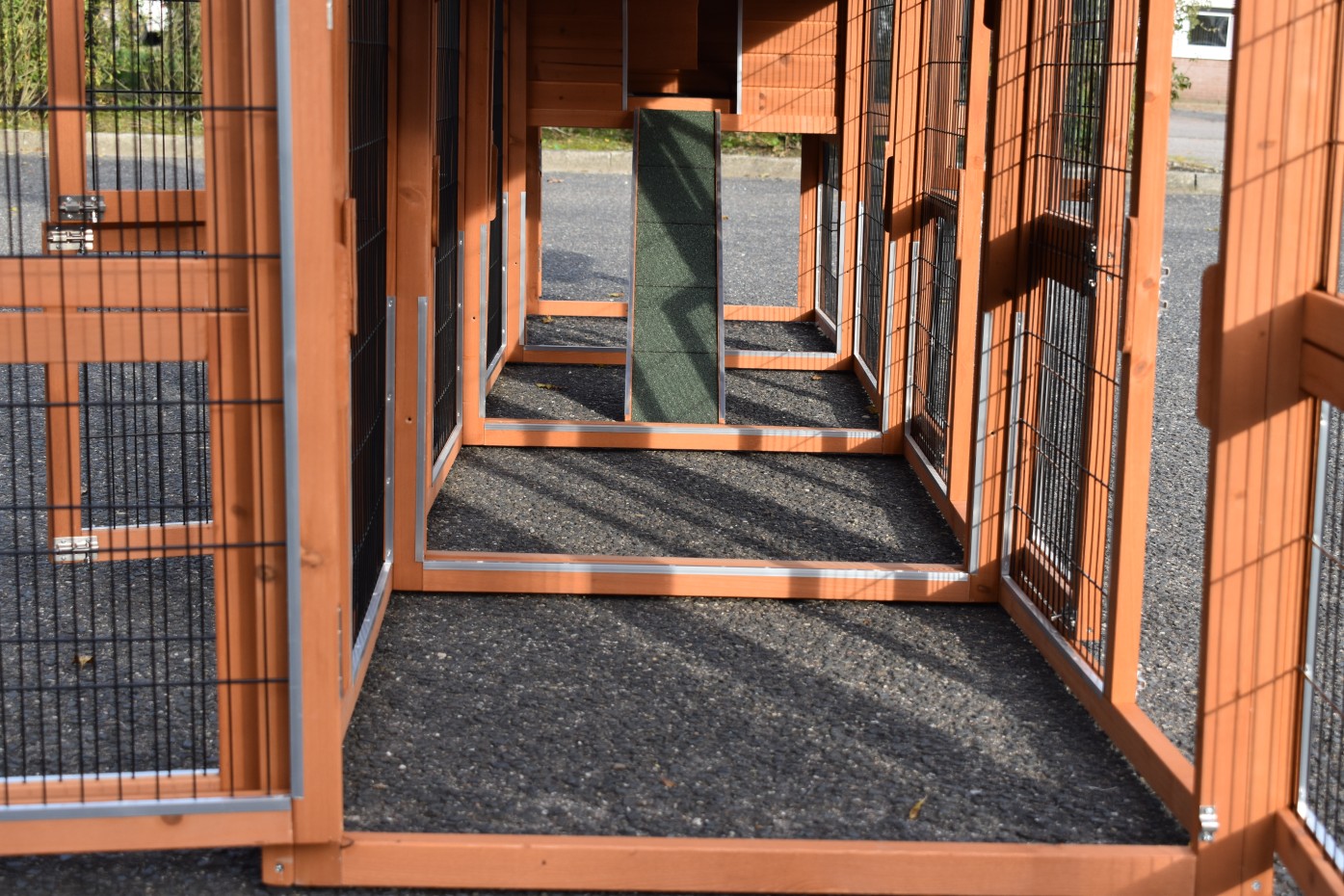 - Pour combiner enclos et poulailler, un panneau de treillis et / ou une porte doit être enlevé