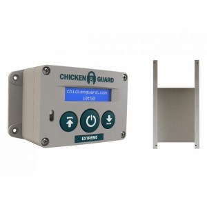 Ouvreur automatique pour poulailler, Chickenguard Extreme sur piles, avec porte coulissante en aluminium. Avec minuterie intégrée pour fermer et / ou ouvrir votre porte à une heure fixe. Cet appareil a un de capteur de lumière intégré aussi.