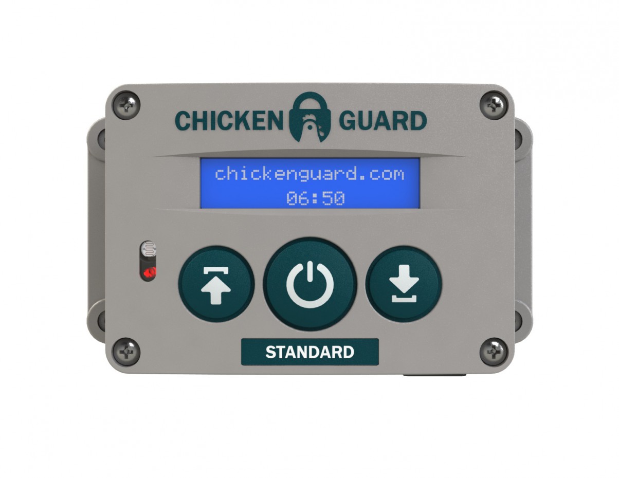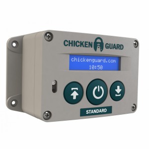 Ouvreur automatique pour poulailler, Chickenguard Standard, sur piles. Avec minuterie intégrée pour fermer et / ou ouvrir votre porte à une heure fixe. Cet appareil ne possède pas de capteur de lumière intégré. Cet ouvreur peut donc également être monté à l'intérieur du poulailler.