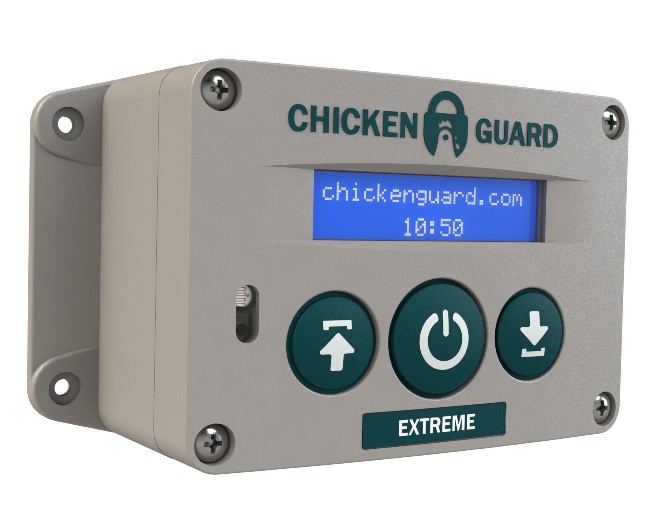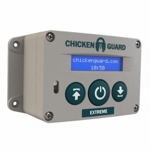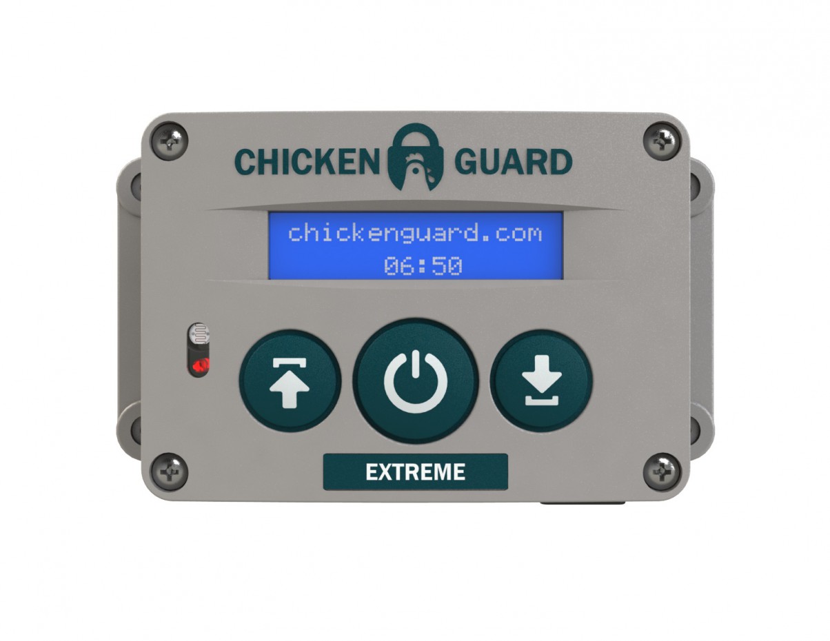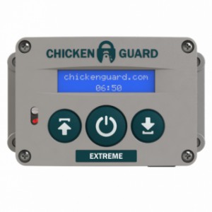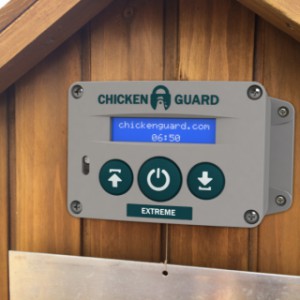 Ouvreur automatique pour poulailler, Chickenguard Extreme, sur piles. Avec minuterie intégrée et capteur de luminosité pour fermer et / ou ouvrir votre porte. Cet appareil possède un capteur de luminosité intégré. Cet ouvreur ne peut donc également être monté à l'intérieur du poulailler.