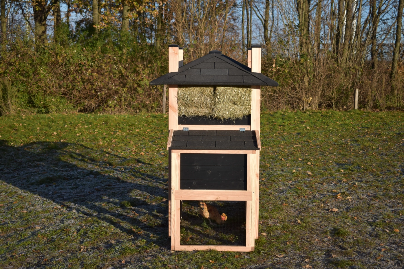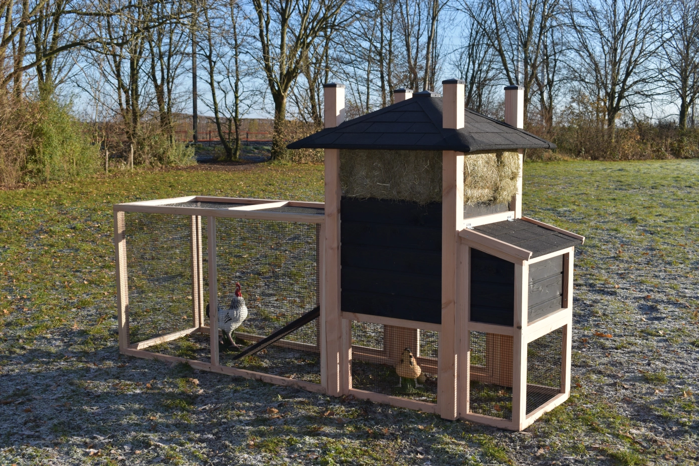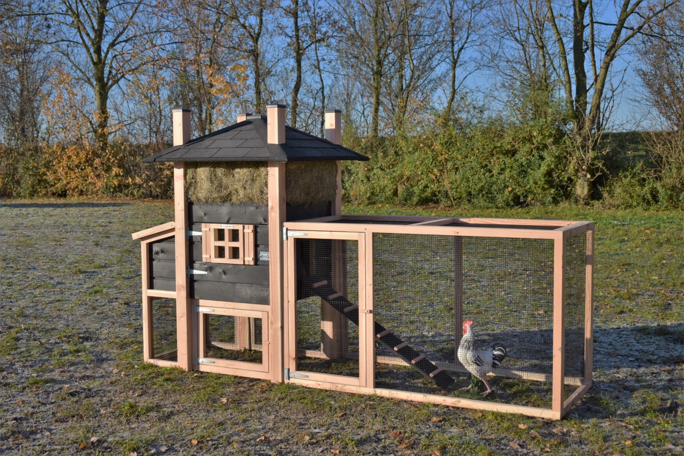 Le poulailler botte de foin Rosa est un achat pour votre jardin. Le clapier est étendue avec un enclos, avec toit de maille, et une pondoir. Le poulailler fermé est un grande porte, pour un nettoyage facile. La pondoir a un toit articulé, ainsi que vous pouvez ramasser les oeufs facilement.