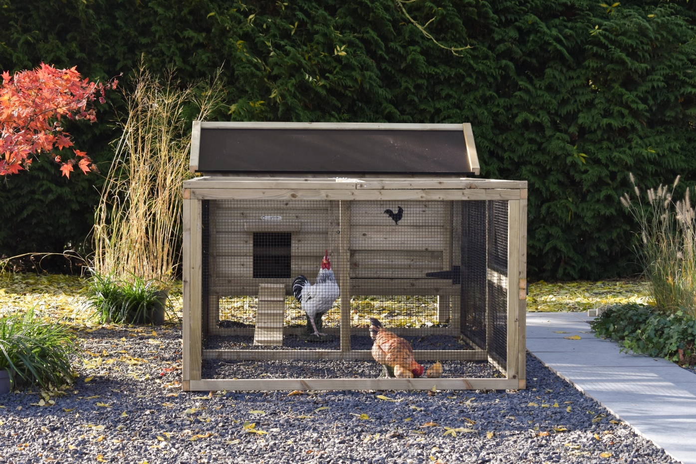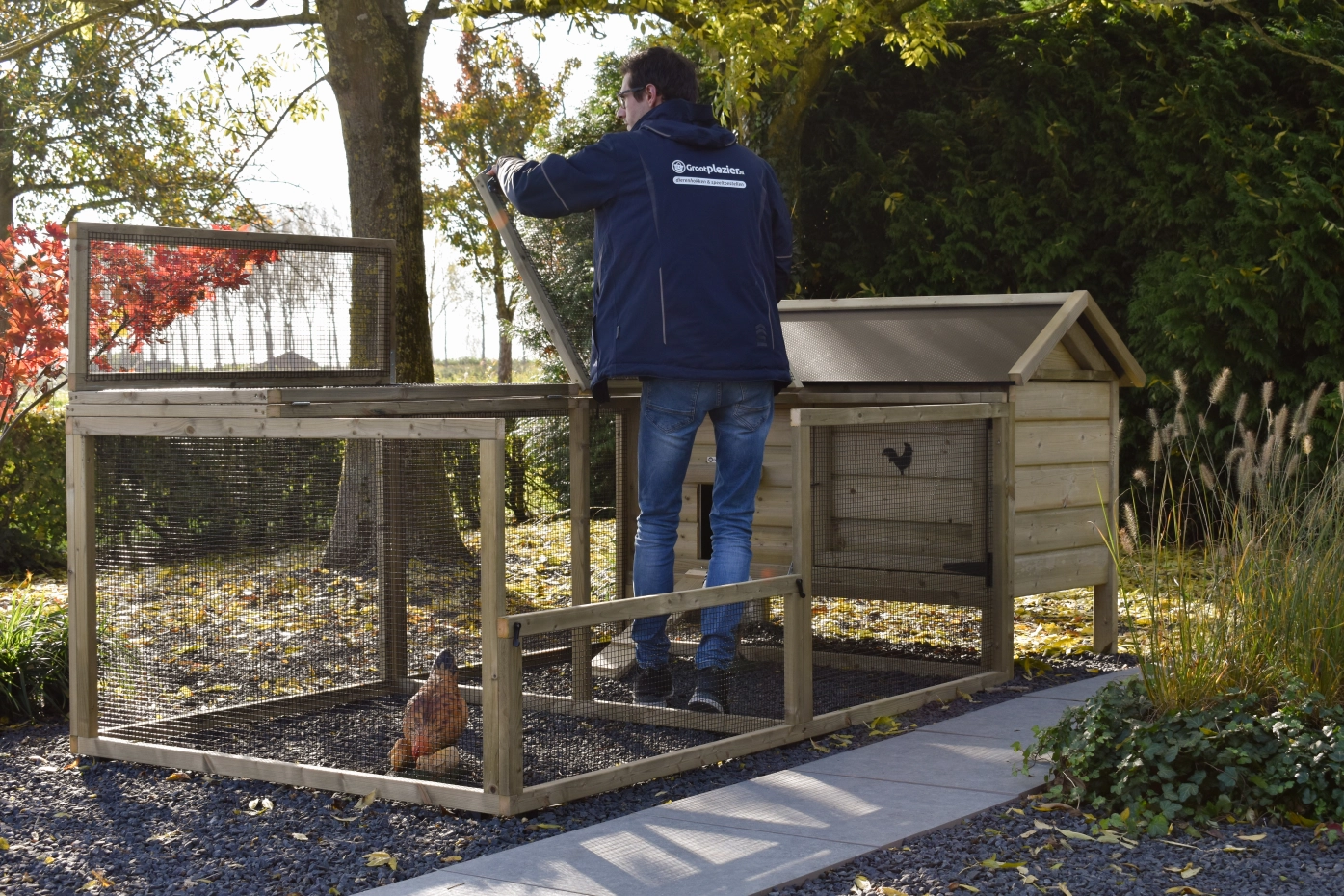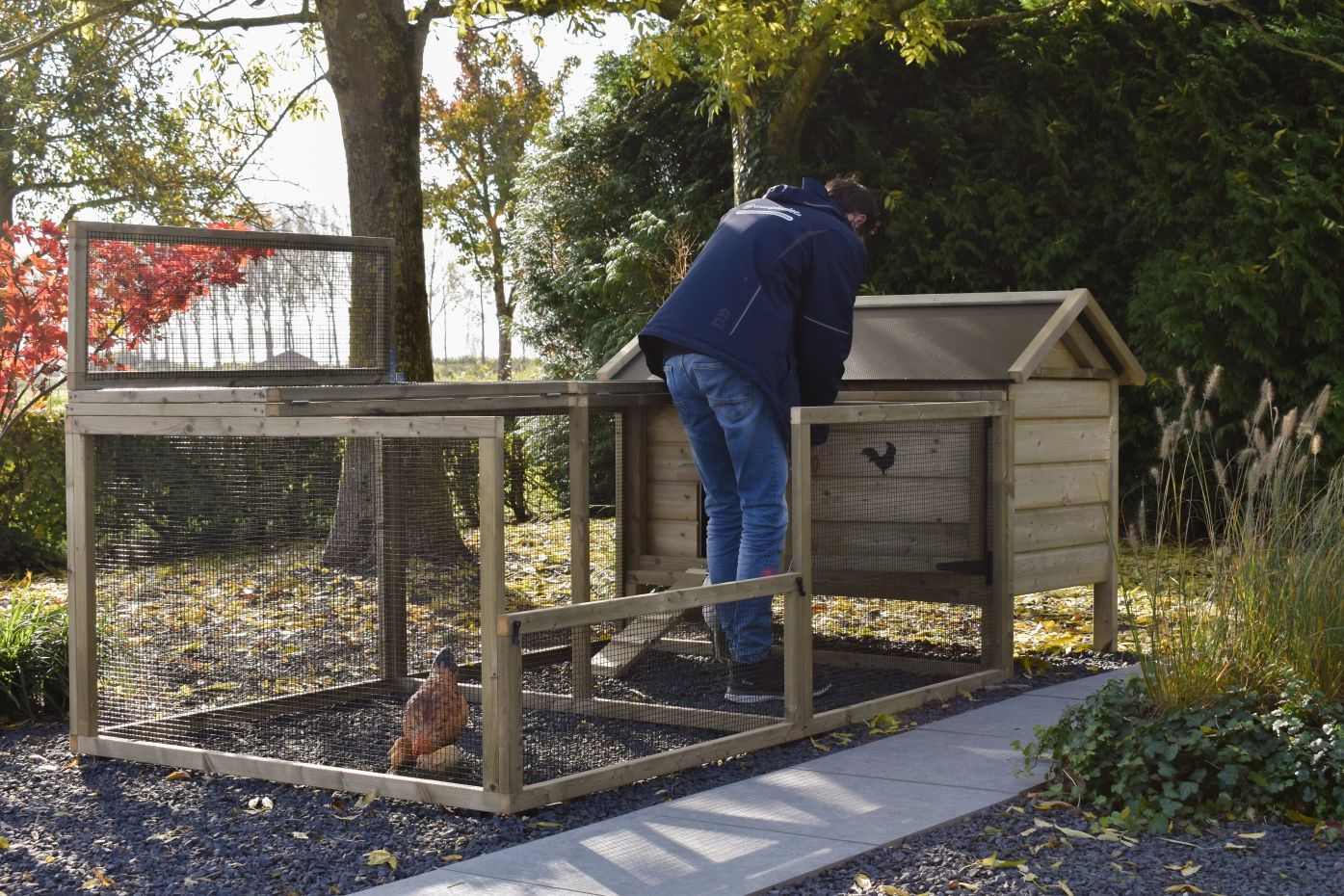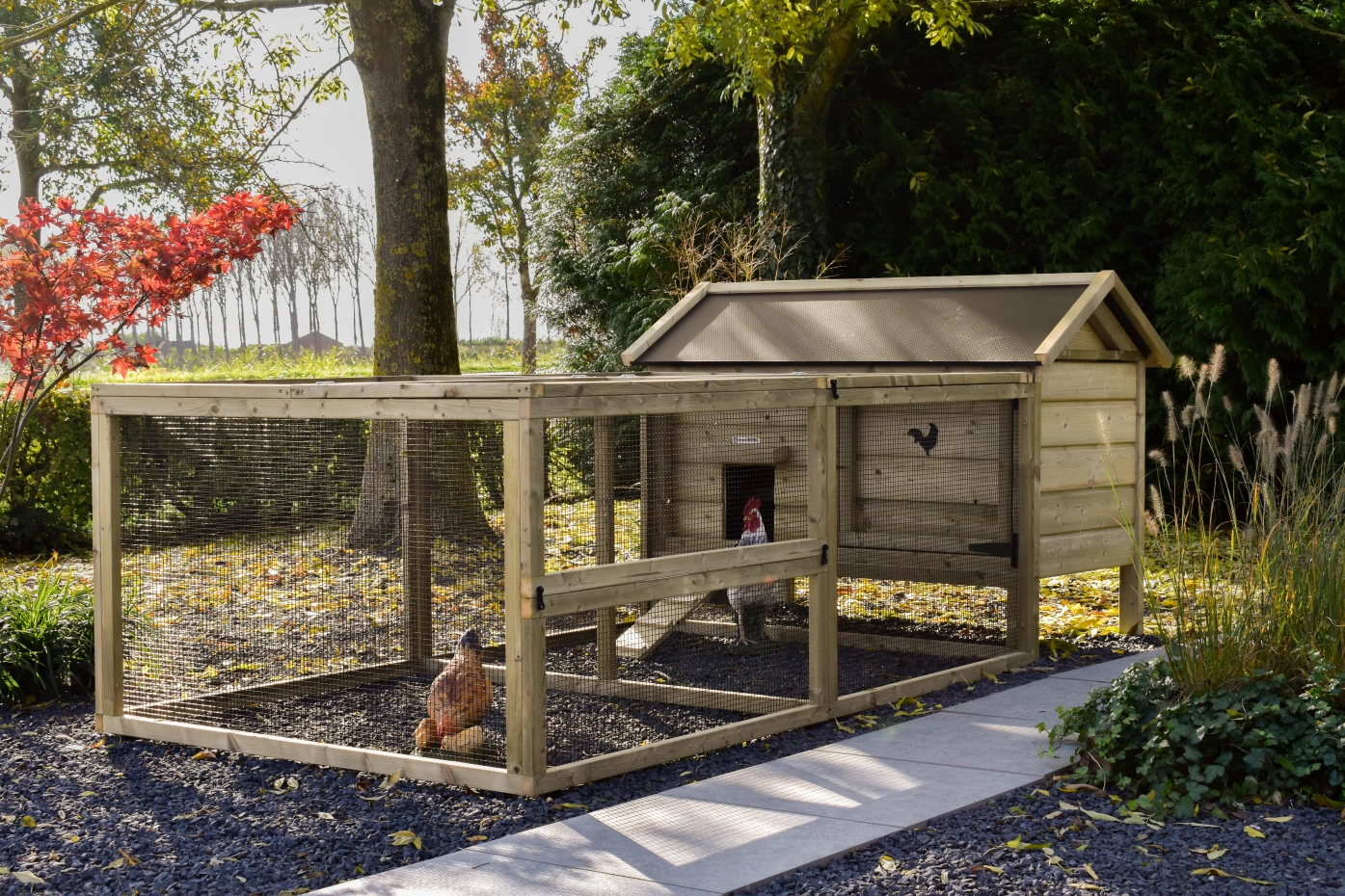 Ce modèle bas, avec un enclos spacieux, offre à vos poules beaucoup d'espace pour gratter et rester actives. Le poulailler et l'enclos sont faciles à nettoyer grâce au toit articulé et à la porte pratique à l'avant du poulailler. Pour un joli détail sur la porte, vous pouvez commander un petit animal en bois. Cela donne au poulailler un charme supplémentaire !