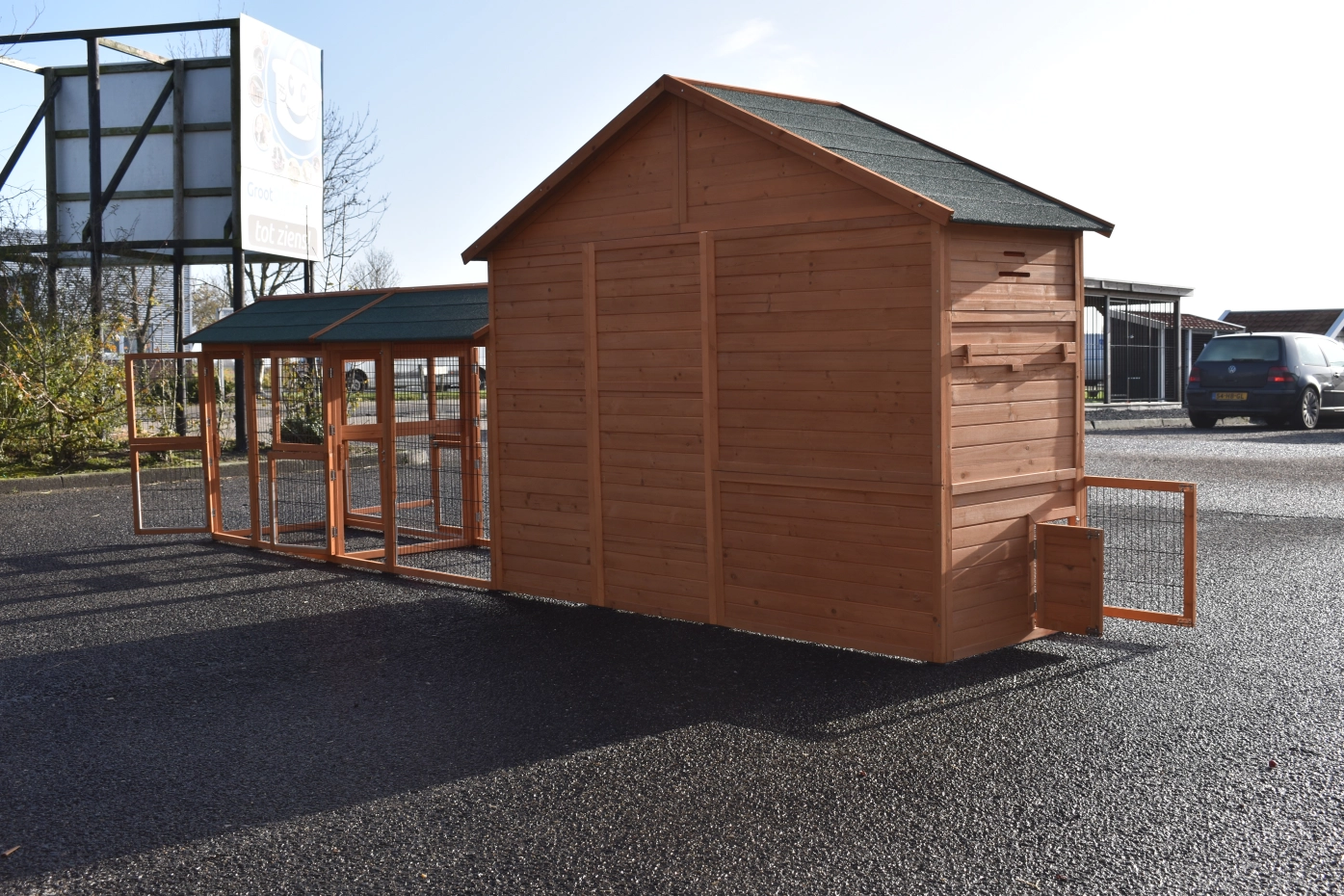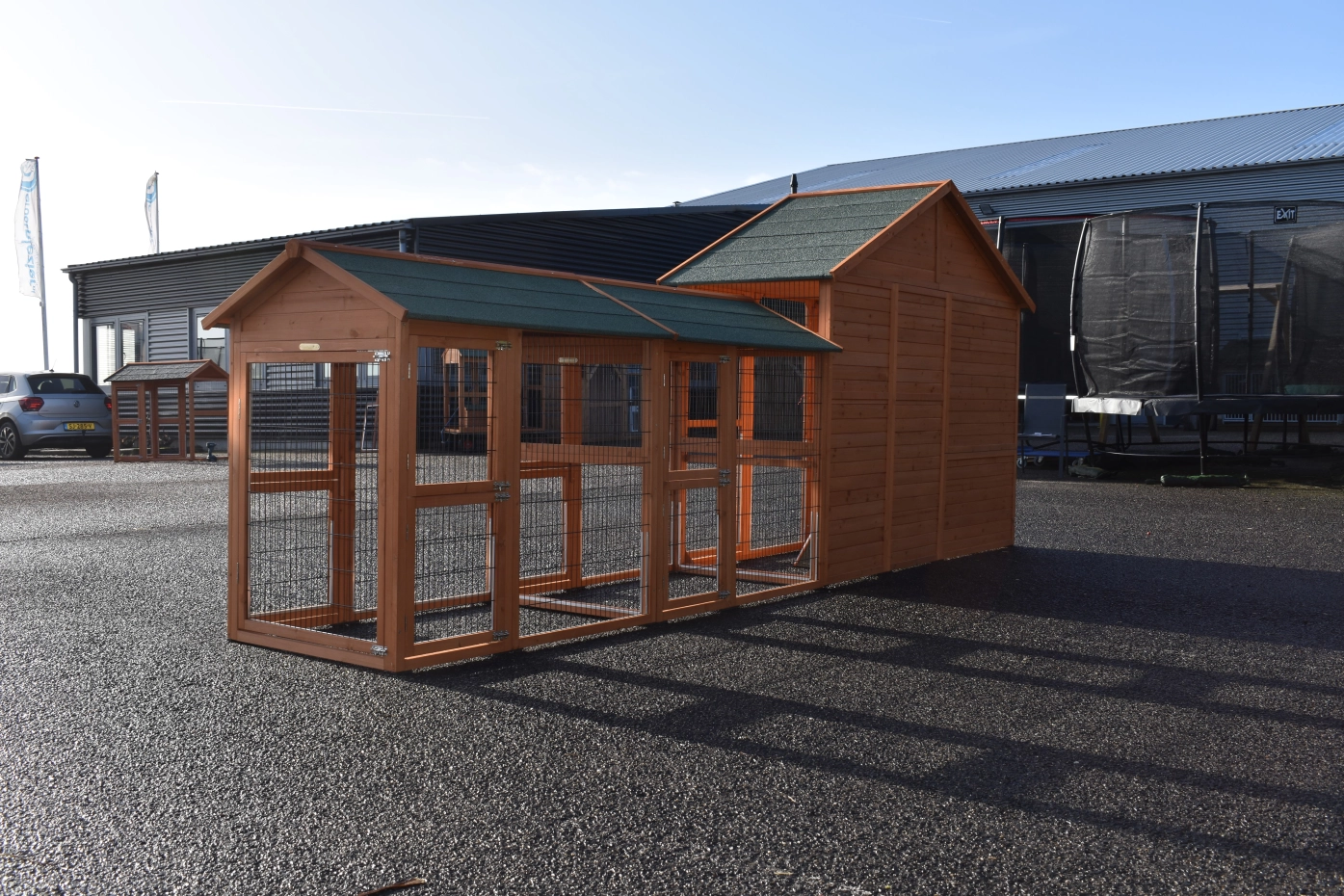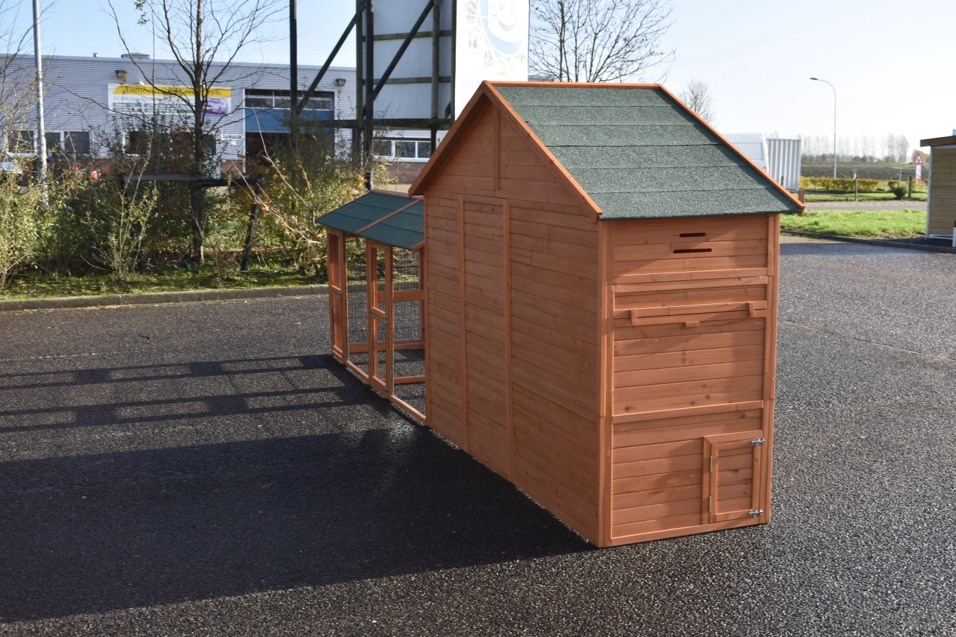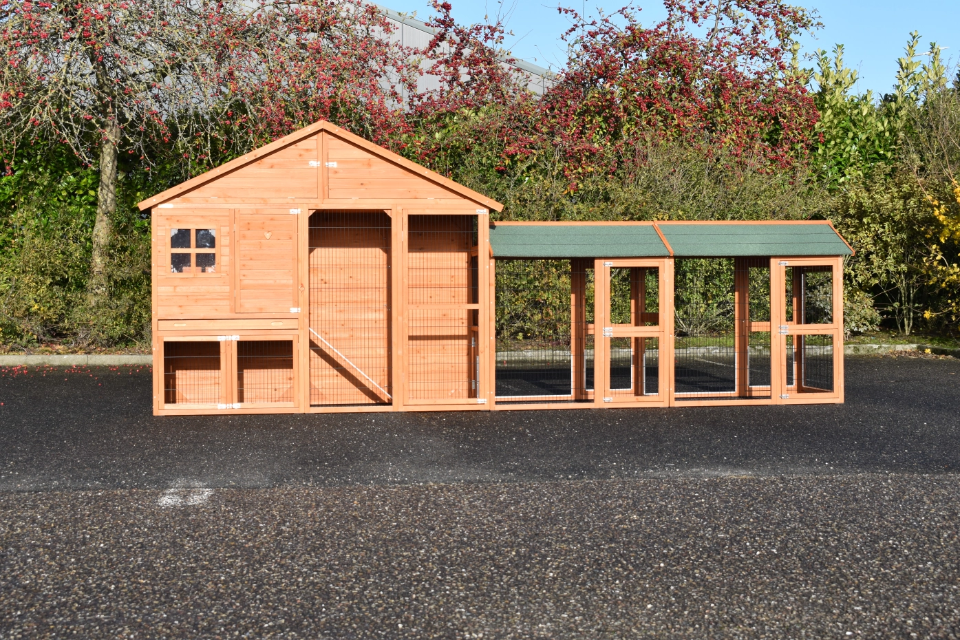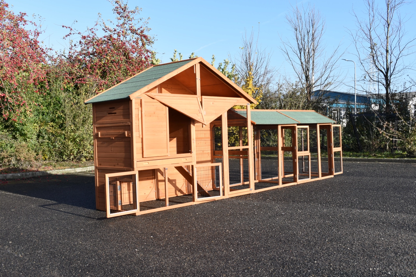 Grande poulailler Holiday Large est un belle poulailler pratique avec poulailler fermé et 2 Space Large enclos. Le beaux poulailler is équipée avec grande portes, le poulailler de nuit a 2 perches. Au-dessus le poulailler fermé est une grenier de stockage. L'abri de nuit de poulailler est approprié pour approxivement 4-10 poules.