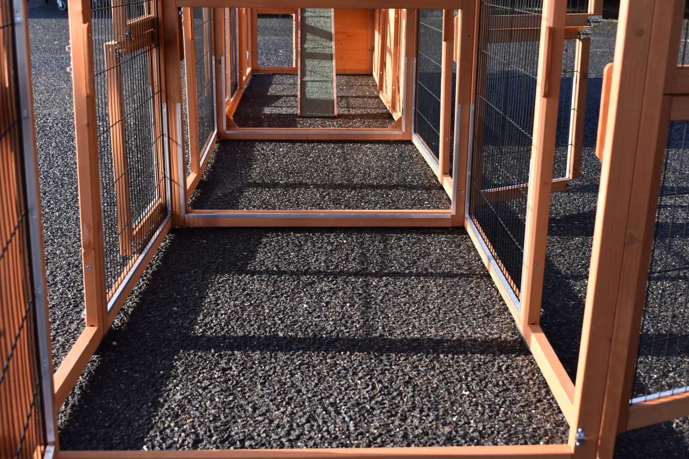 - Pour combiner enclos et poulailler, un panneau de treillis et / ou une porte doit être enlevé
