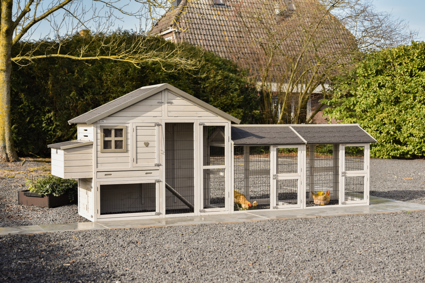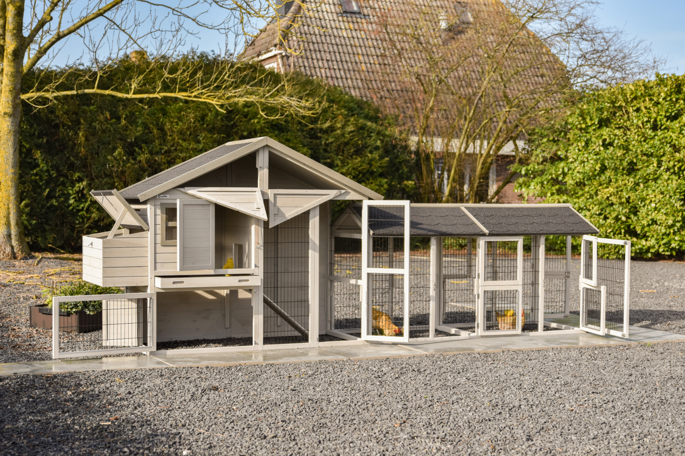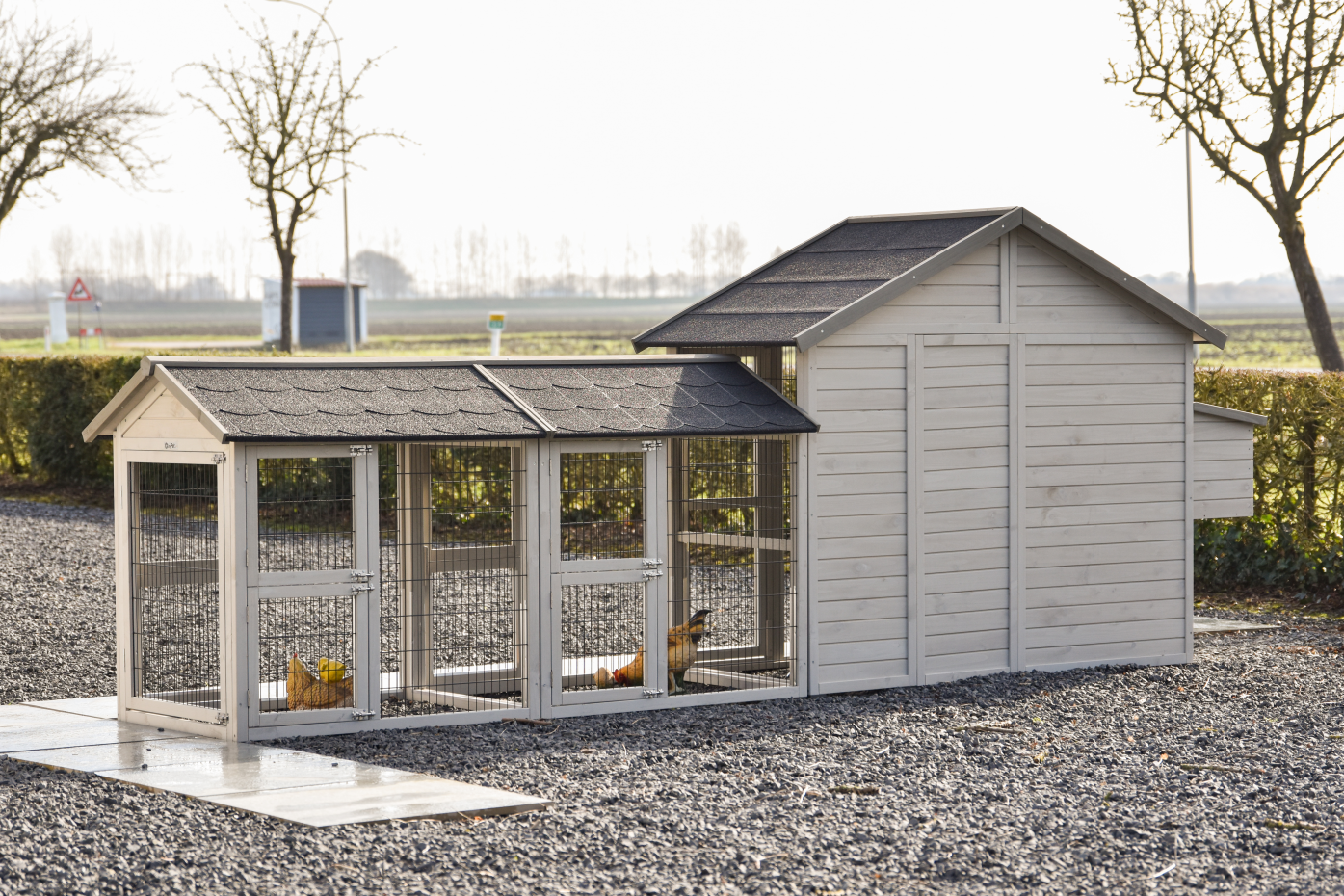 Le poulailler Holiday medium light-grey avec pondoir et double enclos attenant est un abri spacieux et bien organisé avec plusieurs portes d’accès, ce qui facilite l’entretien quotidien et le nettoyage ; ce modèle de taille moyenne de la série Holiday offre aux poules un espace de nuit confortable avec perchoirs, un grenier de rangement pratique pour l’alimentation ou les accessoires ainsi qu’un pondoir spacieux où elles peuvent pondre leurs œufs en toute tranquillité.