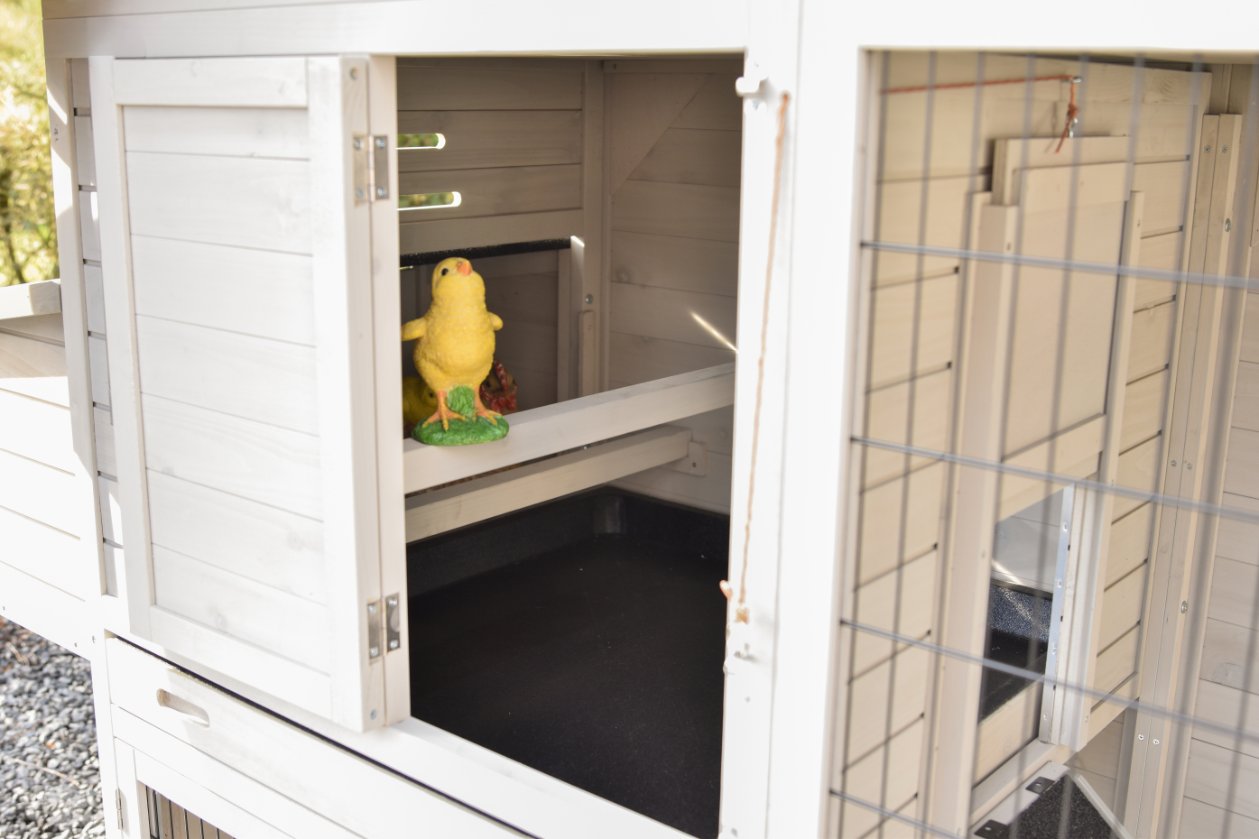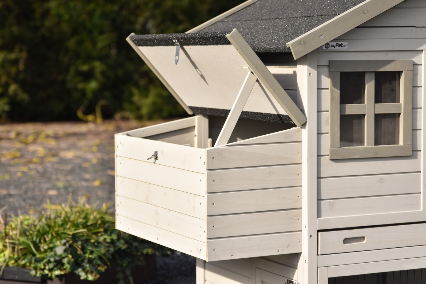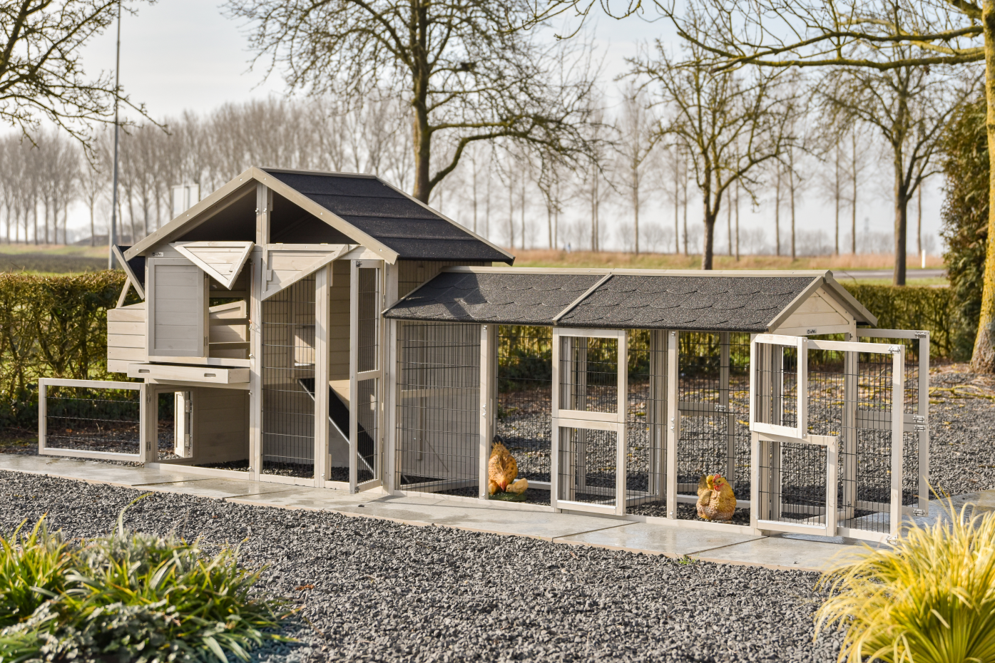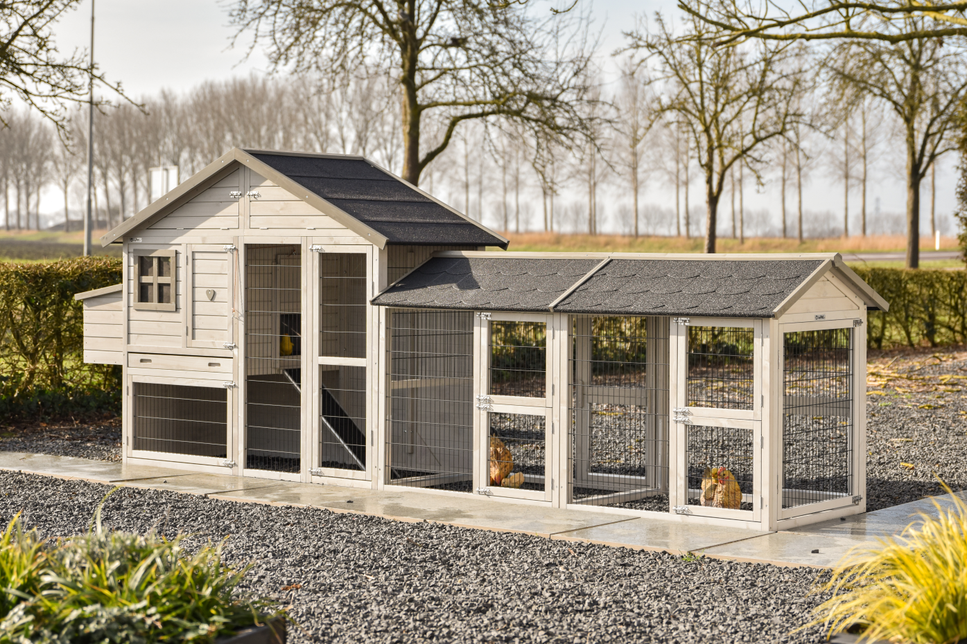 Le poulailler Holiday medium light-grey avec pondoir et double enclos attenant est un abri spacieux et bien organisé avec plusieurs portes d’accès, ce qui facilite l’entretien quotidien et le nettoyage ; ce modèle de taille moyenne de la série Holiday offre aux poules un espace de nuit confortable avec perchoirs, un grenier de rangement pratique pour l’alimentation ou les accessoires ainsi qu’un pondoir spacieux où elles peuvent pondre leurs œufs en toute tranquillité.