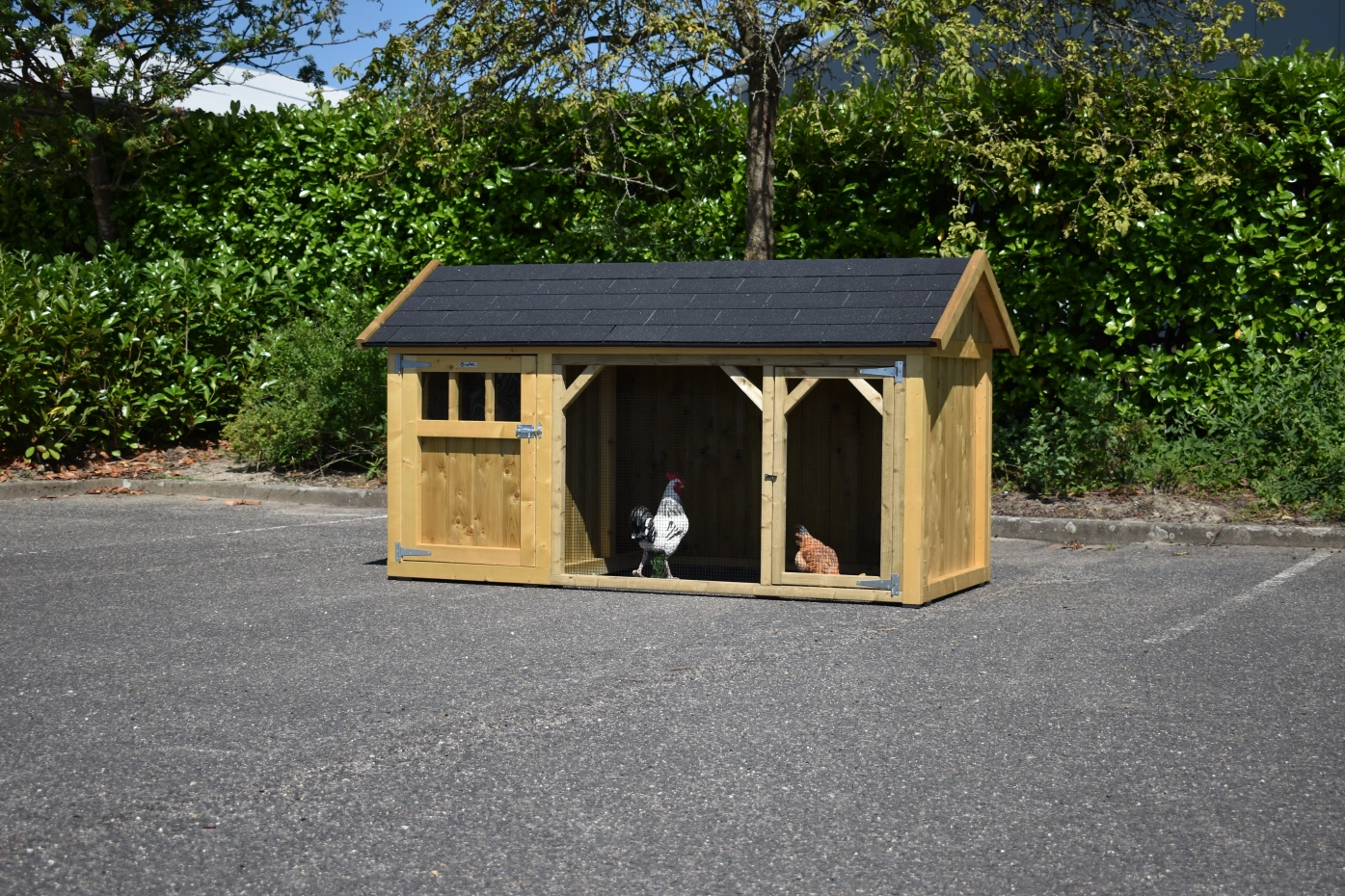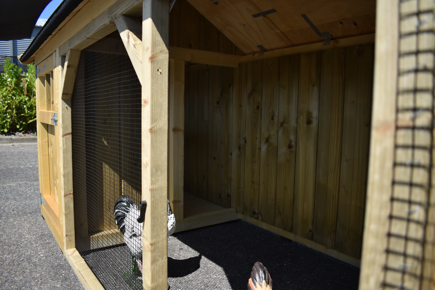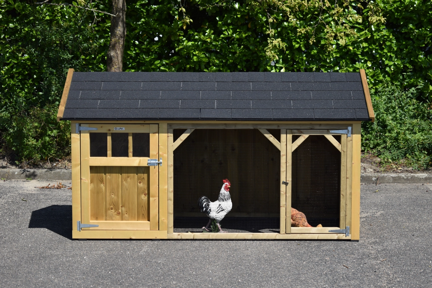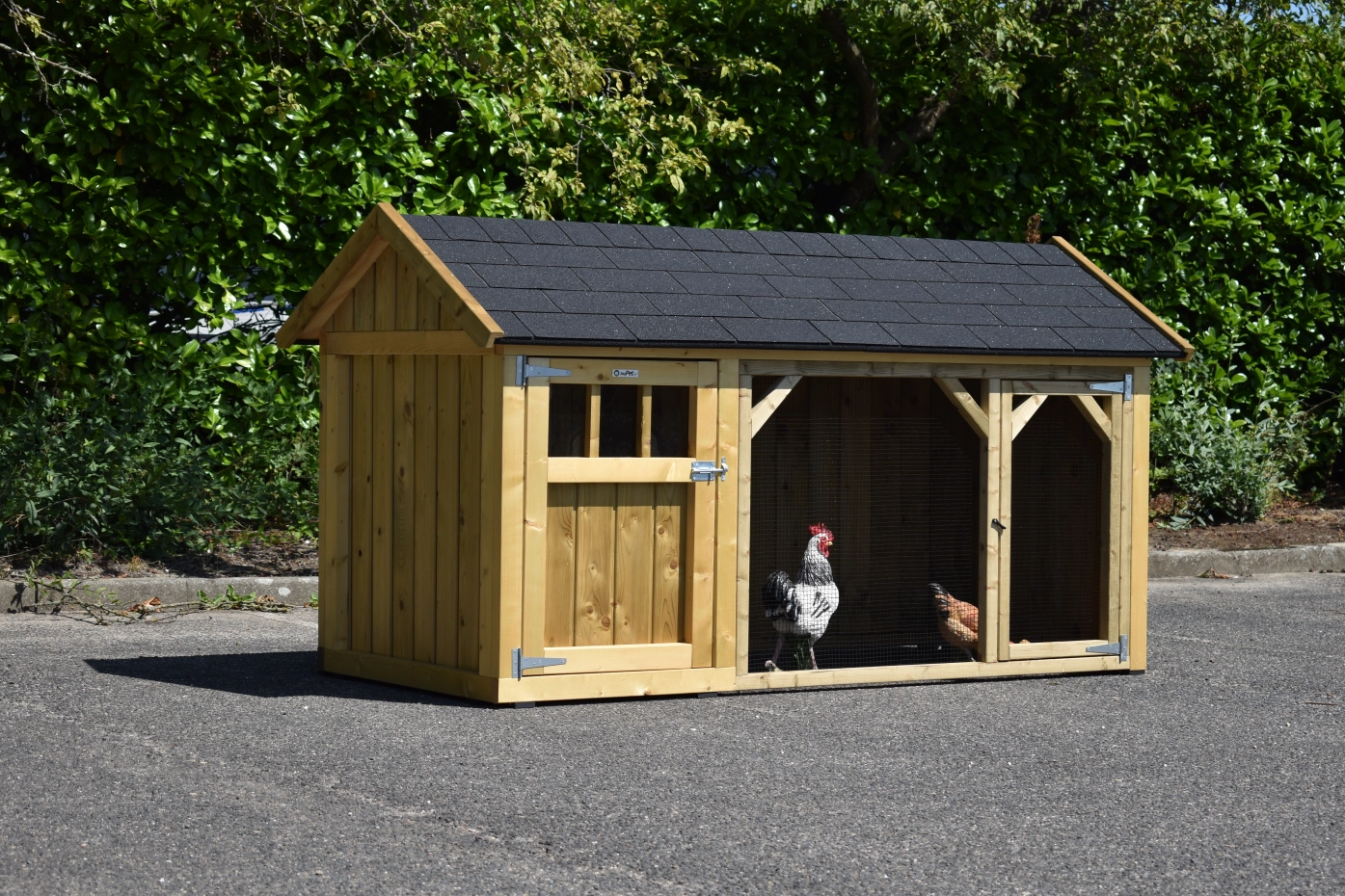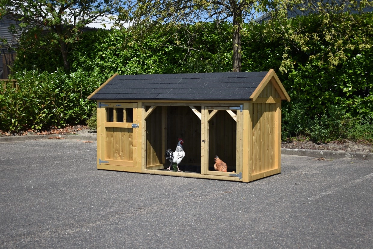 Poulailler Belle 1 avec un toit pointu est un beau clapier avec un enclos couvert. Le poulailler fermé est équipée avec une pondoir, perchoirs et a un sol en bois d'épicéa impregné. Comme nous fabriquons le loft nous-mêmes et que nous utilisons des matériaux de bonne qualité, il ne nécessite aucun entretien.