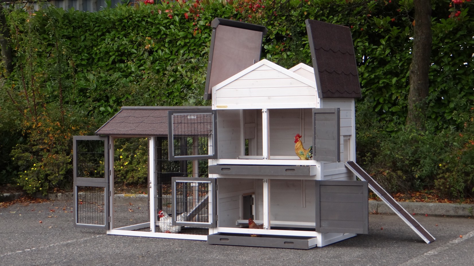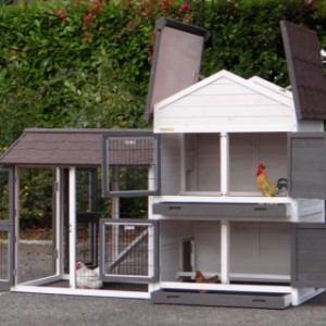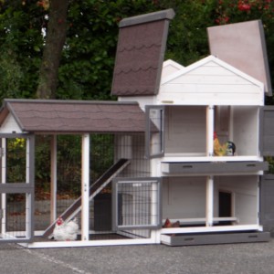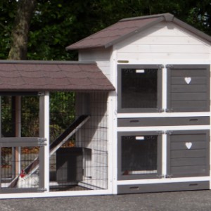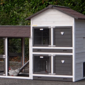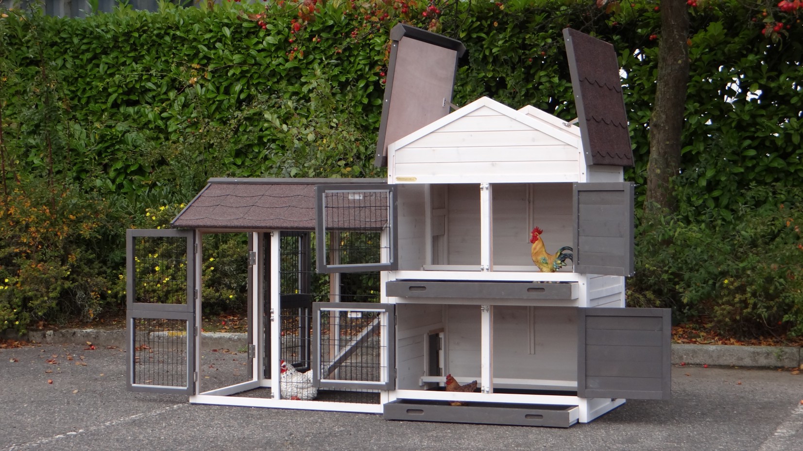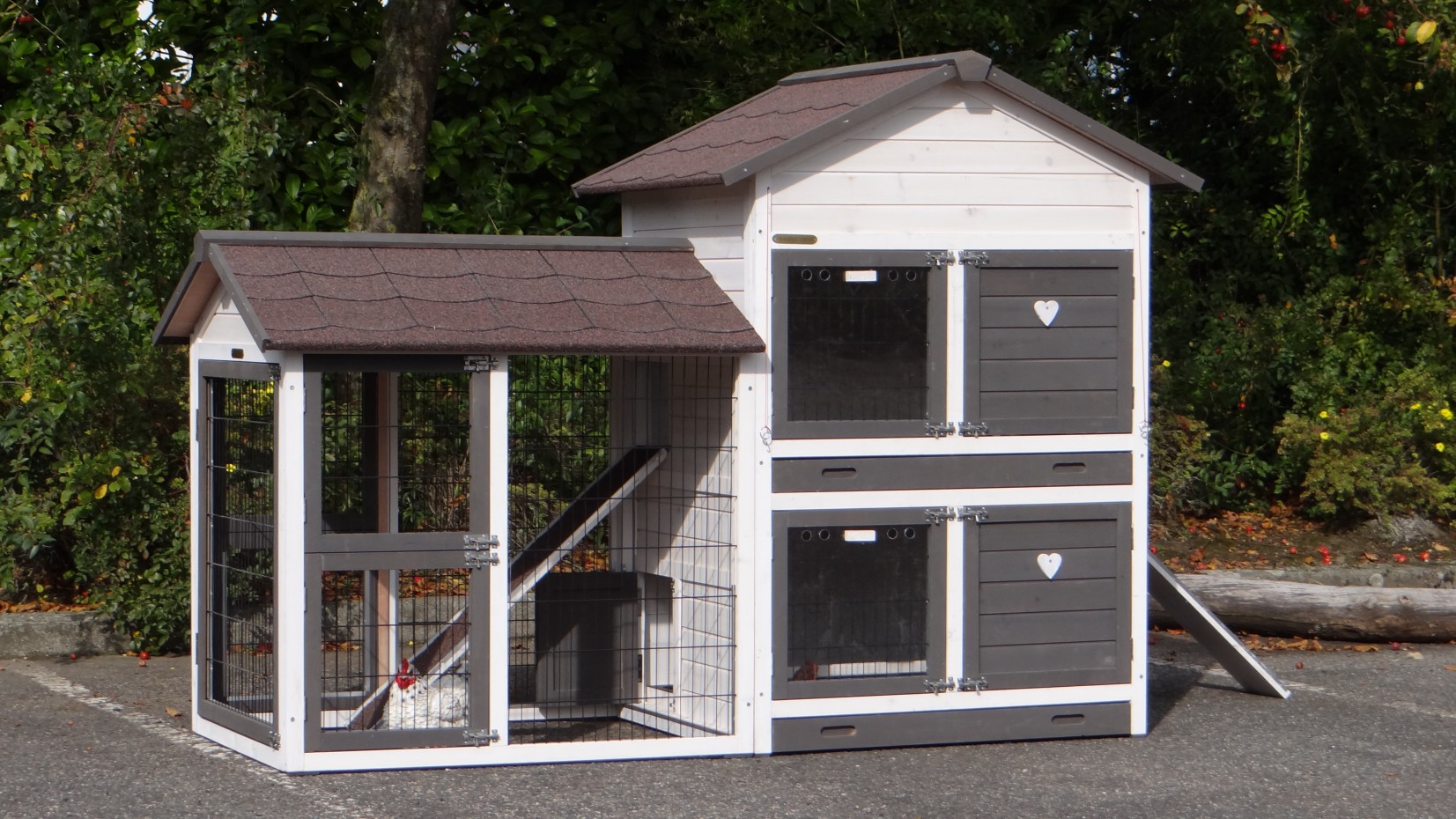 Le bois utilisé pour le loft est un produit naturel unique qu'a été produit dans le pays d'origine, après une sélection rigoureuse, dans une manière traditionelle. C'est caractéristique et unique à tous égards. Ce produit en bois a été un traitement manuel. Aucune pièce de bois ne possède la même forme, la même structure ou la même couleur, de sorte que les nuances de couleur sont inévitables, même dans un morceau de bois. Les fissures dues au vent, les craquelures, les imperfections et la présence de gros et de petits noeuds témoignent de leur origine et de leurs années de croissance. Les bosses sont généralement mises à jour manuellement avec du bois. Grâce à leur utilisation et à l’influence de la lumière, les nouveaux maisons pour animaux auront une couleur plus chaude au fil du temps. Les différences de couleur au modèle d'exposition sont donc possibles. L'enclos pour animaux est munie d'un fini antitache dans les couleurs comme sur la photo. Vous devez encore décaper le bois pour éviter les moisissures et la pourriture. Vous pouvez facilement commander des taches directement.