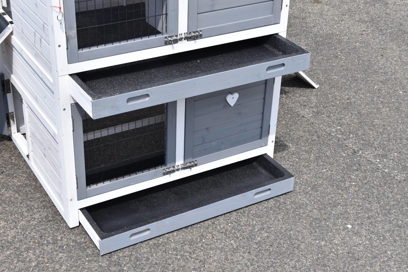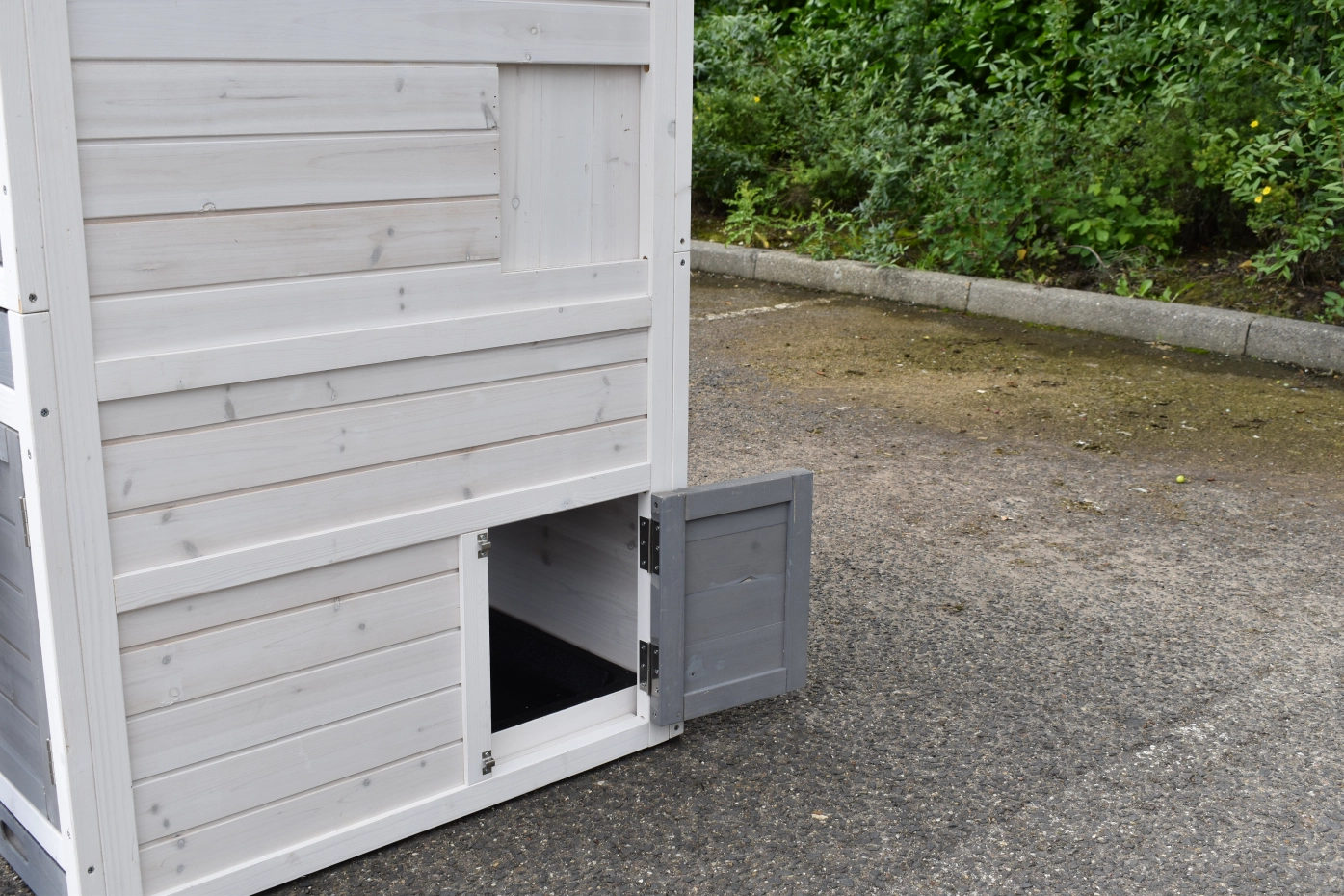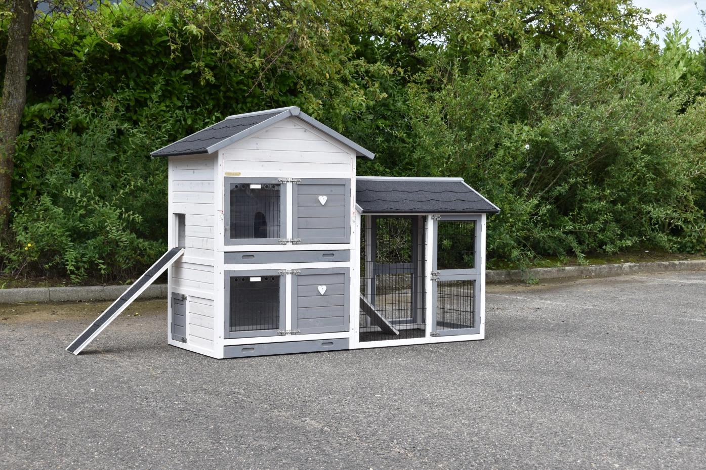 Il est soigneusement fini et dispose d’un grenier de rangement pratique au-dessus de l’abri nocturne ainsi que de deux perchoirs.