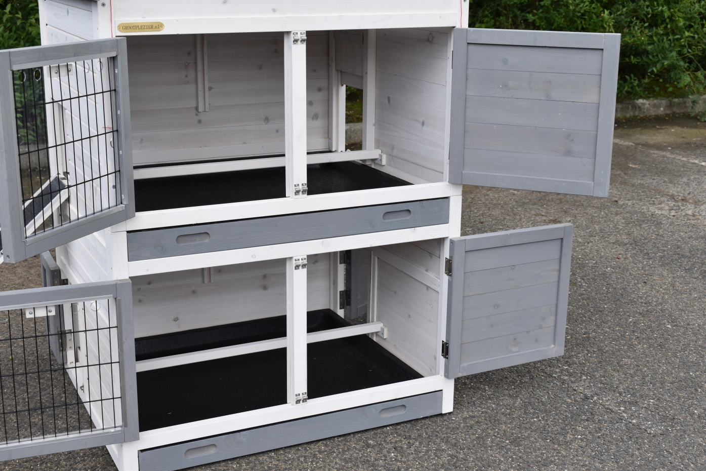 Il est conseillé de traiter périodiquement les charnières et les serrures avec un spray en silicone ou un spray pour serrures pour éviter la rouille et la corrosion. Si l'animal n'est pas dans un endroit abrité, nous vous conseillons d'ancrer l'enclos.