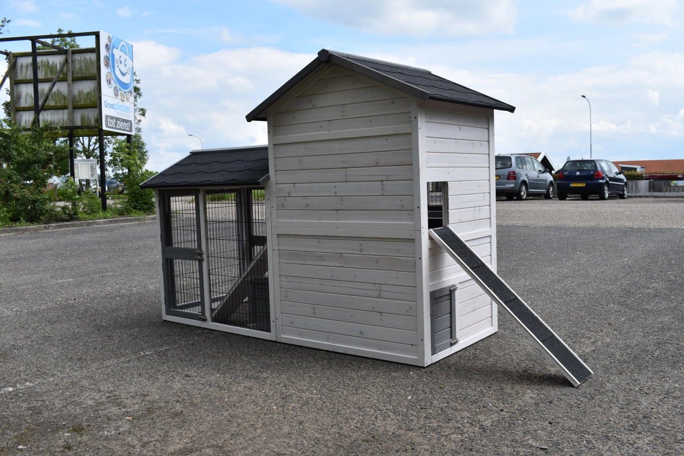 Ce poulailler pratique comprend deux compartiments nocturnes séparés et verrouillables, et les enclos sont également accessibles individuellement.