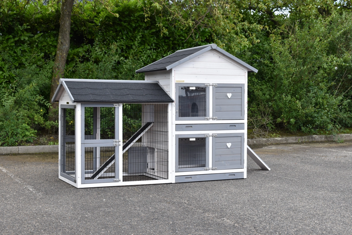 Il est soigneusement fini et dispose d’un grenier de rangement pratique au-dessus de l’abri nocturne ainsi que de deux perchoirs.