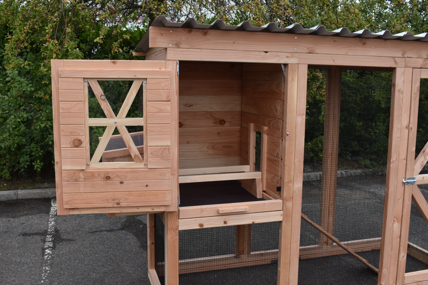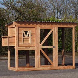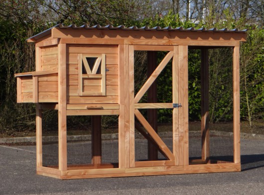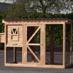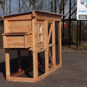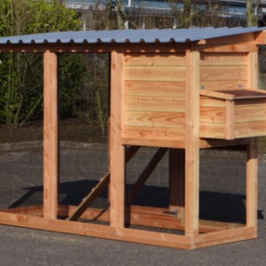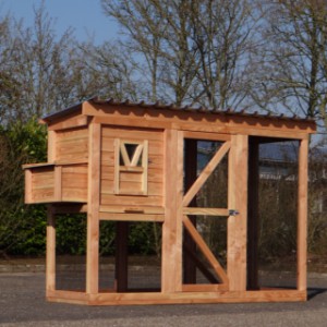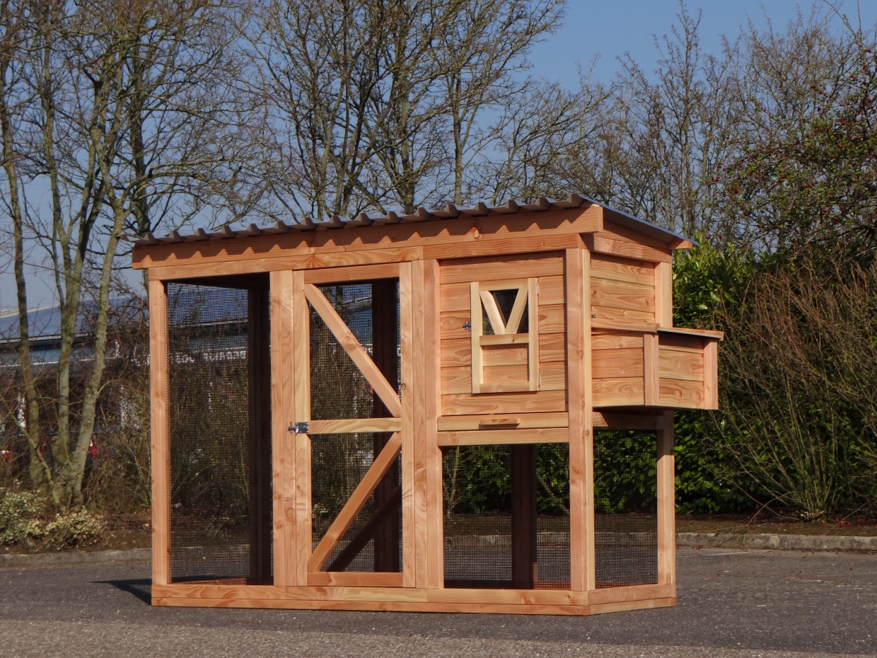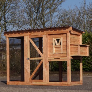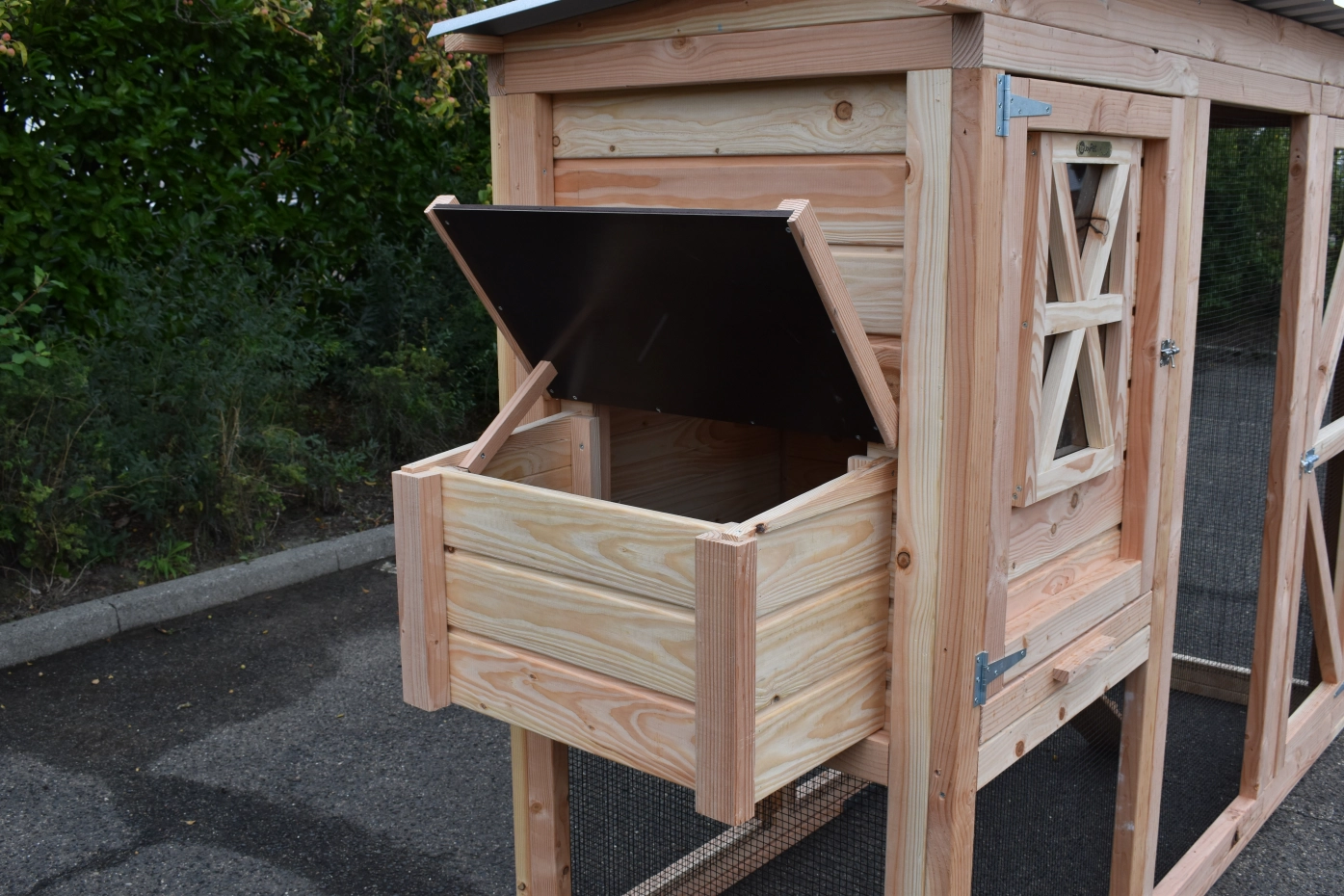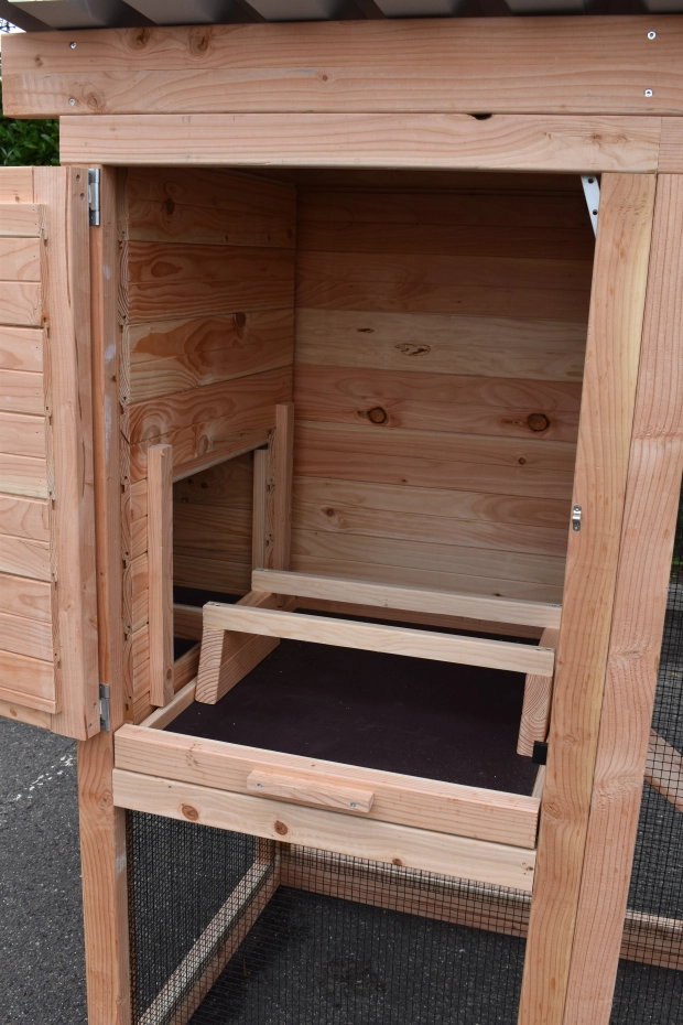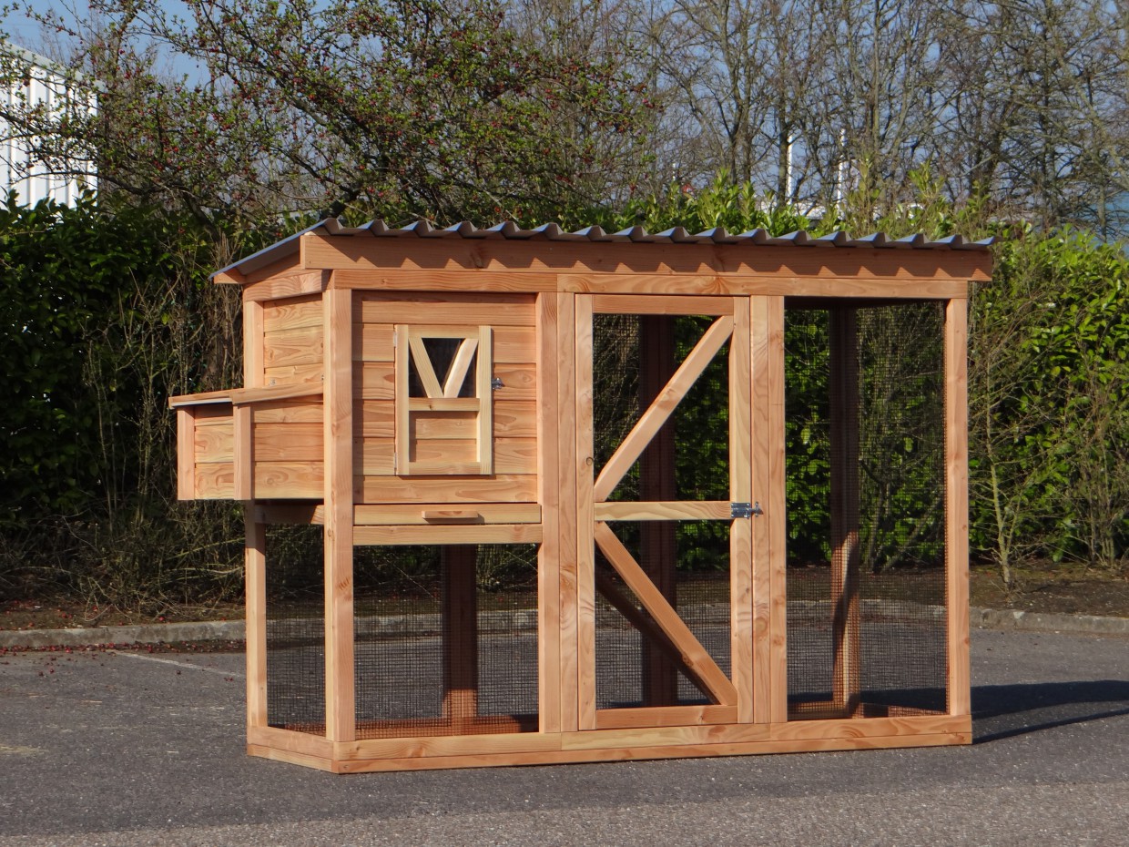 Ce poulailler a été construit en beau bois de Douglas. Ce poulailler contient une grande porte pour aller à l'enclos. Le nichoir est équipé avec des perches, un tiroir et un pondoir pratique. Le pondoir a une toiture en charnière.