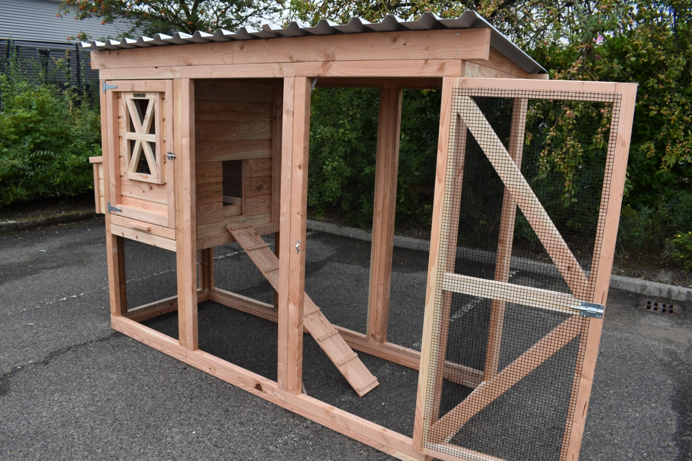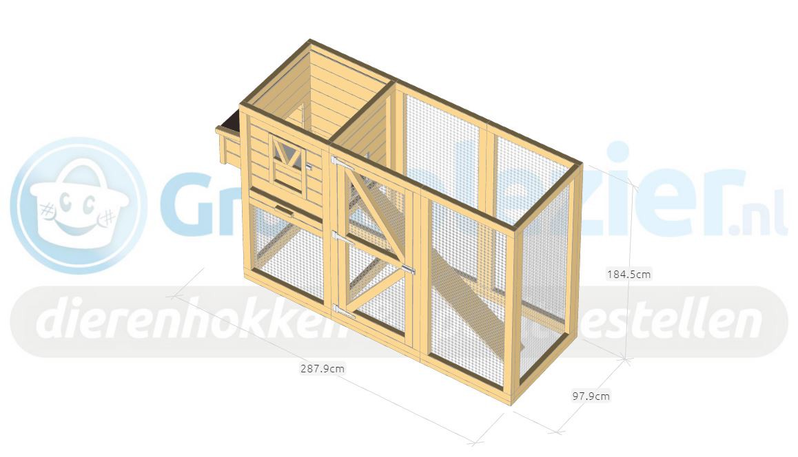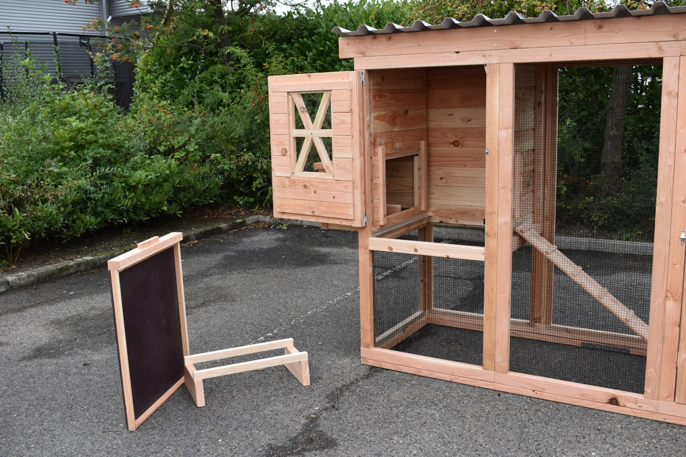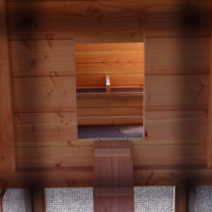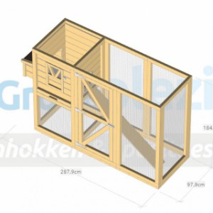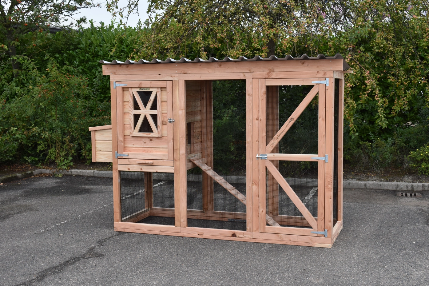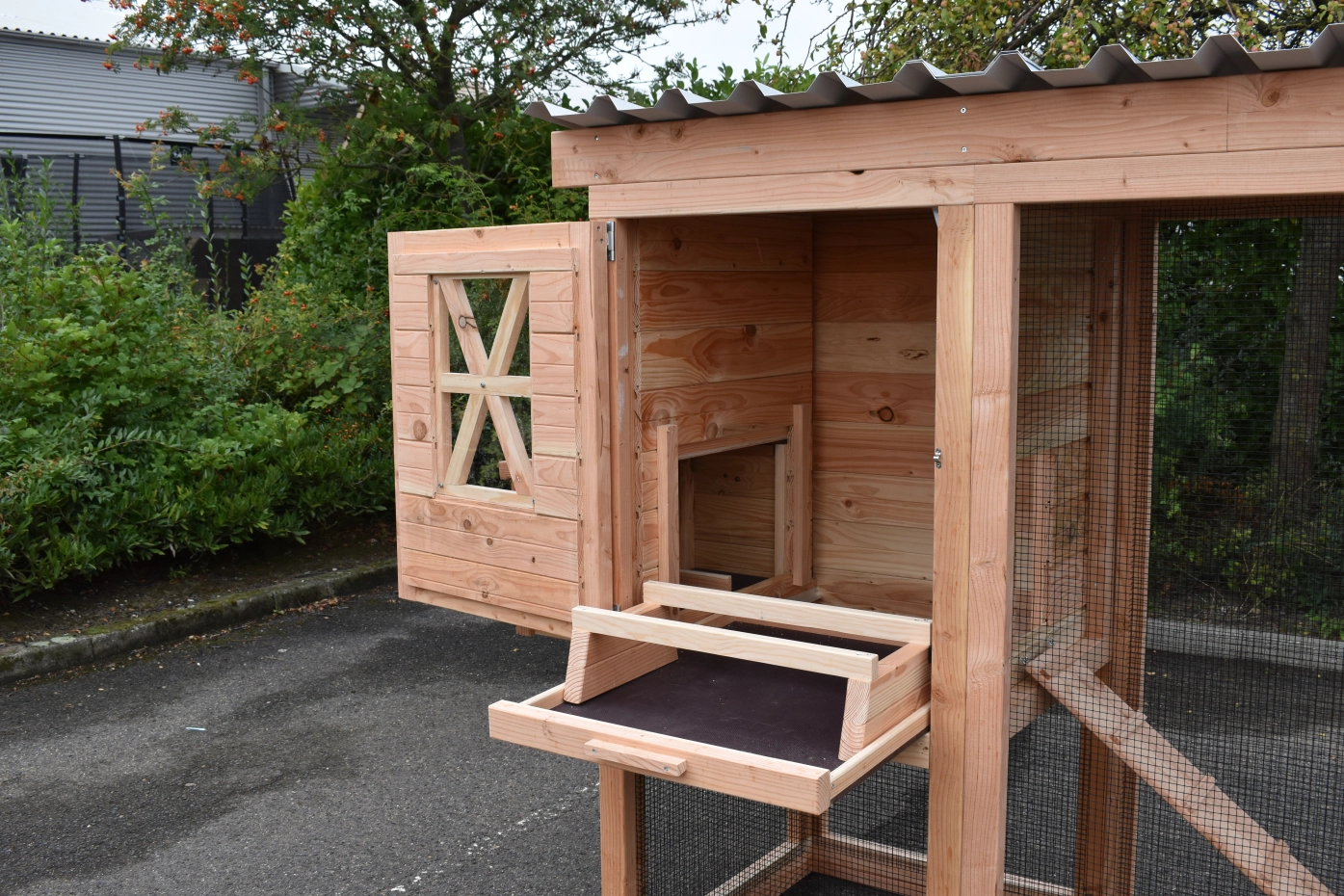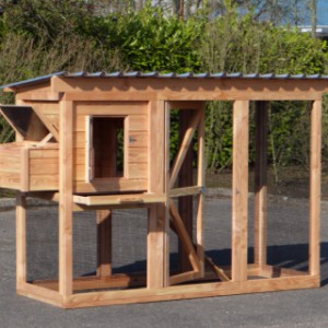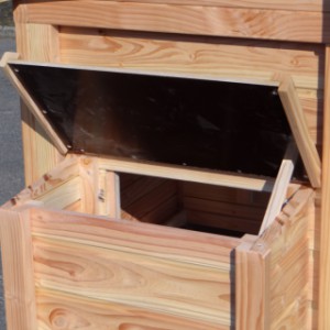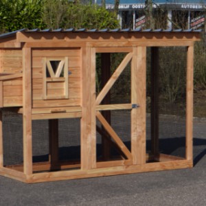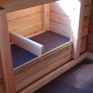 Ce poulailler a été construit en beau bois de Douglas. Ce poulailler contient une grande porte pour aller à l'enclos. Le nichoir est équipé avec des perches, un tiroir et un pondoir pratique. Le pondoir a une toiture en charnière.