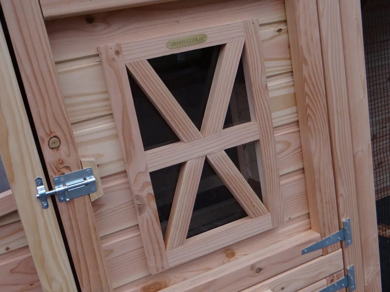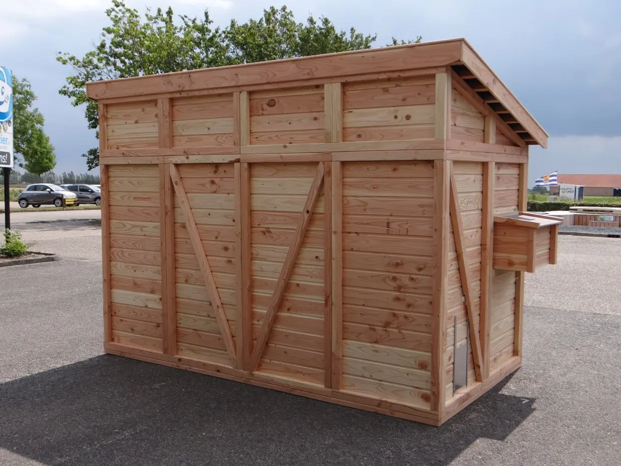 - En bois de Douglas, avec des cadres de 68x44mm, des planches avec un épaisseur de 18mm. Même sans traitement du bois, le bois est durable pour 15 ans, mais le bois se devient gris vite si vous n'utilisez pas des huile pour le Douglas.