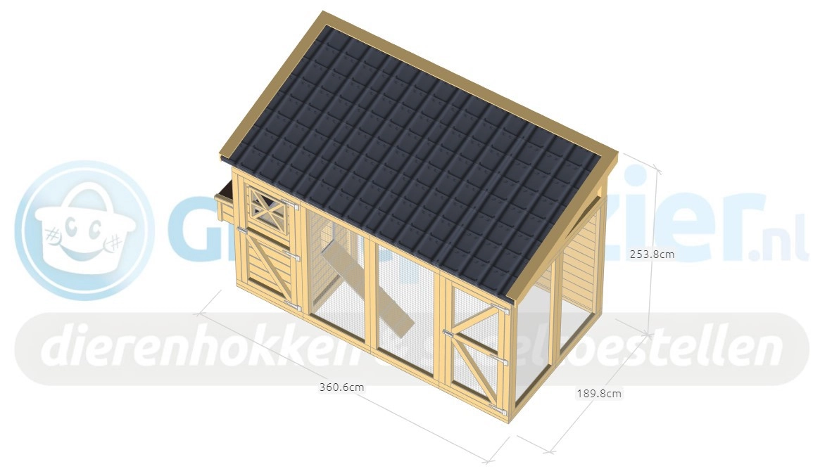 Poulailler Flex 4.2 est un grande poulailler. Dans le poulailler fermé sont perches est elle est étendue avec une pondoir. Le poulailler a une grande porte dans l'enclos. Dans l'enclos est un porte coulissante, pour donner aux poulets un enclos libre. Dans la nichoir est une tiroir, pour un nettoyage facile.