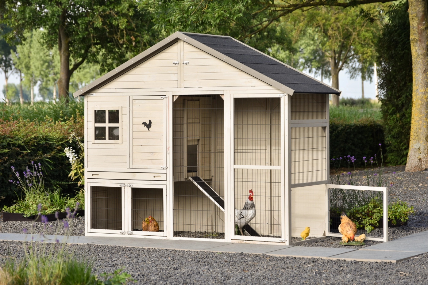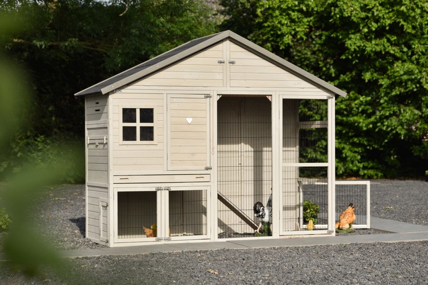 Le poulailler comprend également un enclos et un abri de nuit avec deux perchoirs. Sous le toit se trouve un grand espace de rangement accessible par l’avant. Le poulailler Holiday Large est vraiment un excellent poulailler, doté de grandes portes de tous les côtés. Il convient pour héberger environ 6 à 10 poules. La porte en bois est équipée d’un cœur blanc standard, mais celui-ci peut être remplacé par une jolie figurine d’animal.