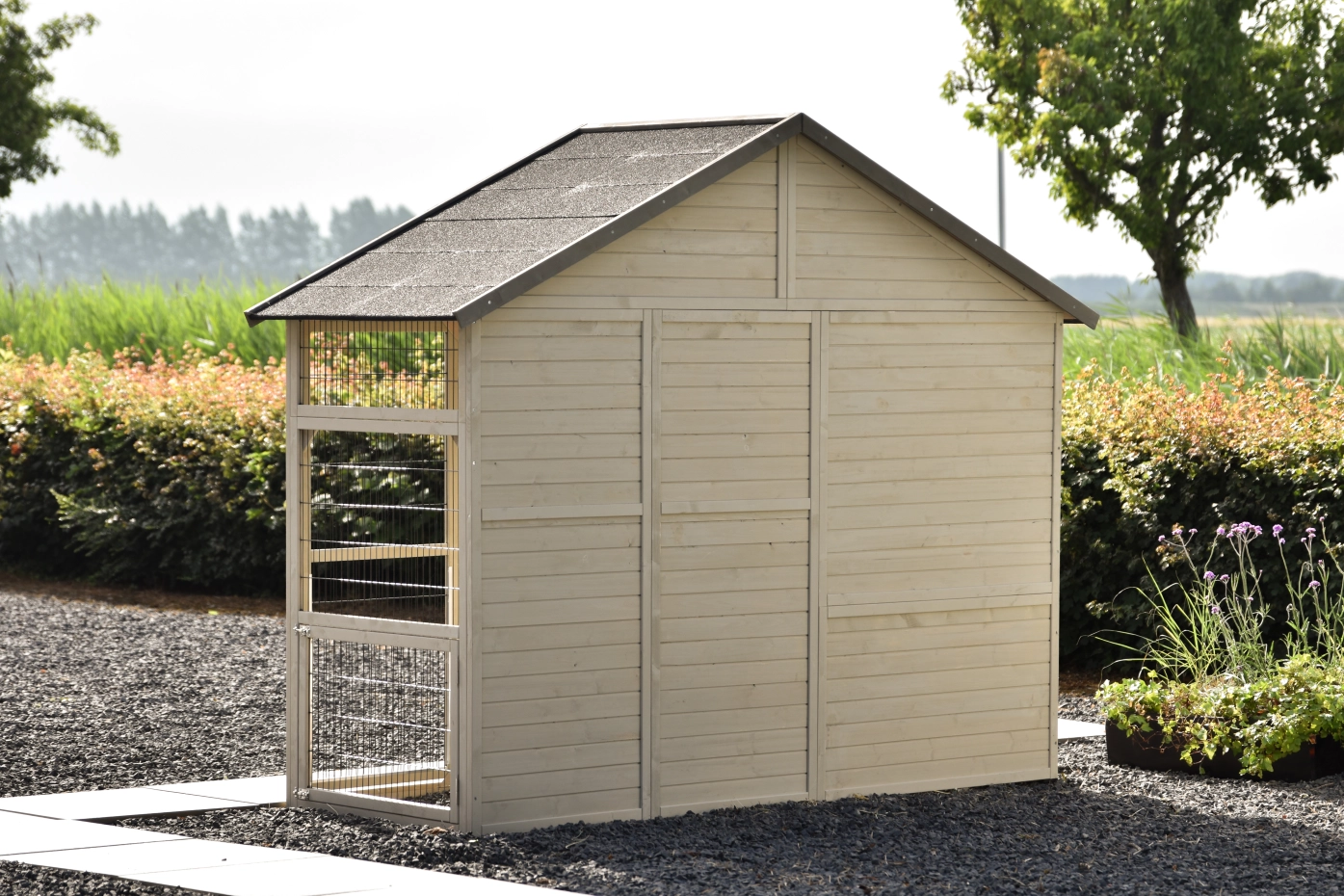 Le grand poulailler Holiday Large est beau, pratique et spacieux. Ce poulailler fonctionnel possède une paroi arrière en bois massif et une paroi latérale fermée avec une petite trappe. Cela offre une protection supplémentaire aux poules.