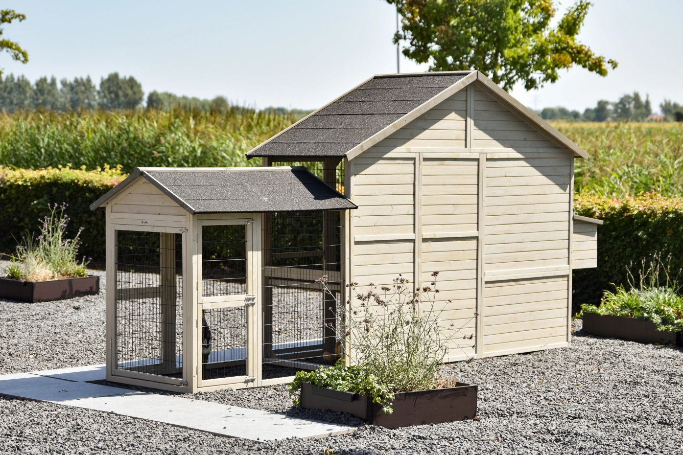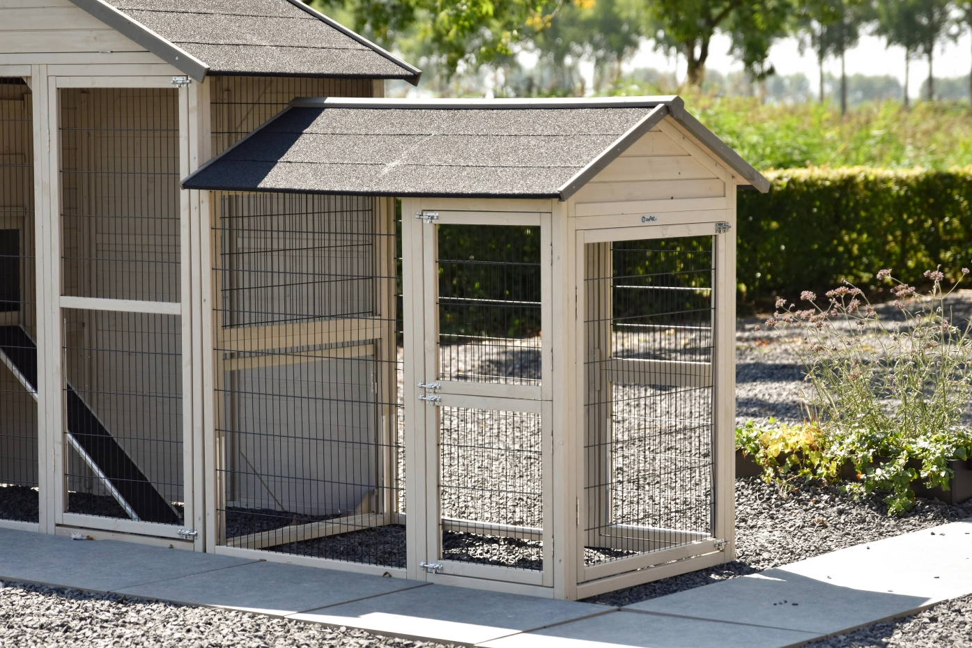 - Pour combiner enclos et poulailler, un panneau de treillis et / ou une porte doit être enlevé