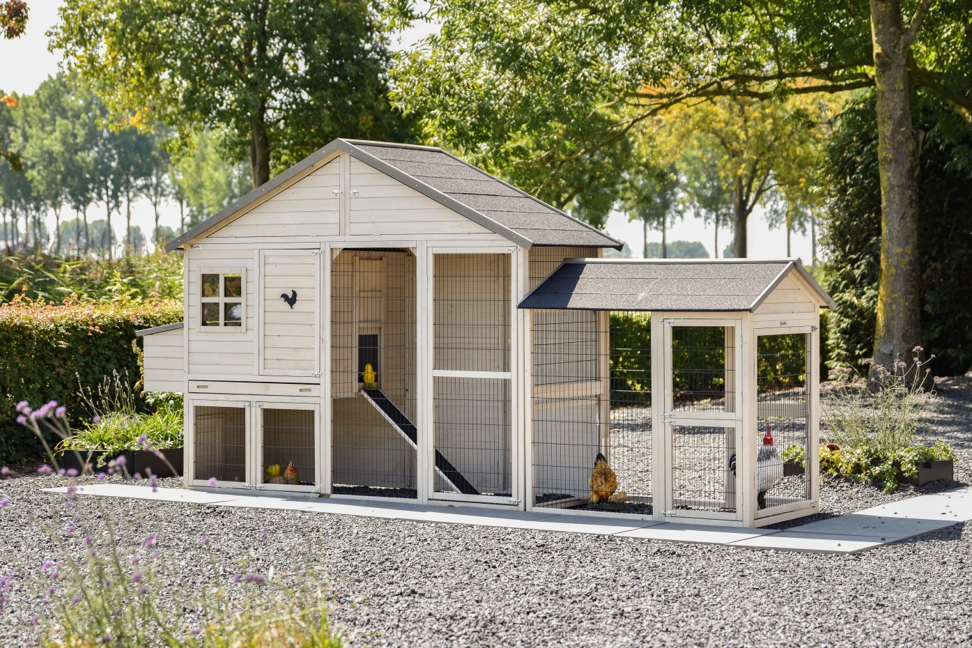 Ce poulailler est un des poulaillers le plus vendu. C'est un poulailler fort, avec une fenêtre dans le poulailler fermé. Ca c'est très pratique parce que il y a de lumière du jour dans le poulailler de nuit aussi, et vous pouvez toujours controler votre amis.Le poulailler a un poulailler fermé et un enclos. Poulailler Holiday Large est approprié pour 6 à 10 poules. Le max. dimensions sont 392x100x195cm.