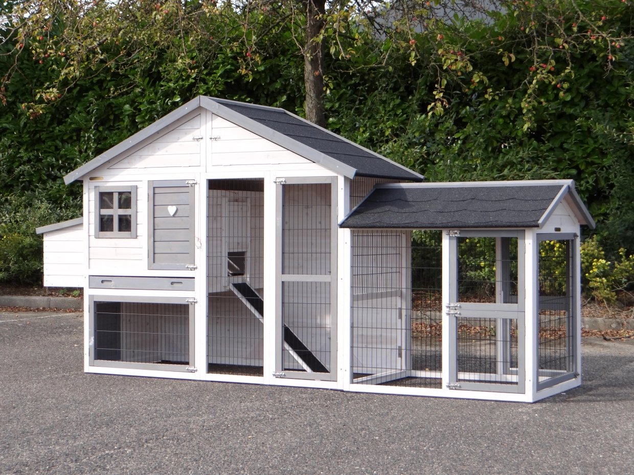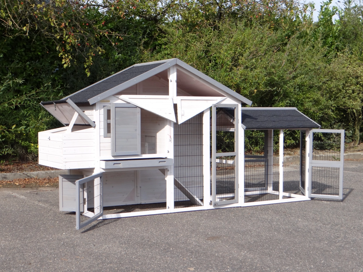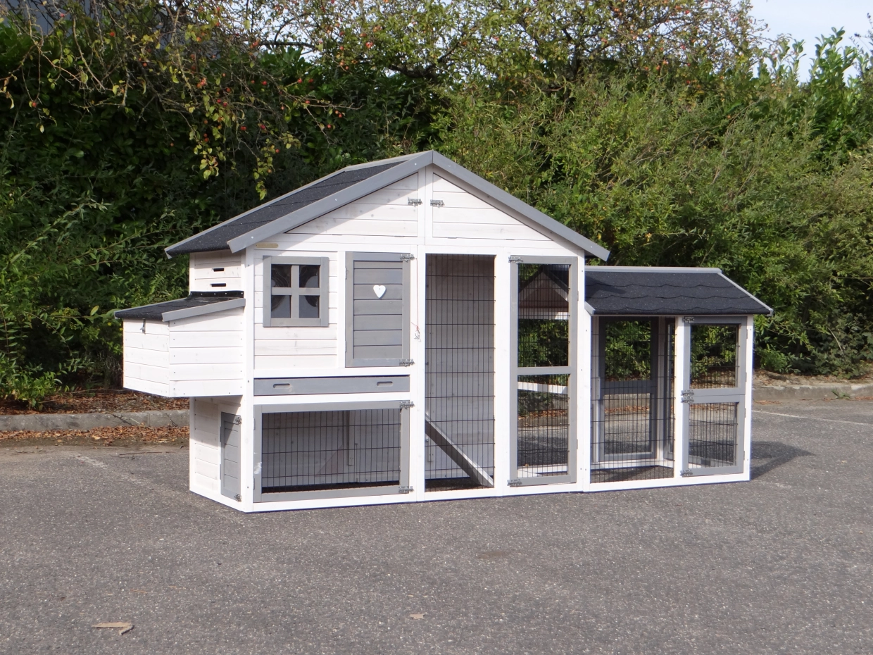 Ce magnifique poulailler est également équipé d’un pondoir sur le côté gauche.