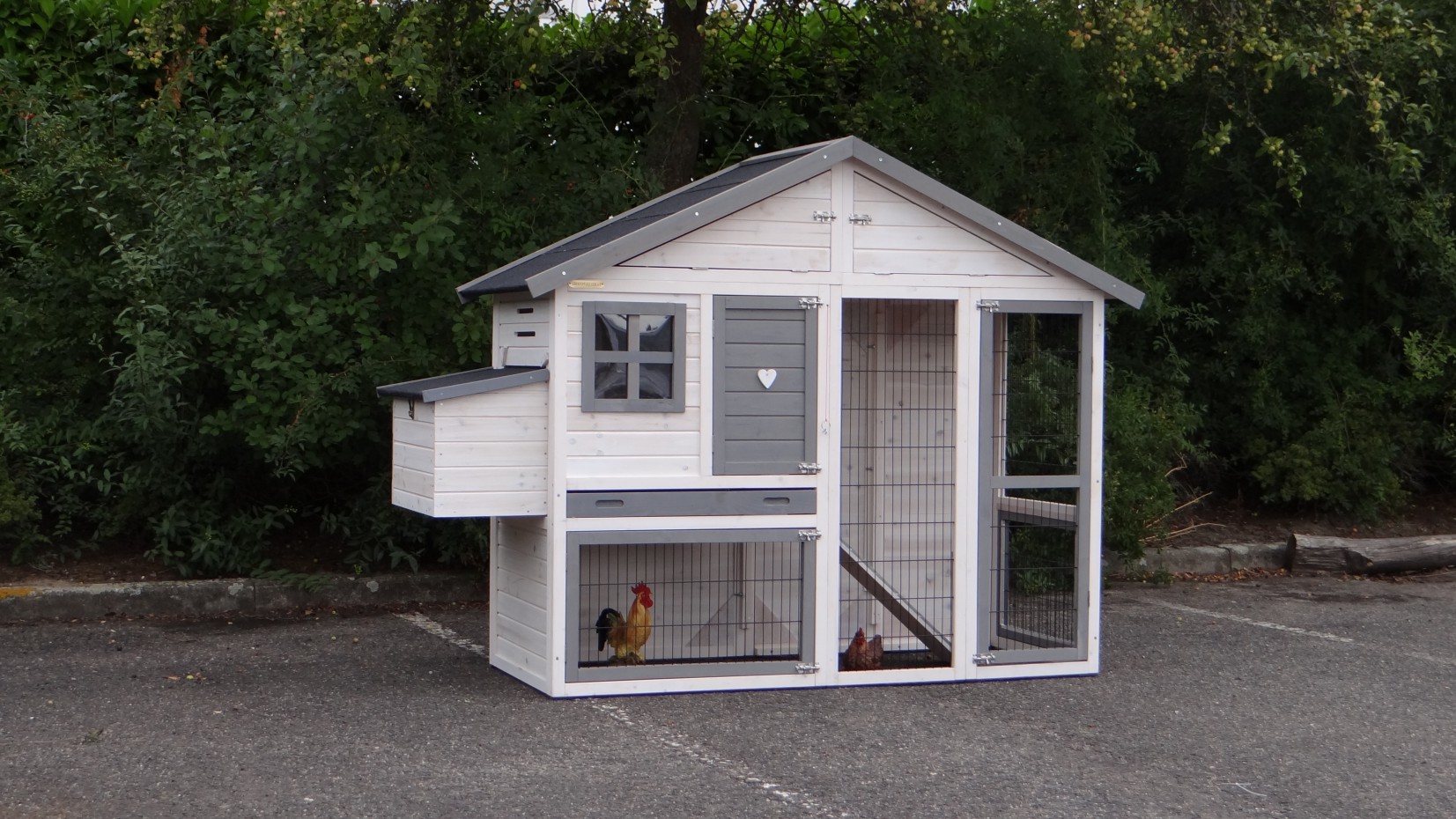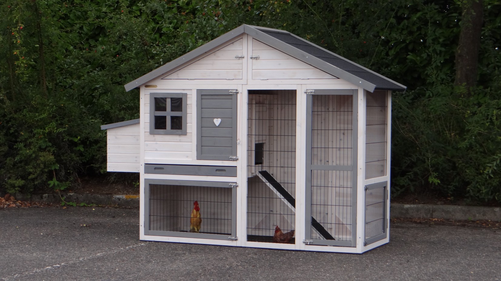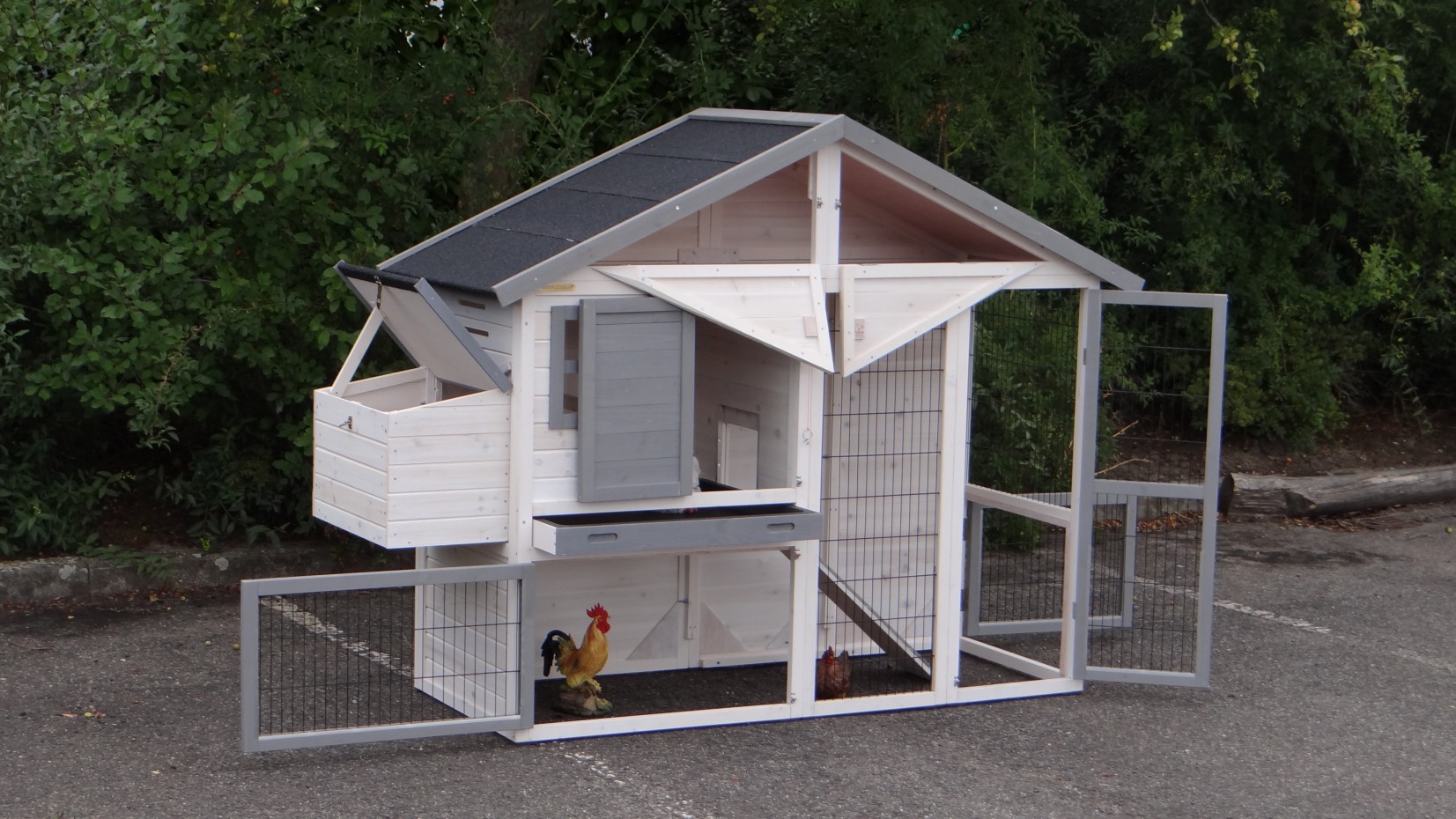 Ce poulailler en blanc-gris contient une storage sous le toit, et un pondoir ainsi que vous pouvez ramasser vos oeufs facillement. Ce poulailler a beaucoup de portes, pour une bonne accessibilité de vos poules et pour une nettoyage facille.