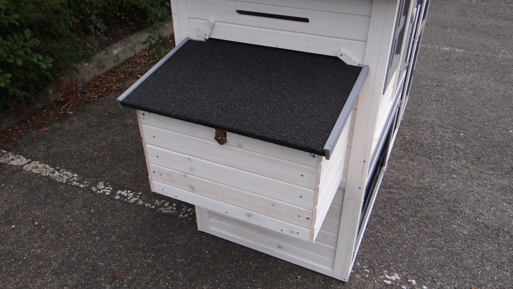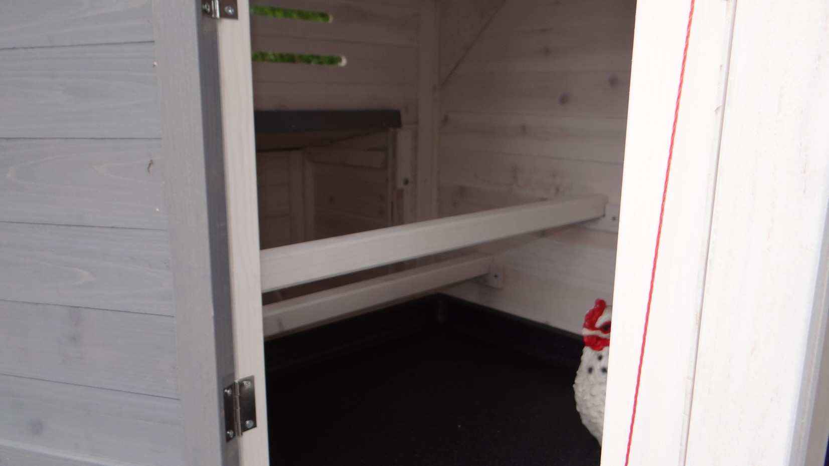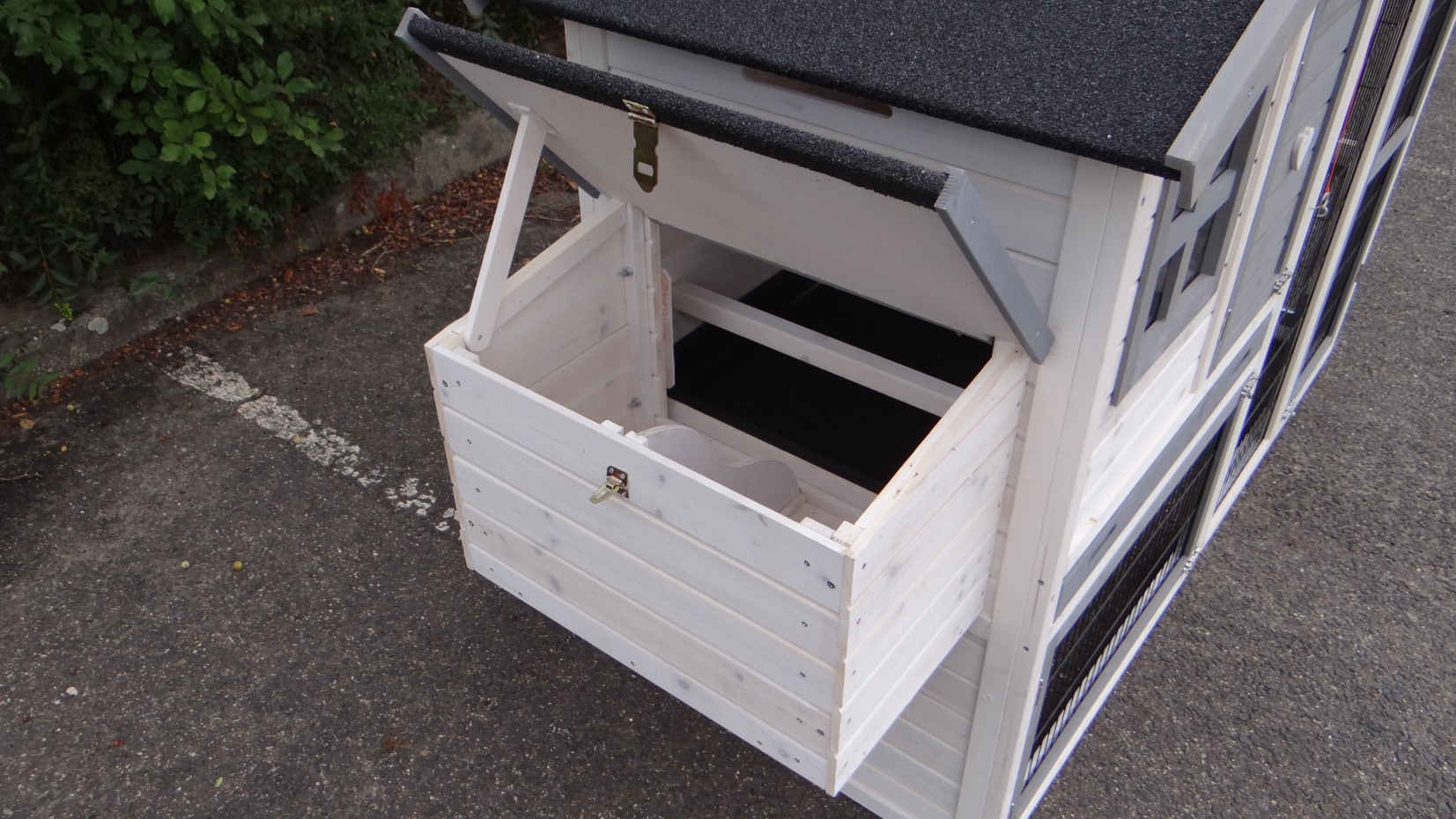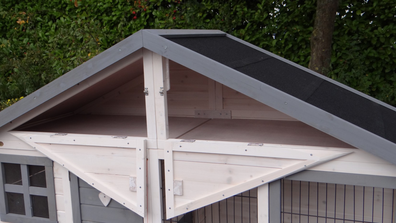 Ce poulailler en blanc-gris contient une storage sous le toit, et un pondoir ainsi que vous pouvez ramasser vos oeufs facillement. Ce poulailler a beaucoup de portes, pour une bonne accessibilité de vos poules et pour une nettoyage facille.
