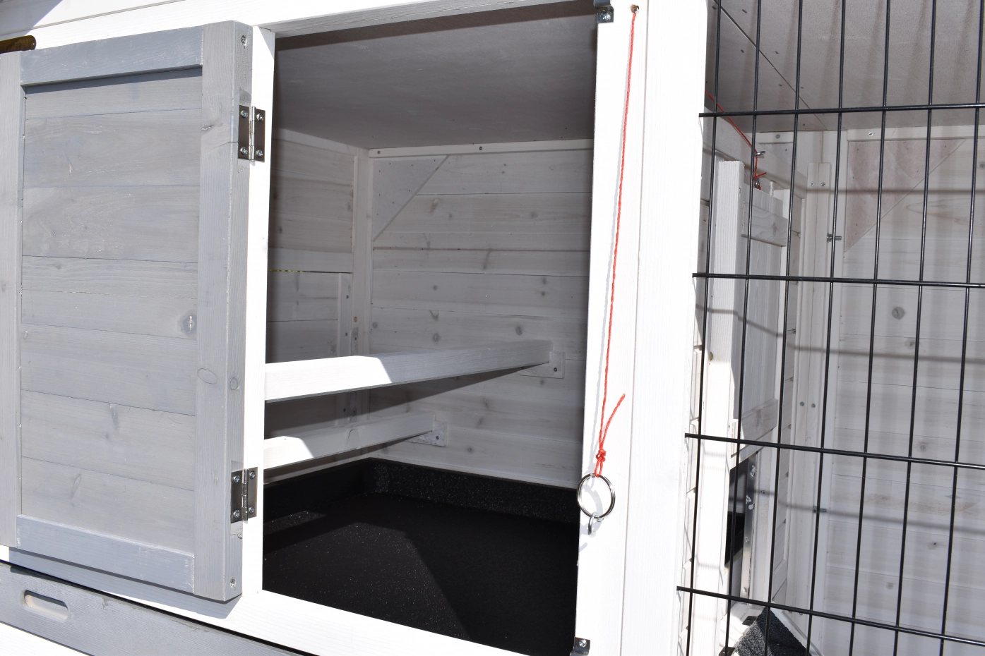 - Pour combiner enclos et poulailler, un panneau de treillis et / ou une porte doit être enlevé