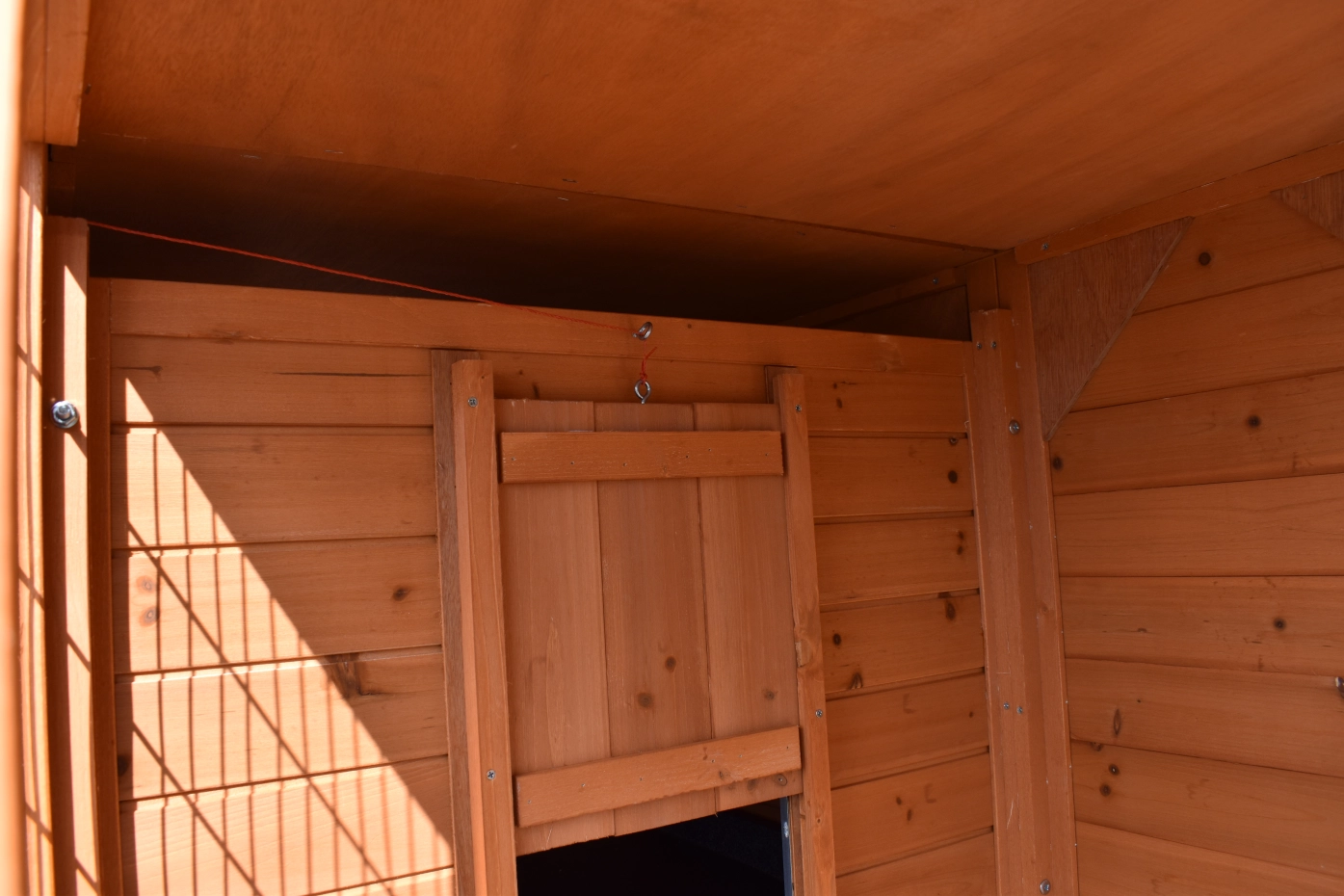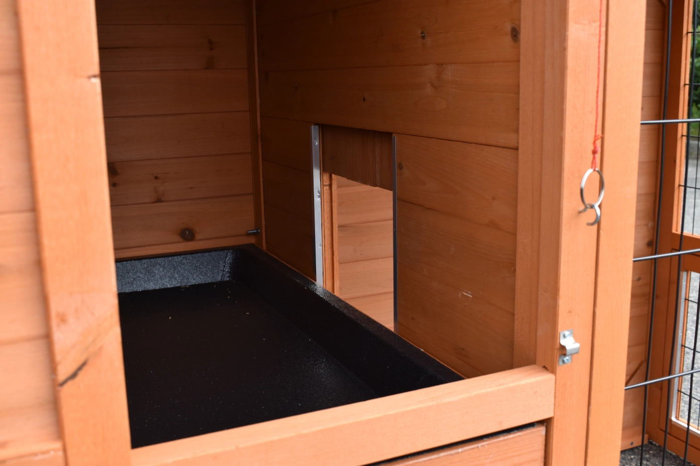 - Pour combiner enclos et poulailler, un panneau de treillis et / ou une porte doit être enlevé