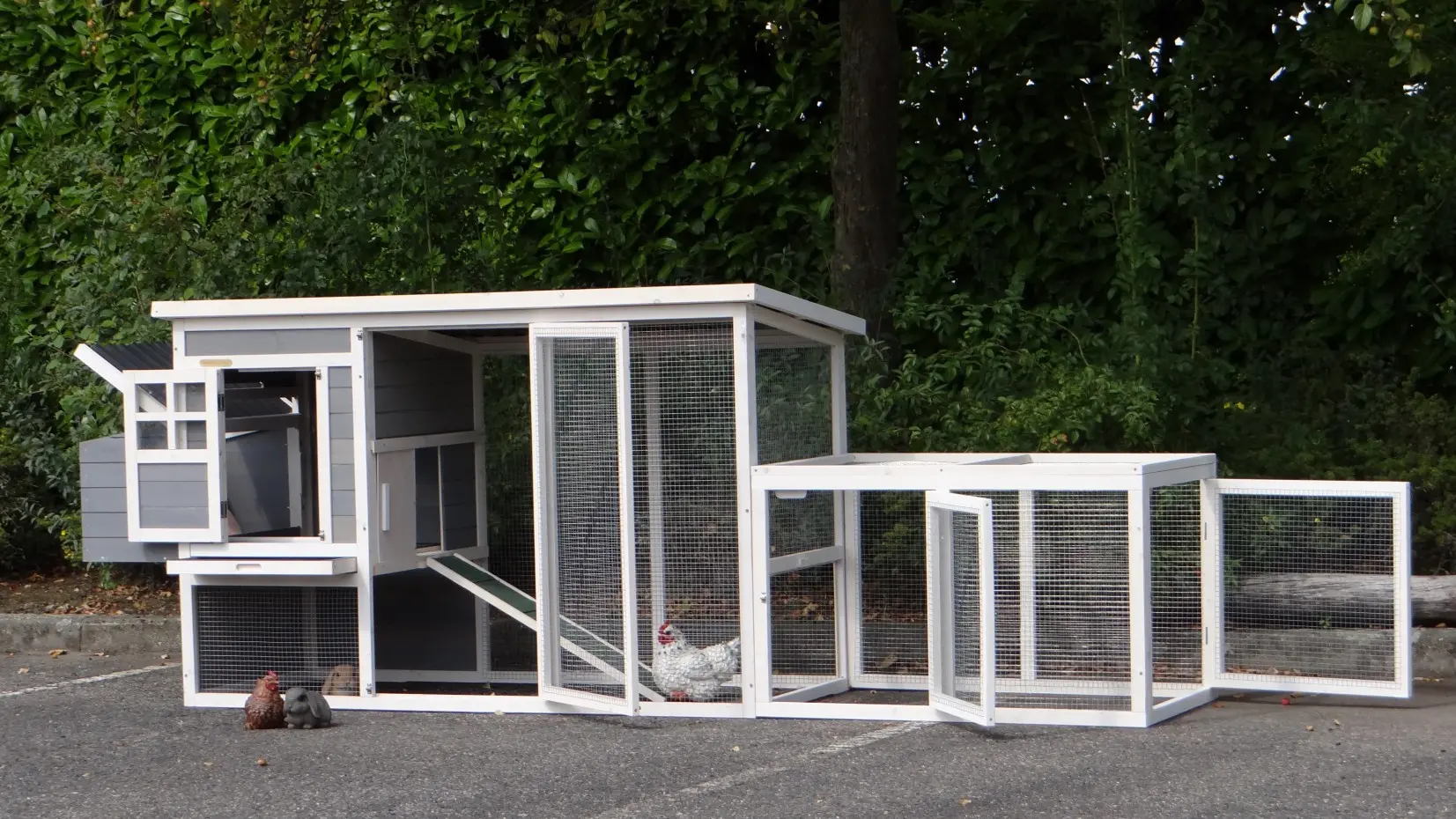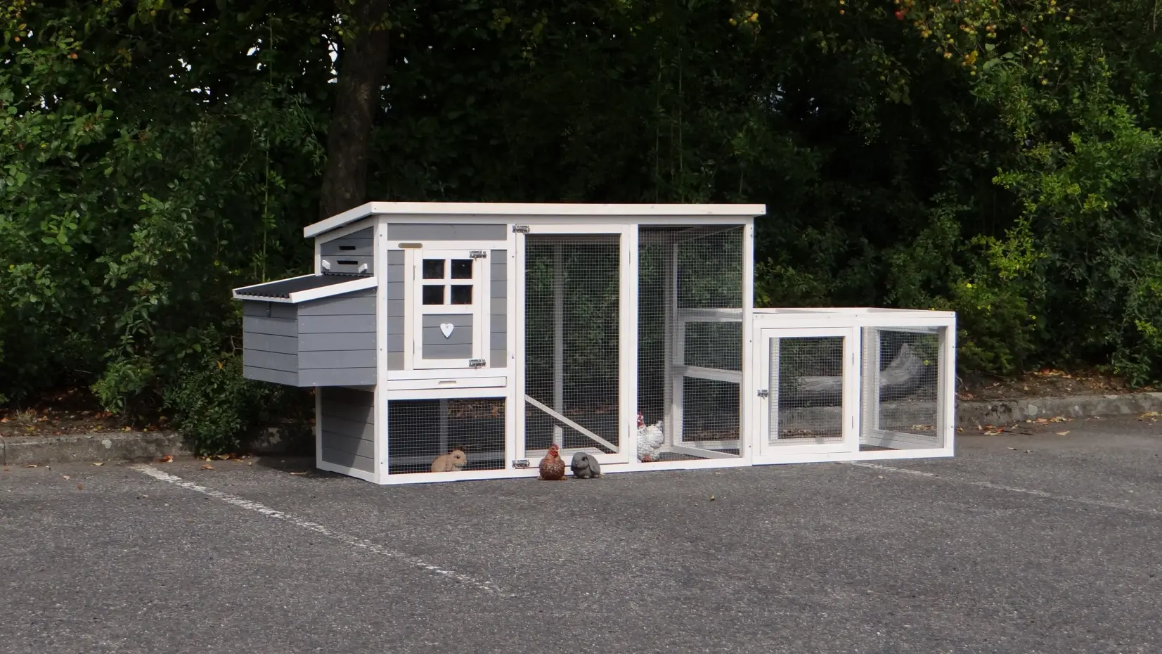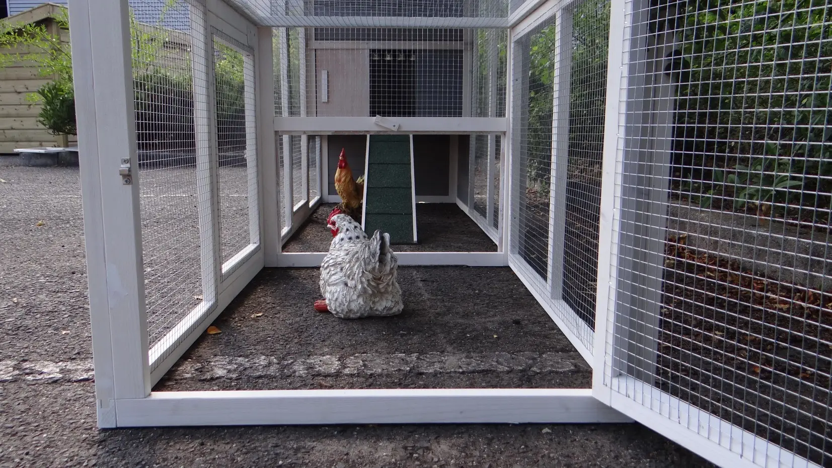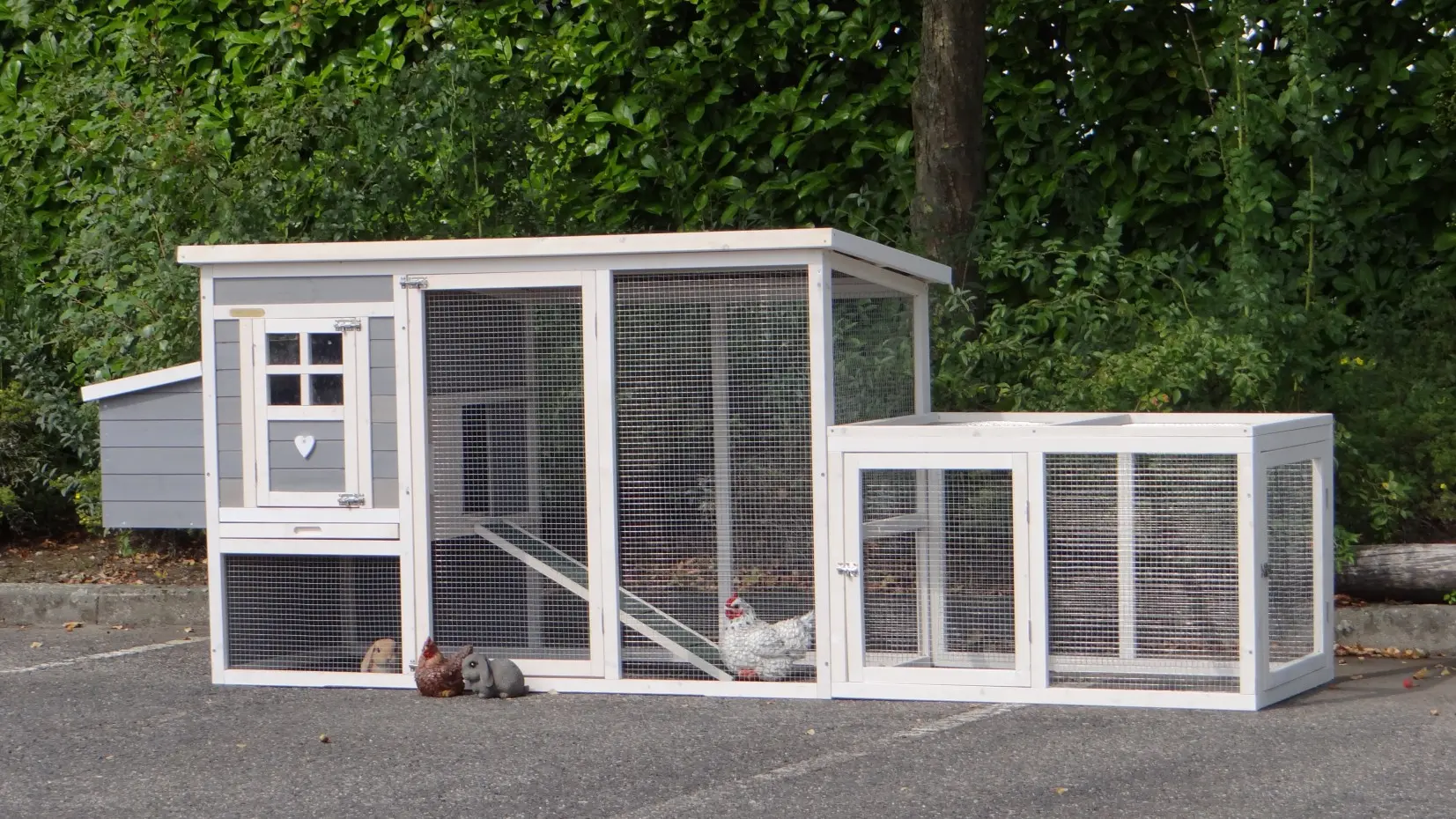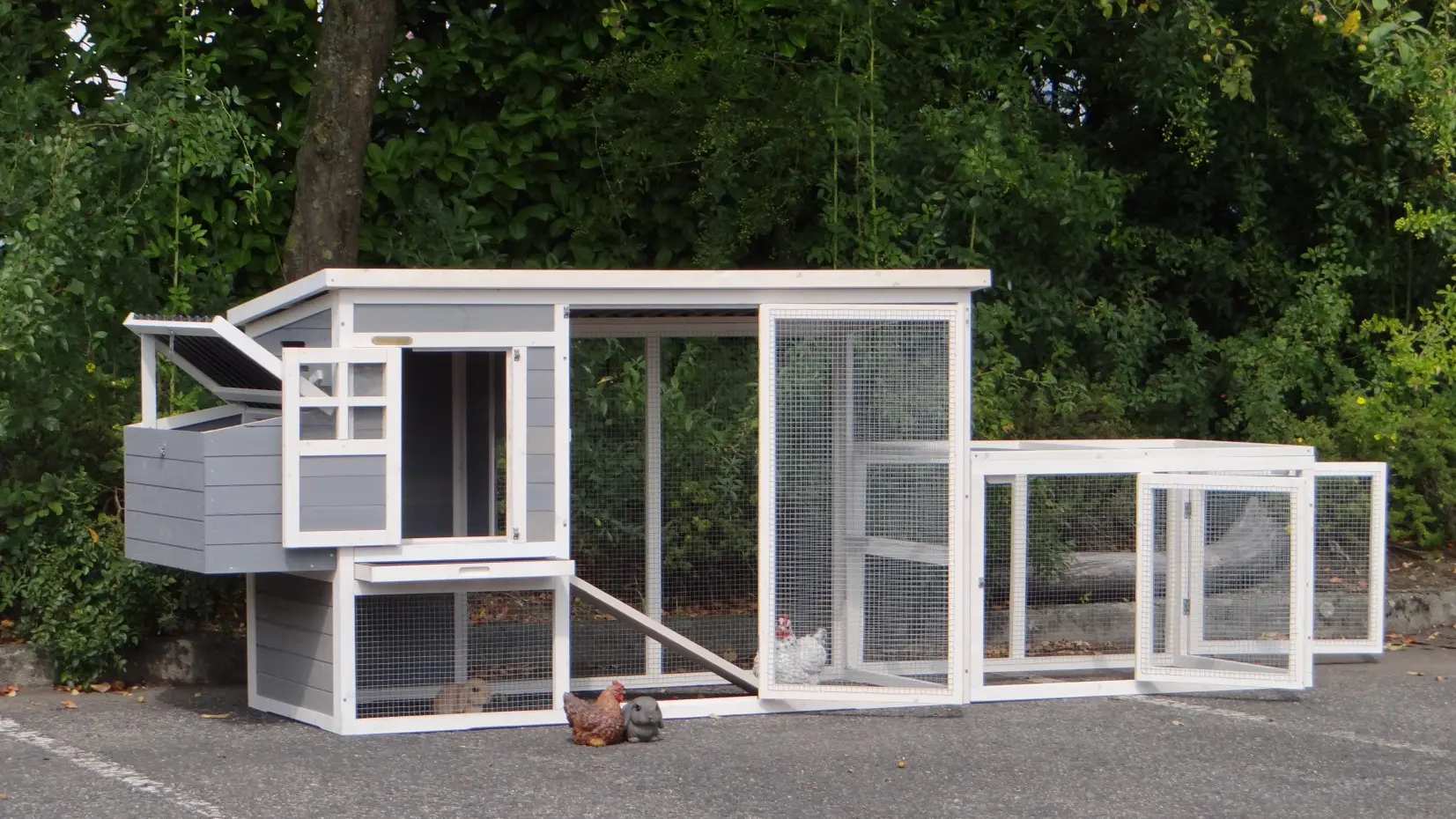 - Pour combiner enclos et poulailler, un panneau de treillis et / ou une porte doit être enlevé