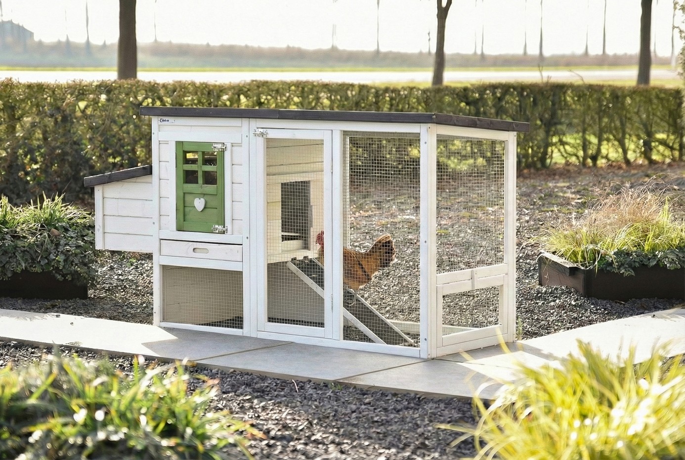 Le poulailler Noah est un abri très avantageux et esthétique avec pondoir, abri de nuit et enclos. Le poulailler Noah est équipé de portes spacieuses et d’un tiroir à déjections coulissant pratique dans l’abri de nuit, ce qui facilite le nettoyage. Noah est un poulailler compact et pratique, adapté pour 2 à 3 poules. Les dimensions maximales, toit et pondoir compris, sont de 168x65x87cm.