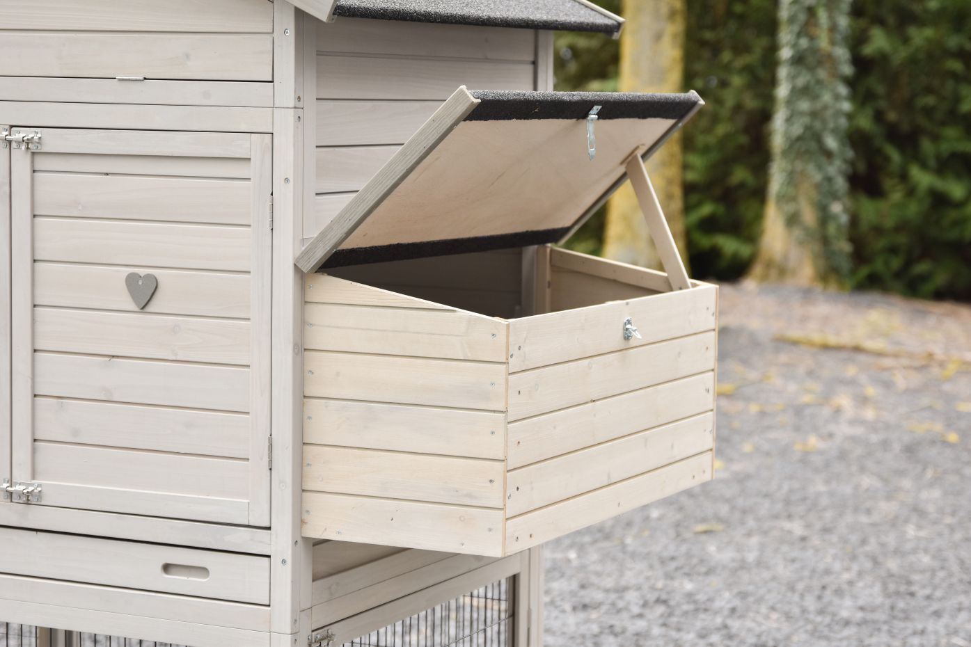 Le poulailler est équipé de deux enclos attenants : un avec toit en feutre bitumé et un avec toit grillagé, permettant à vos poules d’être à l’abri tout en profitant de l’air libre