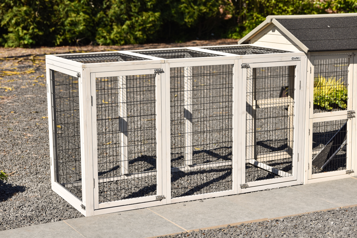 - Pour combiner enclos et poulailler, un panneau de treillis et / ou une porte doit être enlevé