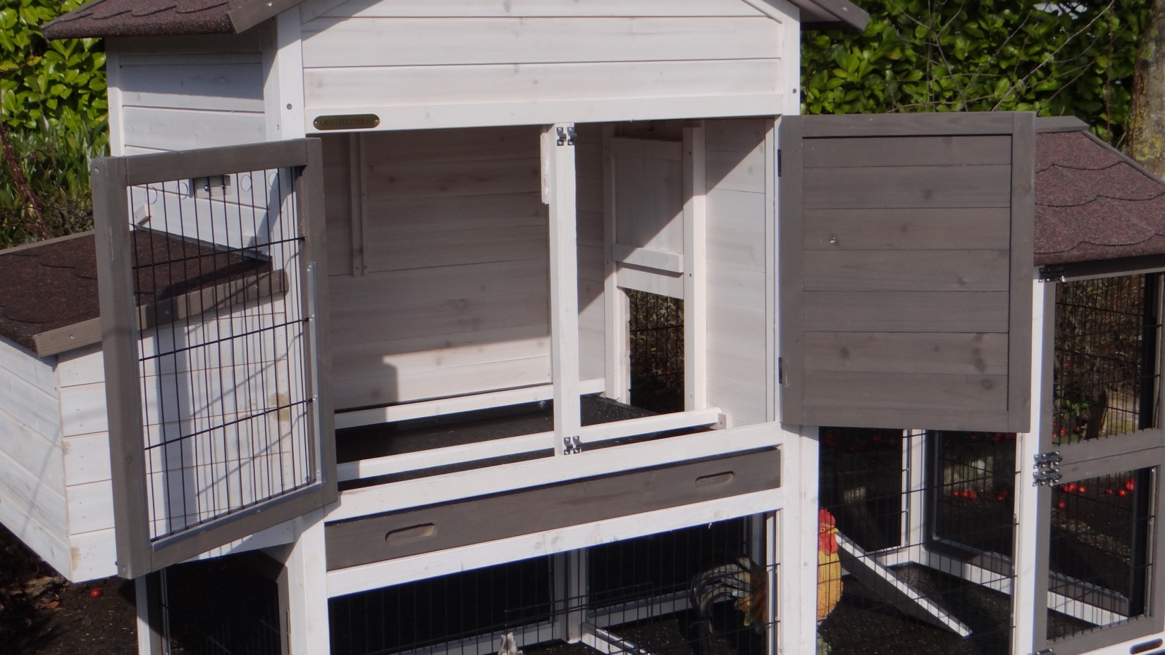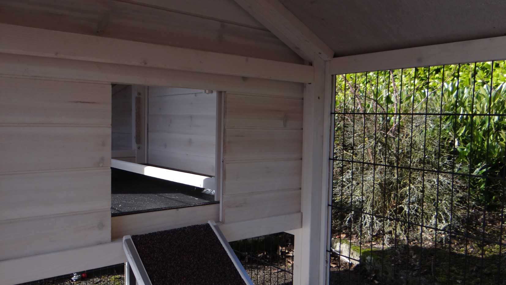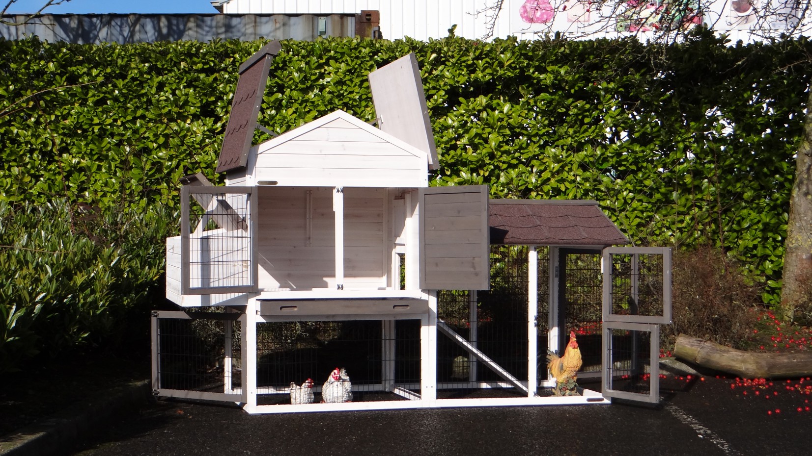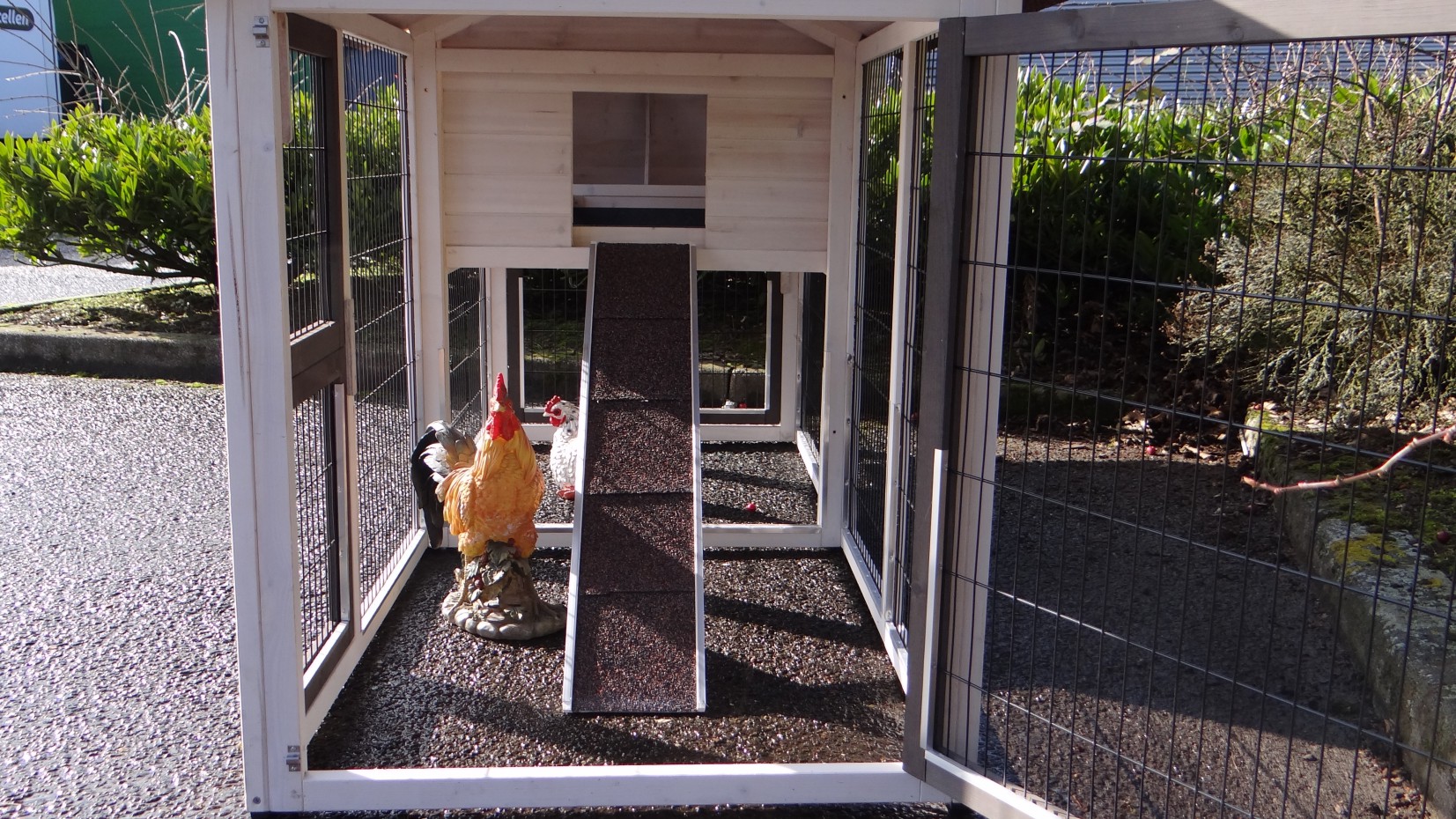 Poulailler Prestige Medium avec enclos à droite. Ce poulailler est vraiment une bonne maison pour vos poules! Vous pouvez ramasser des oeufs facillement du pondoir.