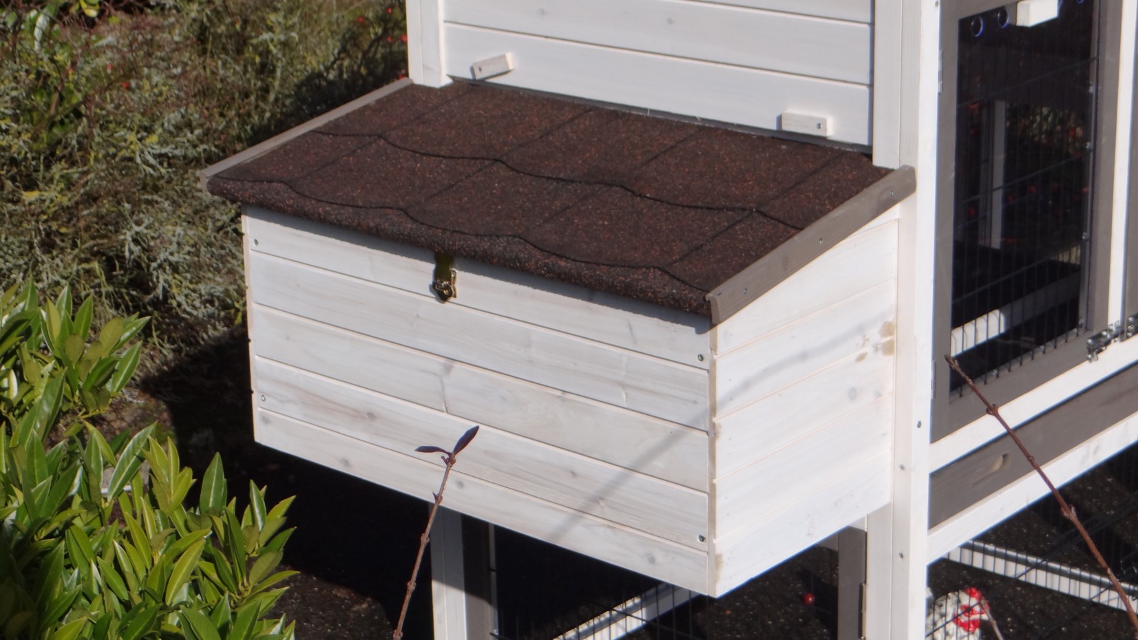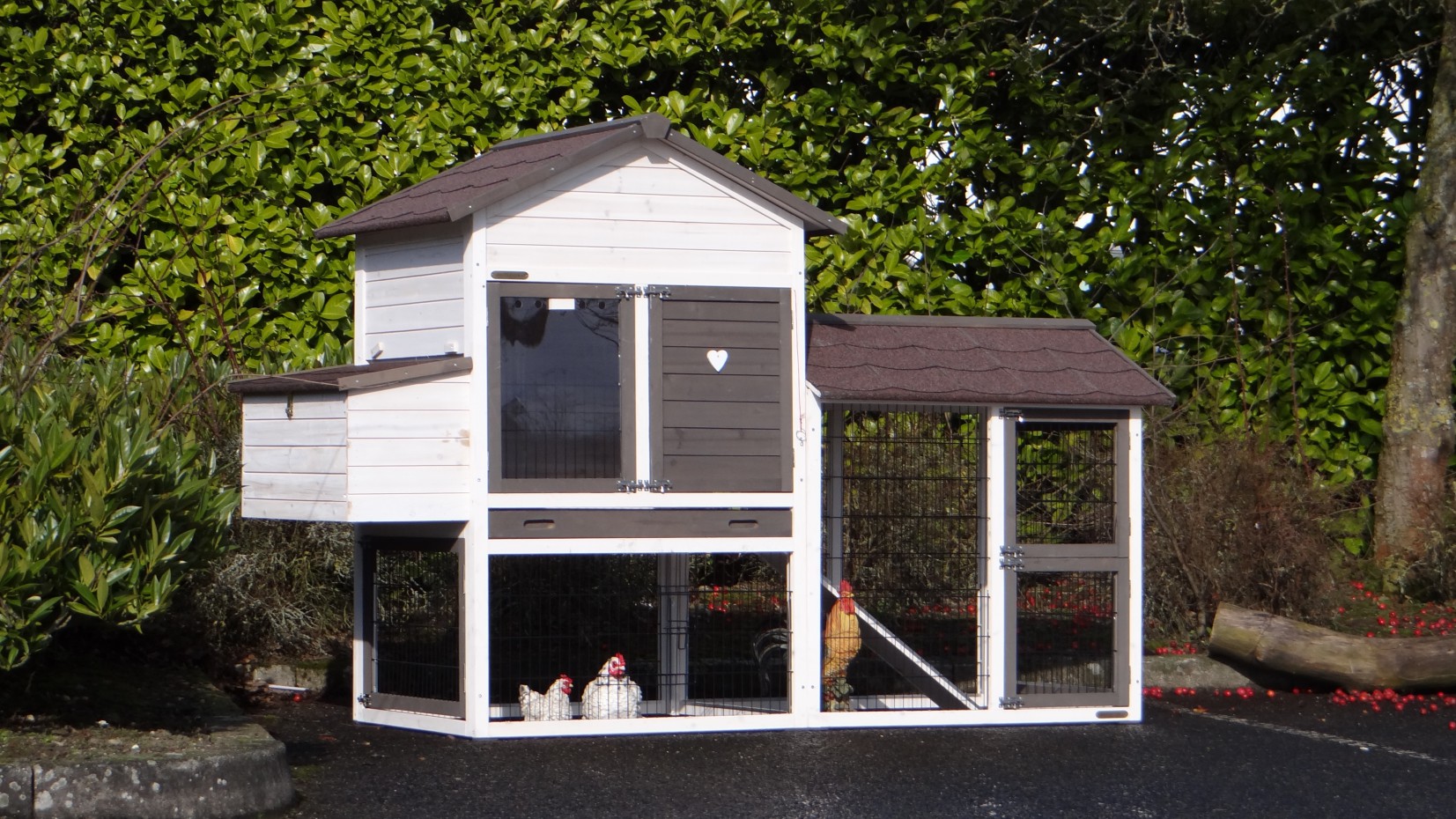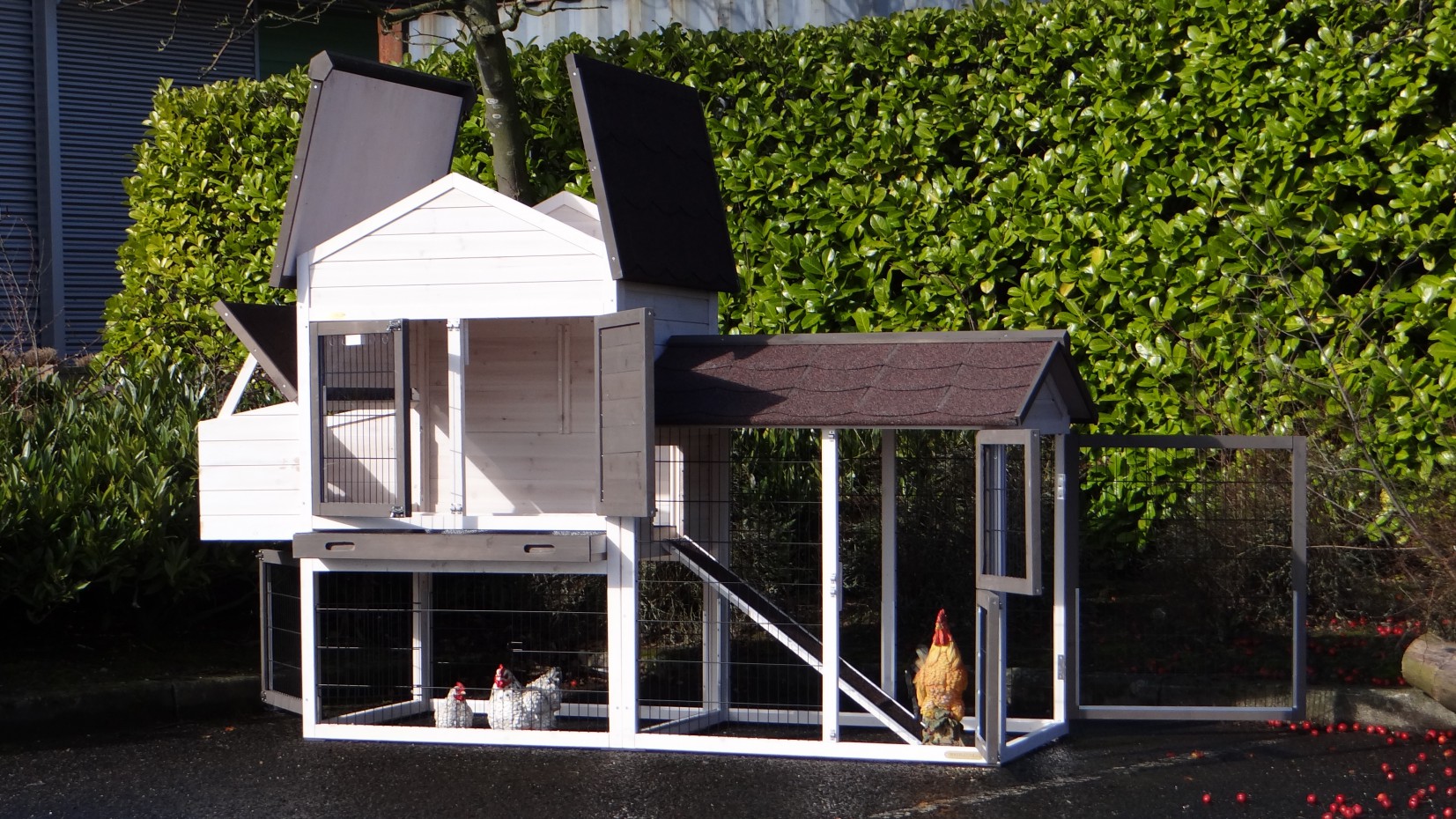 Poulailler Prestige Medium avec enclos à droite. Ce poulailler est vraiment une bonne maison pour vos poules! Vous pouvez ramasser des oeufs facillement du pondoir.
