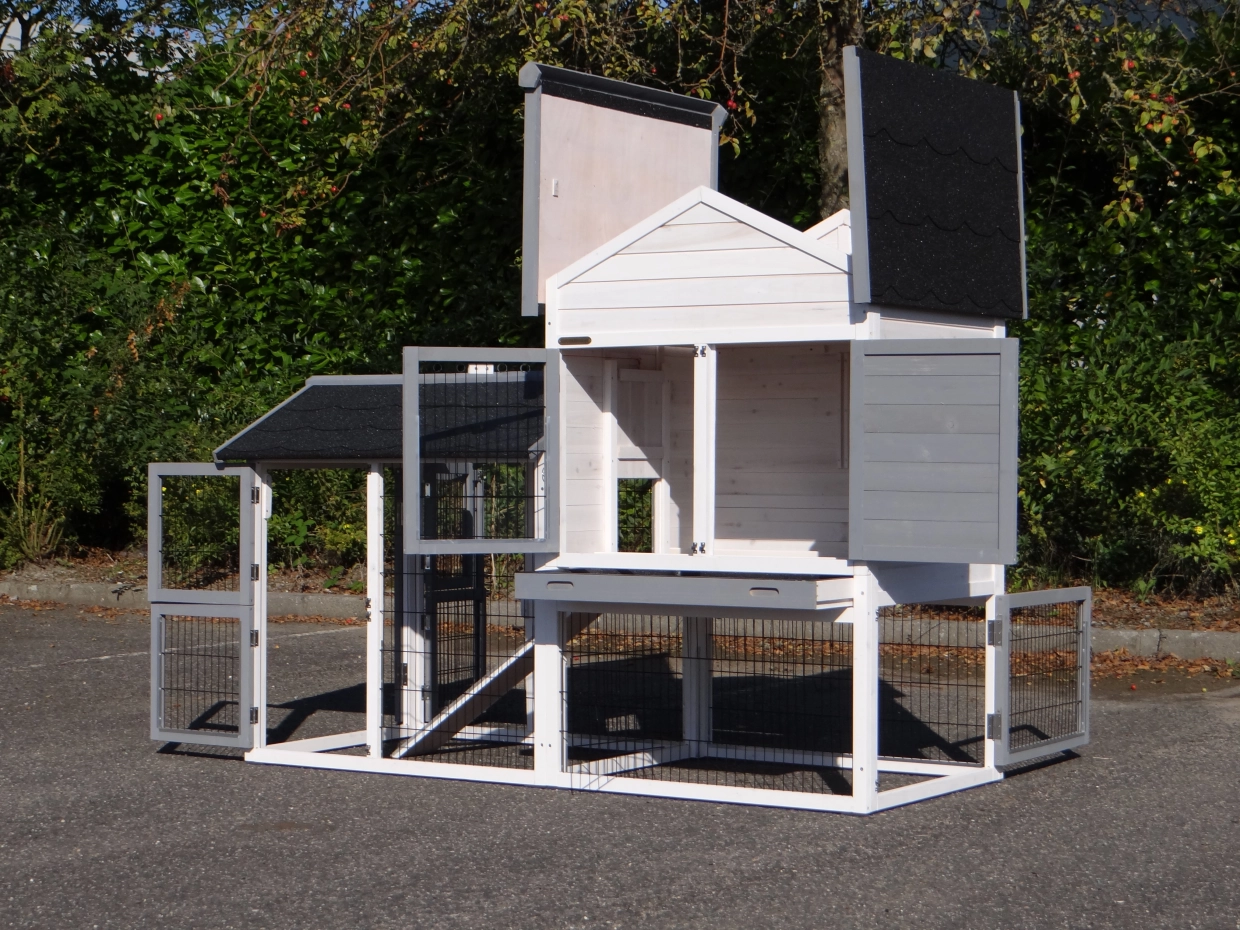 Ce poulailler est fini dans les moindres détails, avec plusieurs grandes portes, un tiroir à déjections coulissant, un abri nocturne spacieux et un grand enclos.