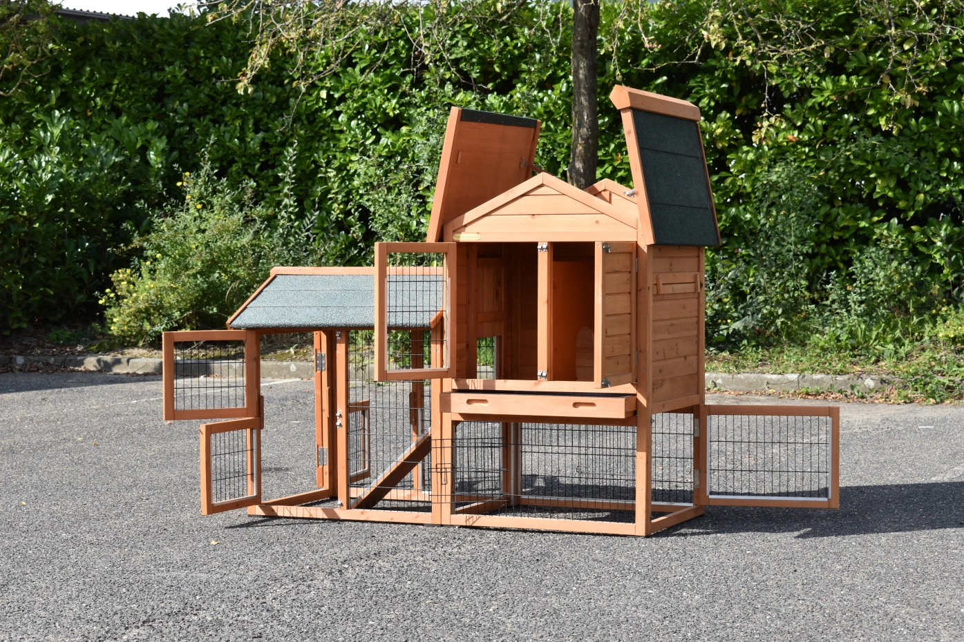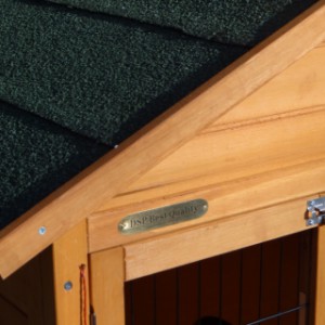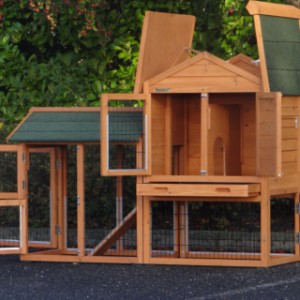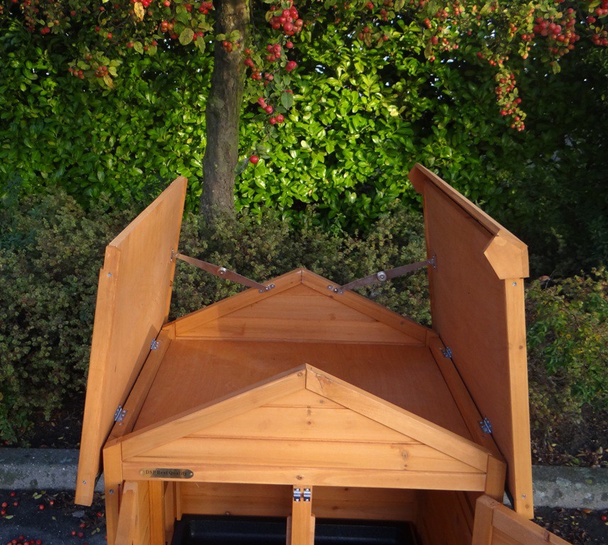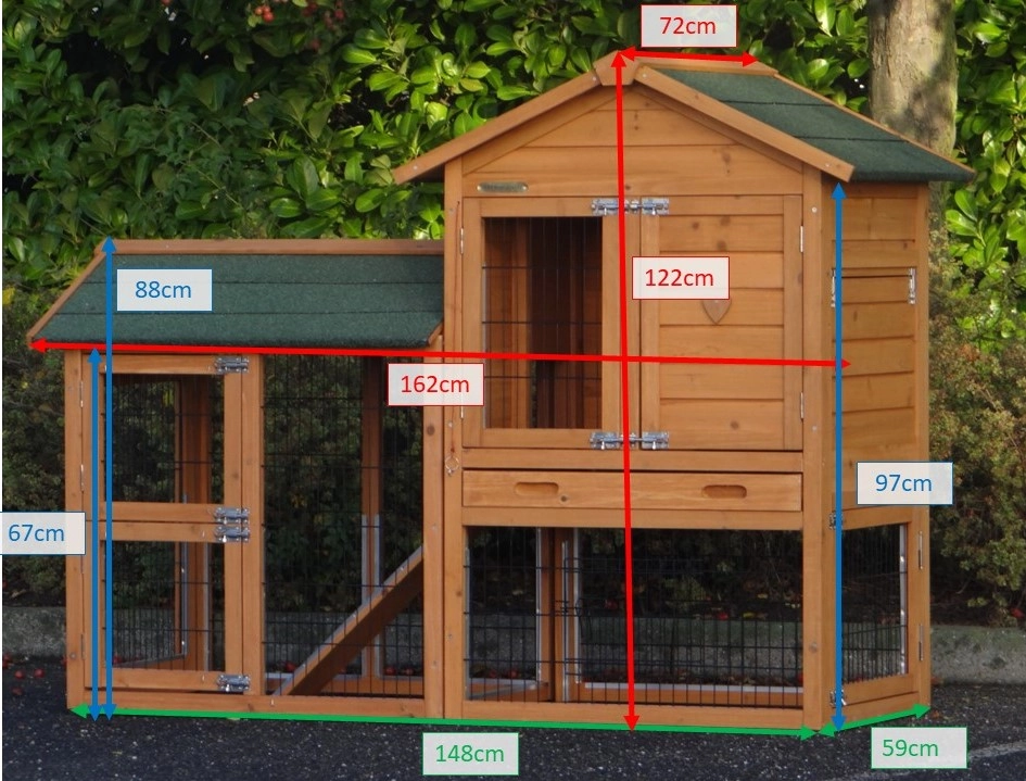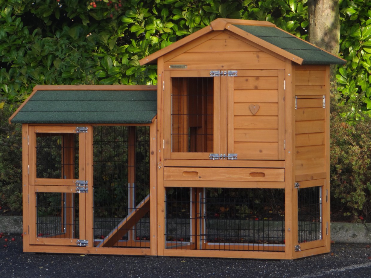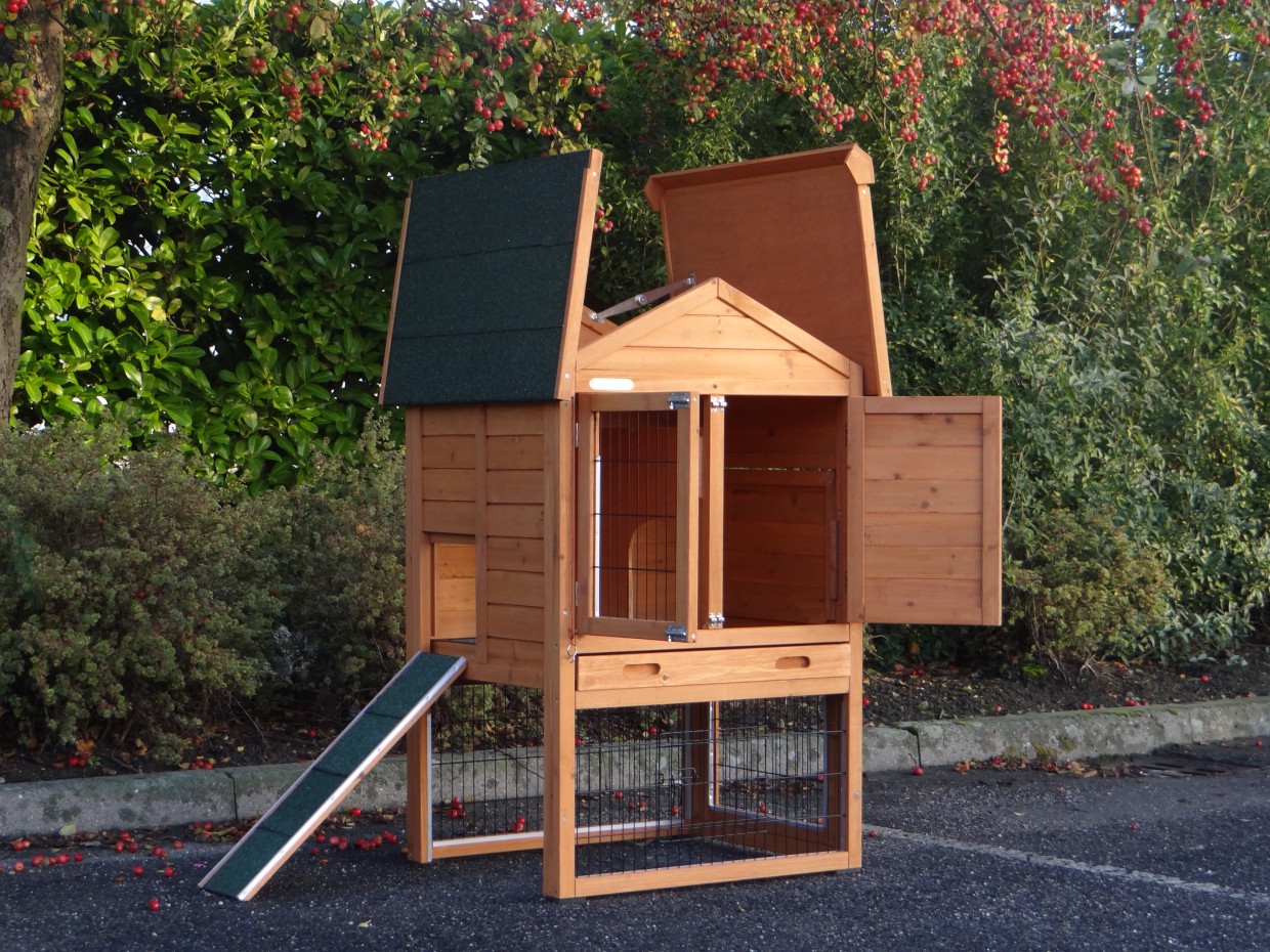Le bois utilisé pour le loft est un produit naturel unique qu'a été produit dans le pays d'origine, après une sélection rigoureuse, dans une manière traditionelle. C'est caractéristique et unique à tous égards. Ce produit en bois a été un traitement manuel. Aucune pièce de bois ne possède la même forme, la même structure ou la même couleur, de sorte que les nuances de couleur sont inévitables, même dans un morceau de bois. Les fissures dues au vent, les craquelures, les imperfections et la présence de gros et de petits noeuds témoignent de leur origine et de leurs années de croissance. Les bosses sont généralement mises à jour manuellement avec du bois. Grâce à leur utilisation et à l’influence de la lumière, les nouveaux maisons pour animaux auront une couleur plus chaude au fil du temps. Les différences de couleur au modèle d'exposition sont donc possibles. L'enclos pour animaux est munie d'un fini antitache dans les couleurs comme sur la photo. Vous devez encore décaper le bois pour éviter les moisissures et la pourriture. Vous pouvez facilement commander des taches directement.