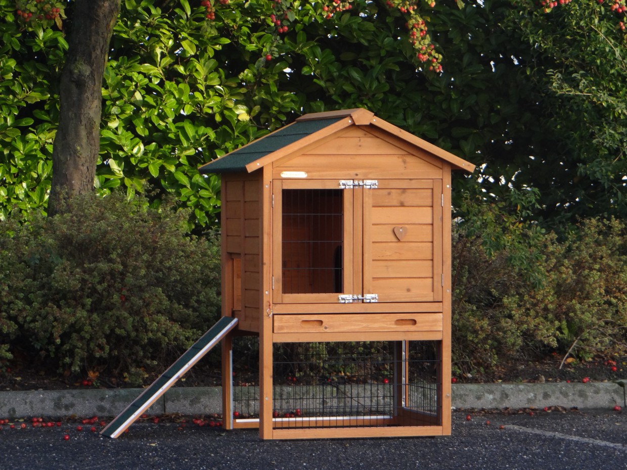 Le bois utilisé pour le loft est un produit naturel unique qu'a été produit dans le pays d'origine, après une sélection rigoureuse, dans une manière traditionelle. C'est caractéristique et unique à tous égards. Ce produit en bois a été un traitement manuel. Aucune pièce de bois ne possède la même forme, la même structure ou la même couleur, de sorte que les nuances de couleur sont inévitables, même dans un morceau de bois. Les fissures dues au vent, les craquelures, les imperfections et la présence de gros et de petits noeuds témoignent de leur origine et de leurs années de croissance. Les bosses sont généralement mises à jour manuellement avec du bois. Grâce à leur utilisation et à l’influence de la lumière, les nouveaux maisons pour animaux auront une couleur plus chaude au fil du temps. Les différences de couleur au modèle d'exposition sont donc possibles. L'enclos pour animaux est munie d'un fini antitache dans les couleurs comme sur la photo. Vous devez encore décaper le bois pour éviter les moisissures et la pourriture. Vous pouvez facilement commander des taches directement.